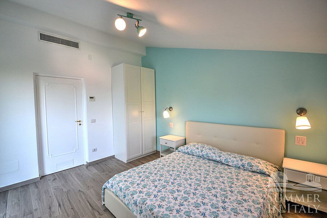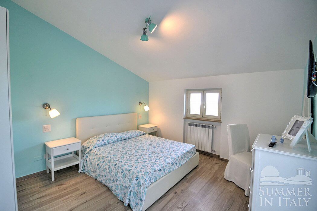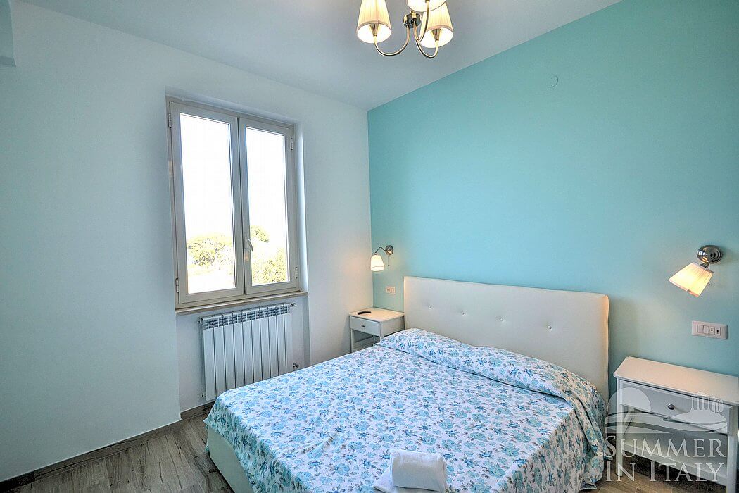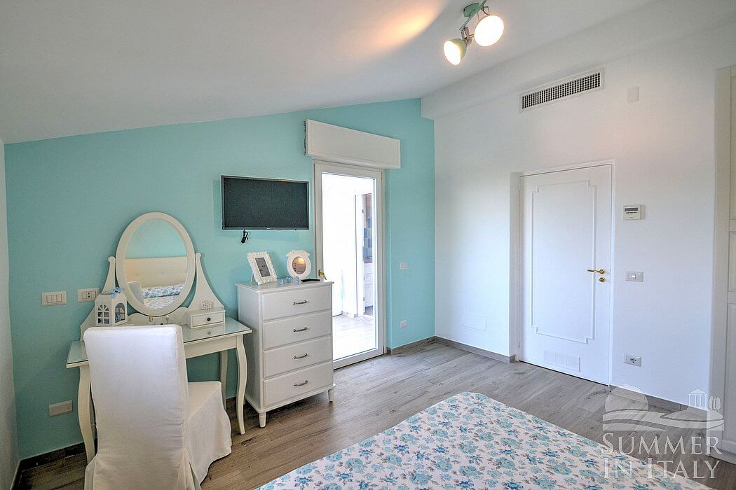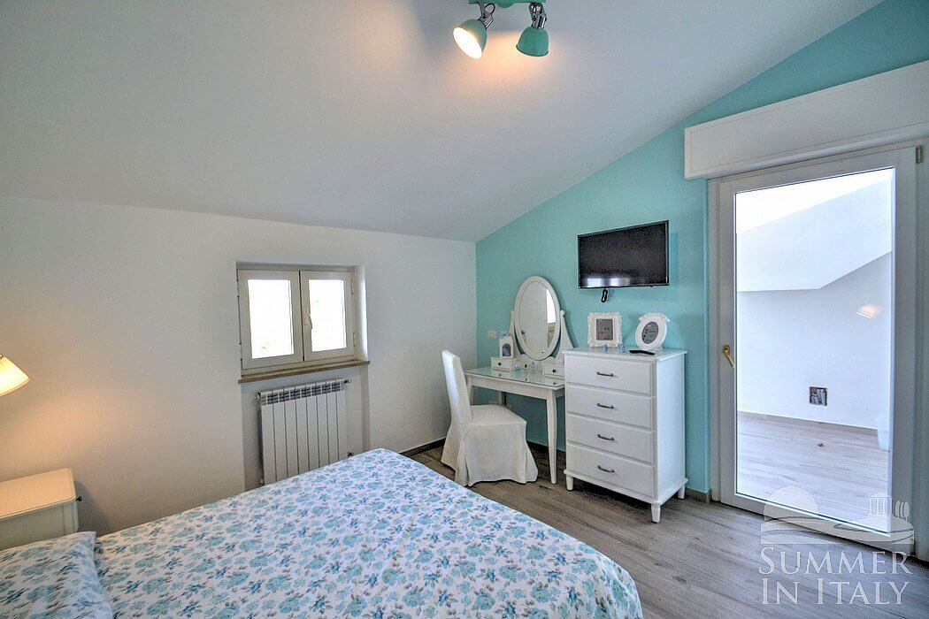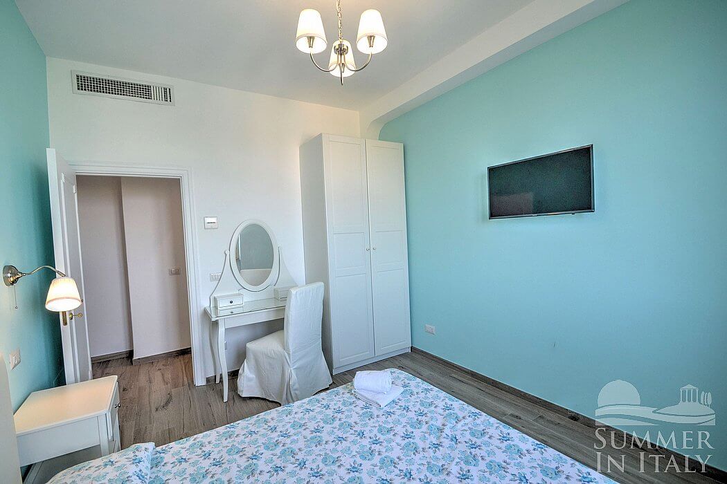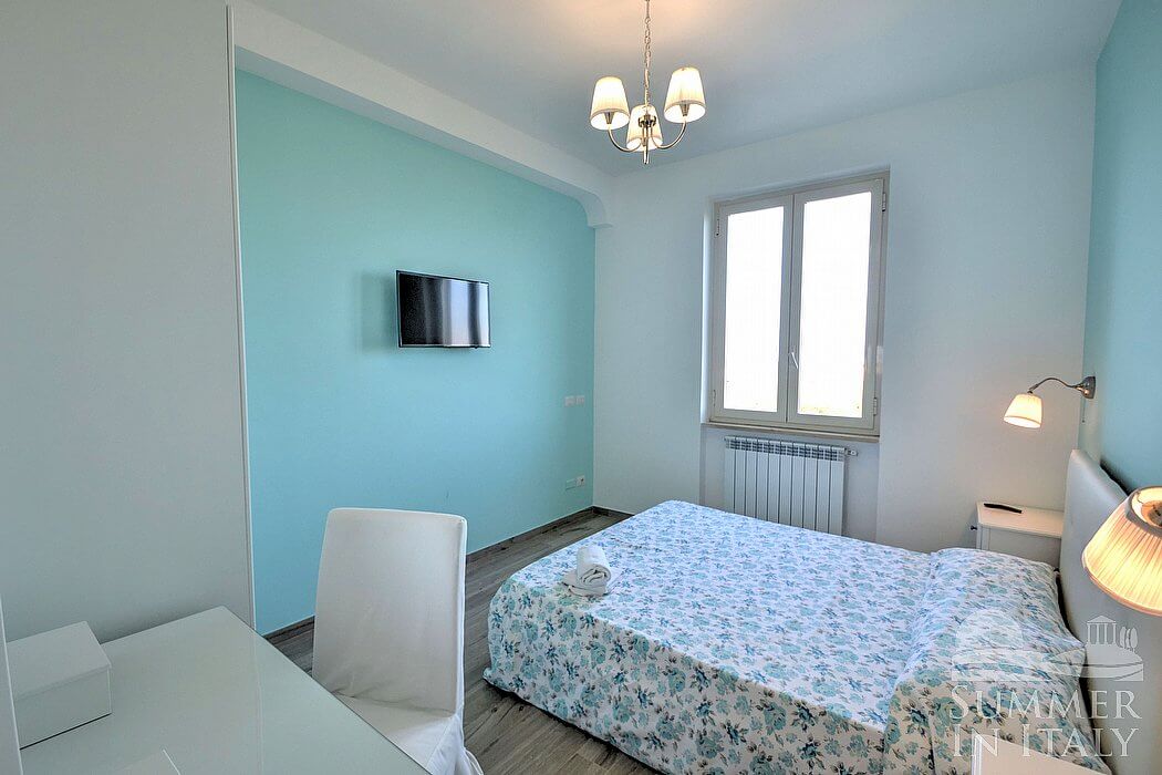 You will be able to enter the first bedroom from the living room. The bedroom has a matrimonial bed (160 cm/63 inches, wider than a queen-size bed). The furnishings include a bedroom chair. In this room you will find a television (local channels). From the bedroom you will be able to enter the terrace through a French door. The room also has a window with a partial view of the sea, and it's equipped with an air conditioning/heating unit.