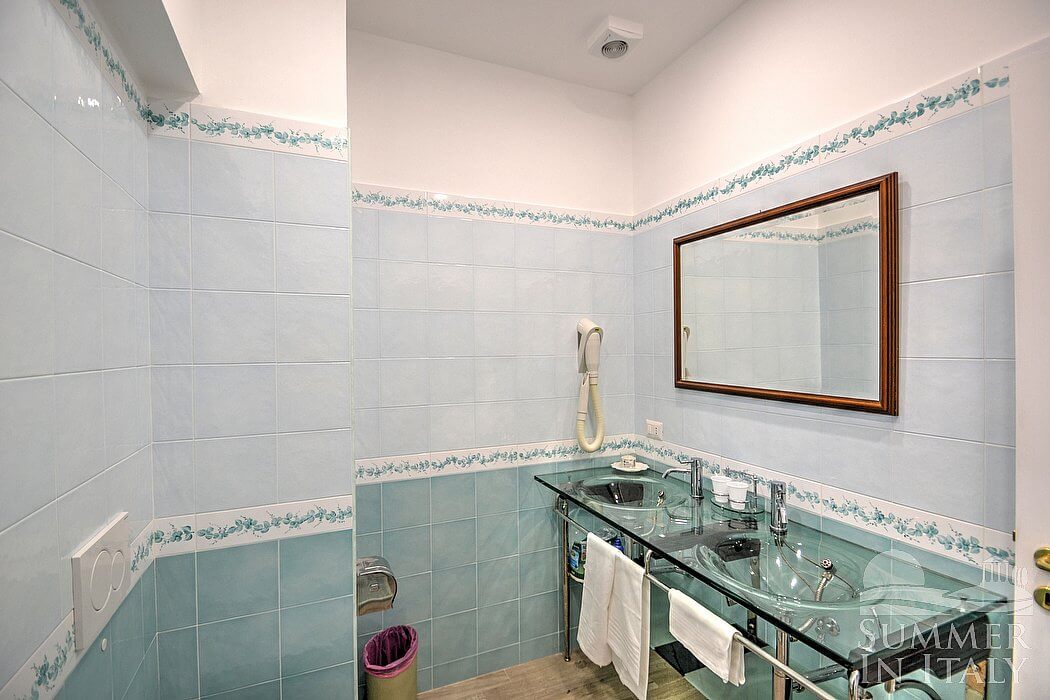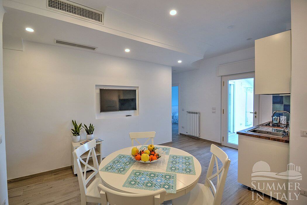 The living room is paved with wood. The furnishings are simple and comfortable. In the living room you will also find a cooking area. The kitchenette is equipped with a two-burner electric cooker, a refrigerator with freezer and an Italian-style coffee-maker. The dining table can accommodate four guests. In this room you will find a television (local channels) and a CD player. From the living room you will be able to enter the terrace through a French door. The room is equipped with an air conditioning/heating unit.