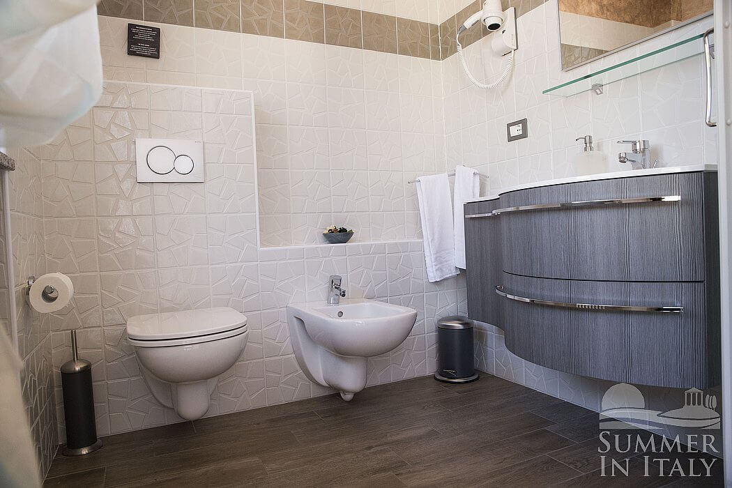 The terrace is 50 square meters (540 square feet) large. It is equipped with tables, chairs, two sun umbrellas, deck chairs, two sun loungers and a swing. From the terrace you will enjoy a characteristic view of the Monticello d'Alba village and castle. You will share the terrace with the other guests staying at the complex.