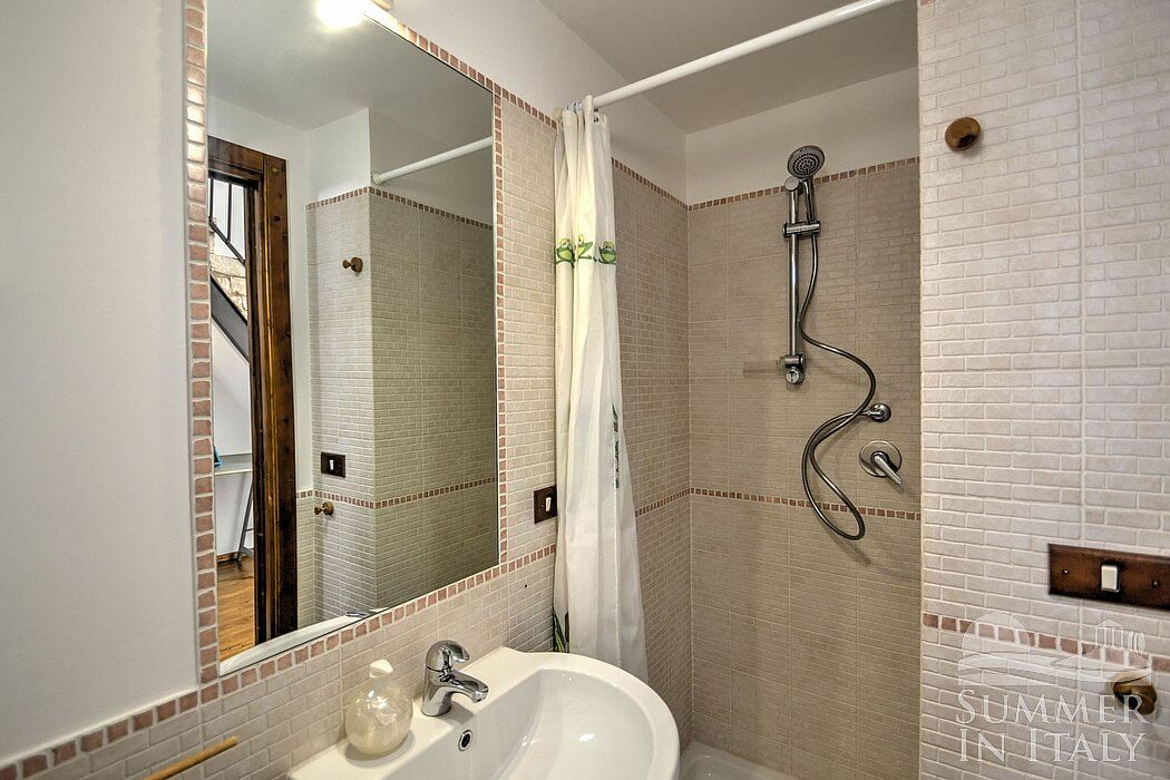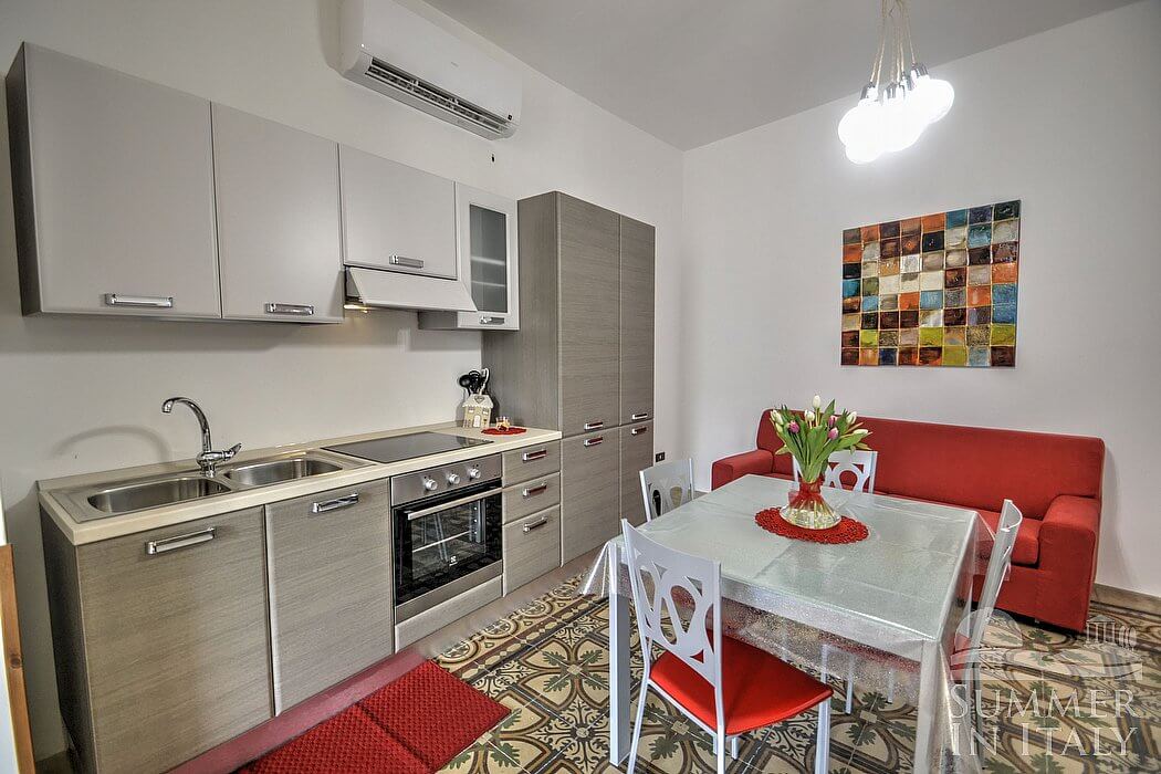 The living room is paved with original majolica tiles. The furnishings are simple and comfortable. The furnishings include a divan that unfolds into a double bed. There is a small fireplace. In the living room you will also find a cooking area. The kitchenette is equipped with a four-burner electric cooker, an electric oven, a refrigerator with freezer, a microwave oven, an Italian-style coffee-maker and other small appliances. The dining table can accommodate four guests. In this room you will find a television (local channels). From the living room you will be able to enter the small balcony with a view of the courtyard and of the surrounding houses through a French door. The room is equipped with an air conditioning/heating unit.