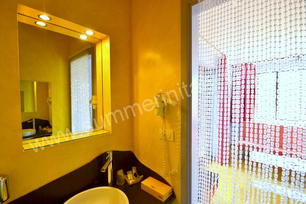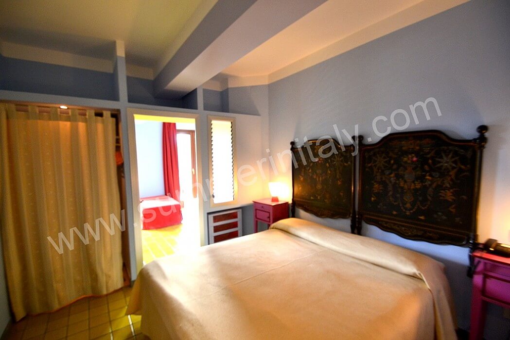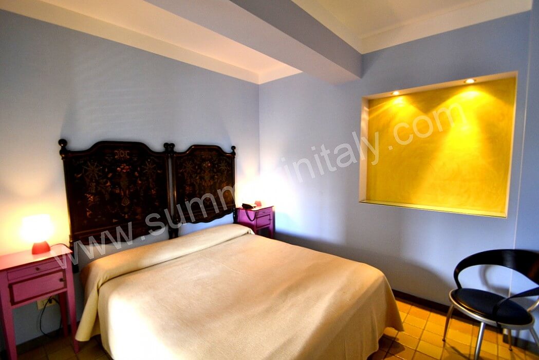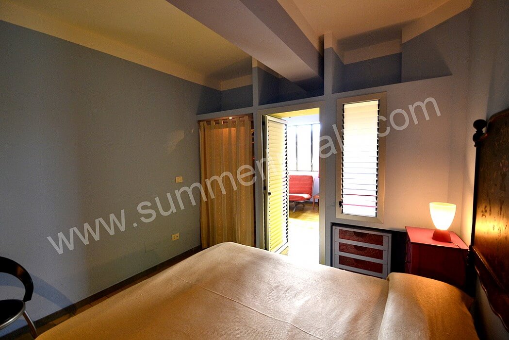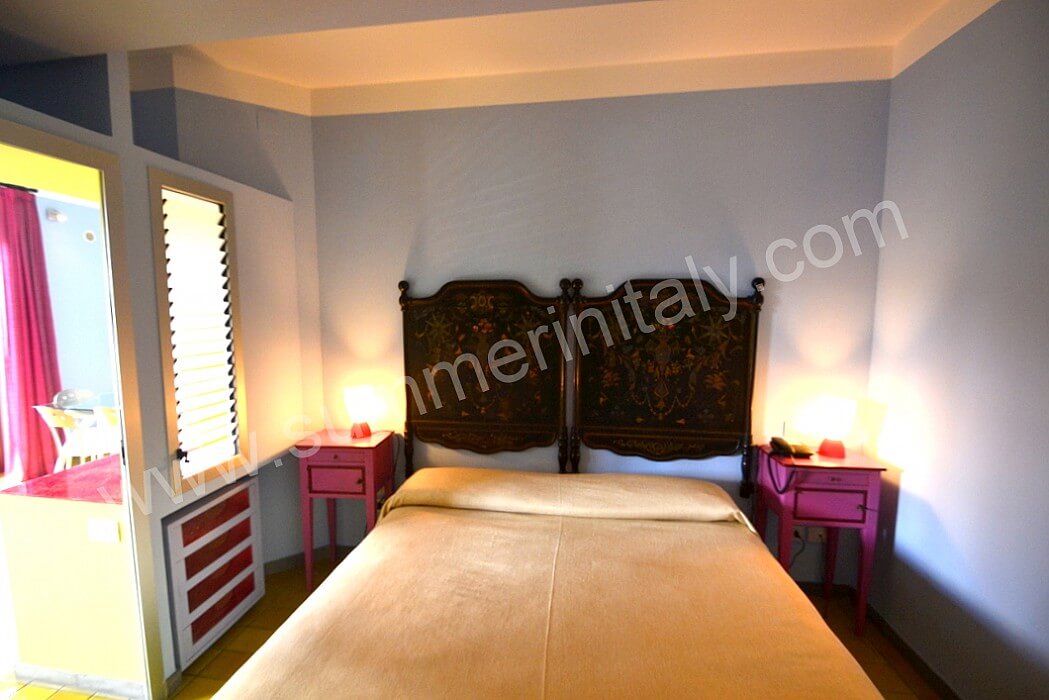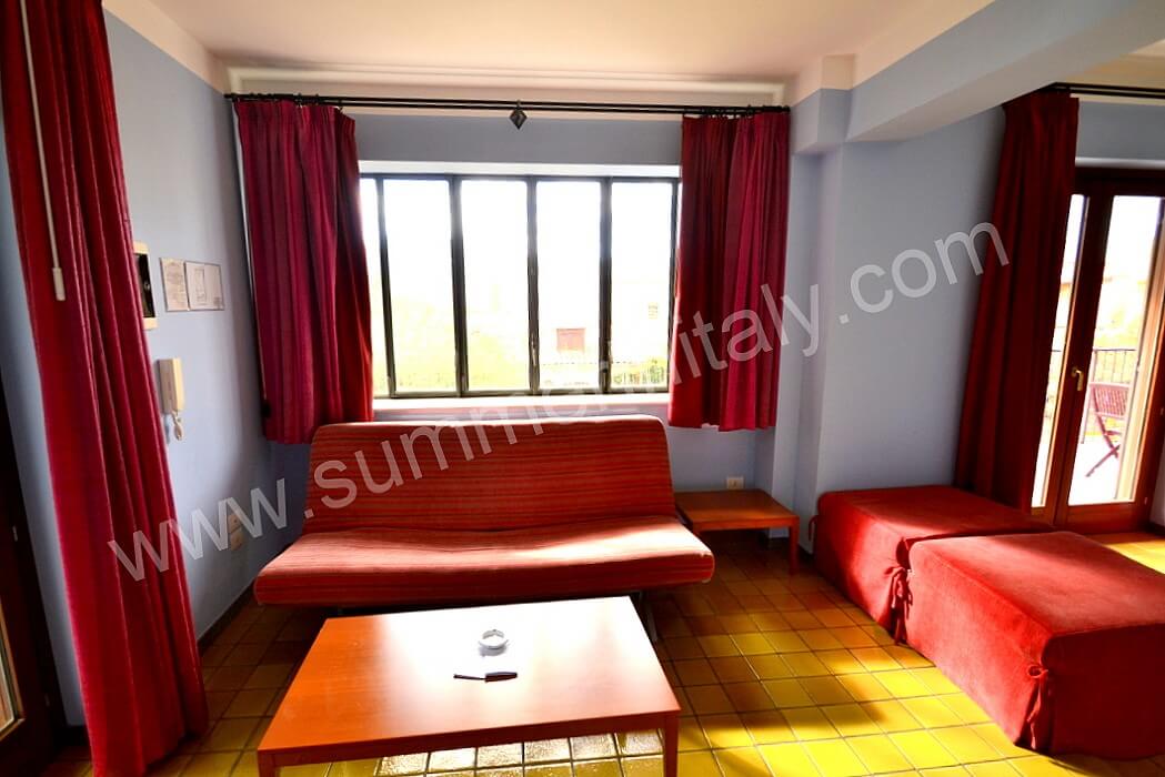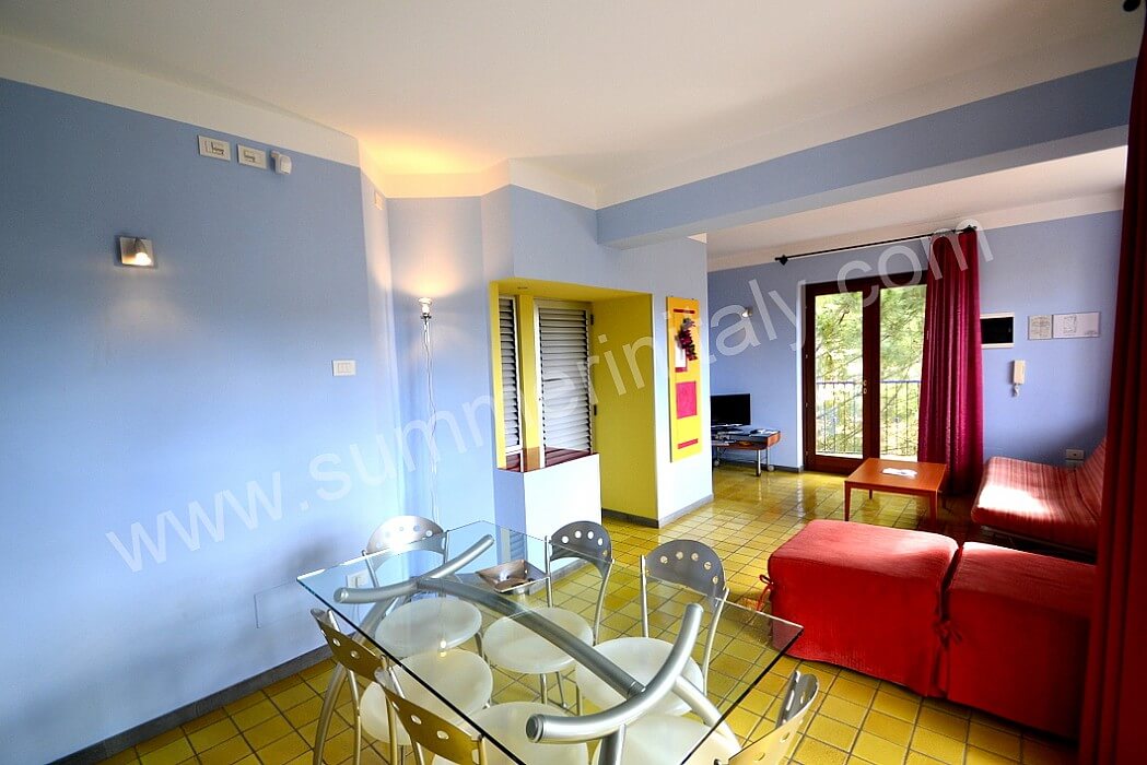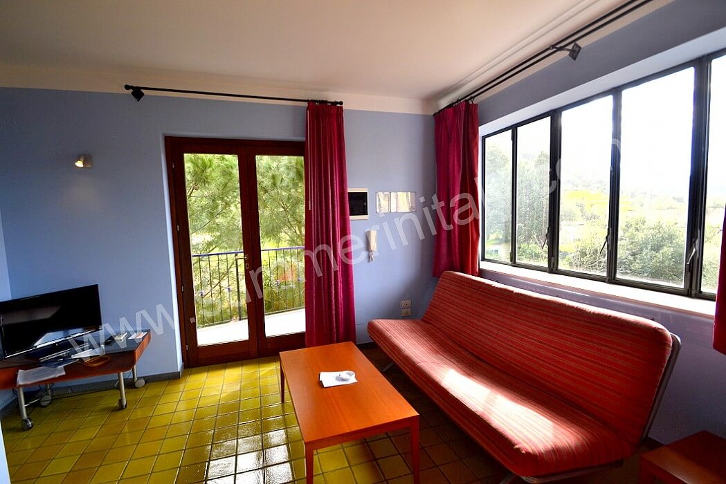 The furnishings of the living room are modern and comfortable. The furnishings include a divan bed for one guest. In the living room you will also find a cooking area. The kitchenette is equipped with a four-burner gas cooker, a small refrigerator with freezer, an Italian-style coffee-maker and other small appliances. The dining table can accommodate six guests. In this room you will find a television (local channels). From the living room you will be able to enter the terrace through two double-glazed French doors. The room also has a double-glazed large panoramic window with a view of greenery and of the surrounding houses. It is equipped with an air conditioning/heating unit.