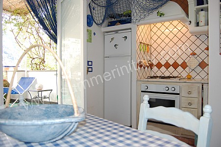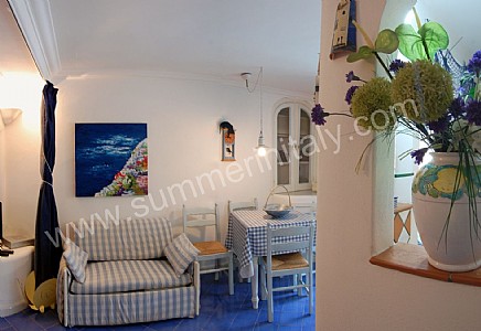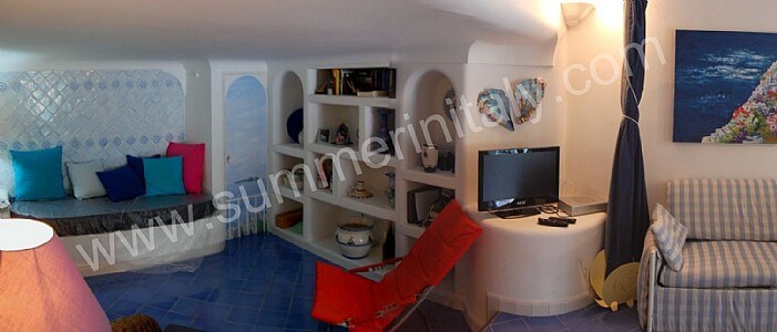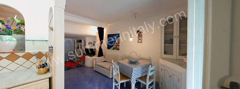 You will be able to enter the living room from the corridor. The floor is paved with handmade tiles, in the characteristic style of the Amalfi Coast. The furnishings are simple and comfortable. The furnishings include two sofas and a divan bed for one guest. In the living room you will also find a cooking area. The kitchenette is equipped with a four-burner gas cooker, a gas oven, a refrigerator with freezer, a dishwasher and an Italian-style coffee-maker. The dining table can accommodate four guests. In this room you will find a television (local channels). From the living room you will be able to enter the terrace with a view of the sea and of Positano through a French door. The room is equipped with an air conditioning unit.