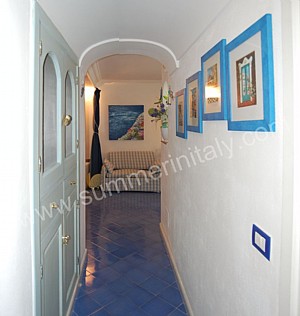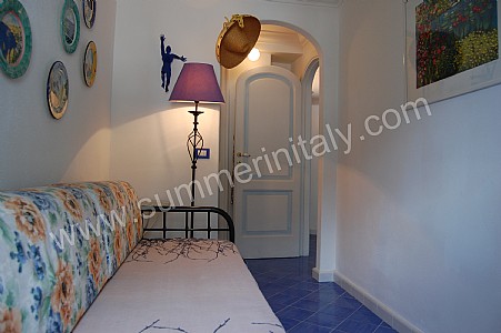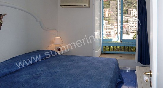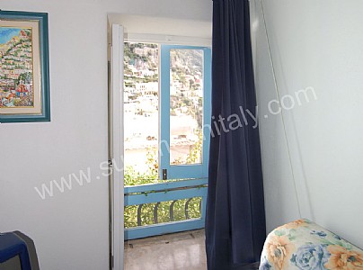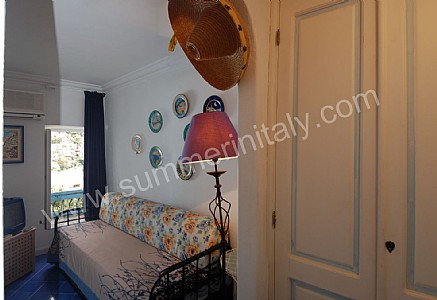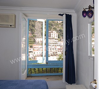 You will be able to enter the first bedroom from the corridor. The furnishings are simple and comfortable. The room has a matrimonial bed (160 cm/62 inches, wider than a queen-size bed). The room has a window with a view of the sea and of Positano. The bedroom is equipped with an air conditioning unit.