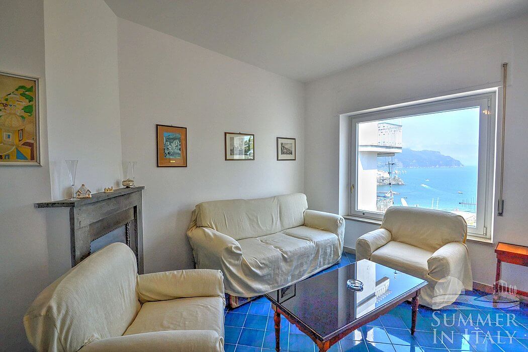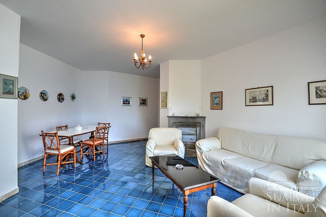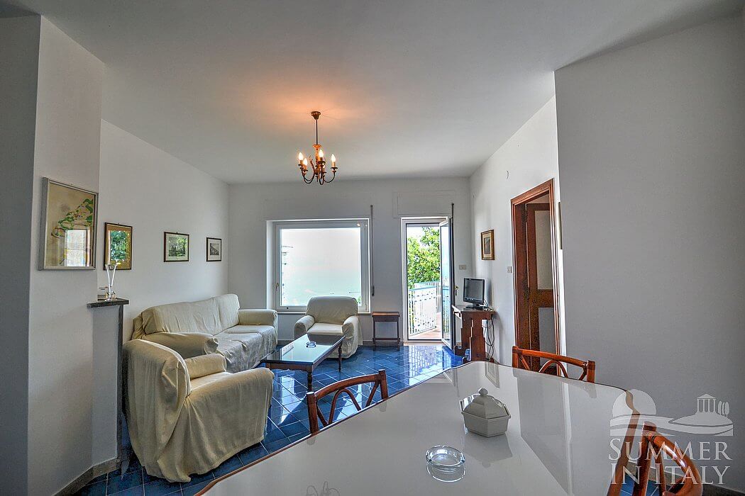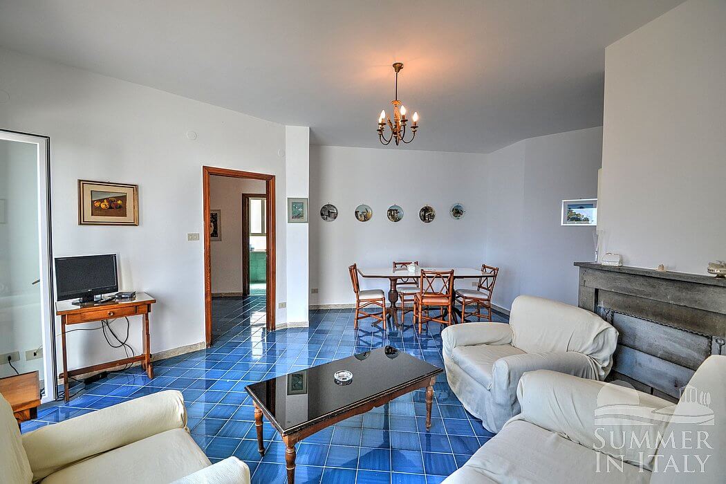 The living room is paved with lucid blue majolica tiles. The furnishings are simple and comfortable. The furnishings include a sofa and two armchairs. There is a fireplace, for decorative purposes only. The dining table can accommodate four guests. In this room you will find a satellite television (local channels). From the living room you will be able to enter the terrace with a view of the sea and of the coast of Amalfi through a French door. The room also has a window.
