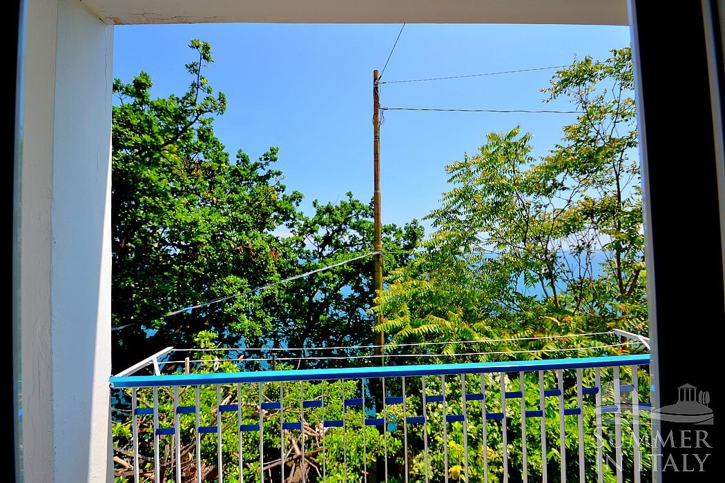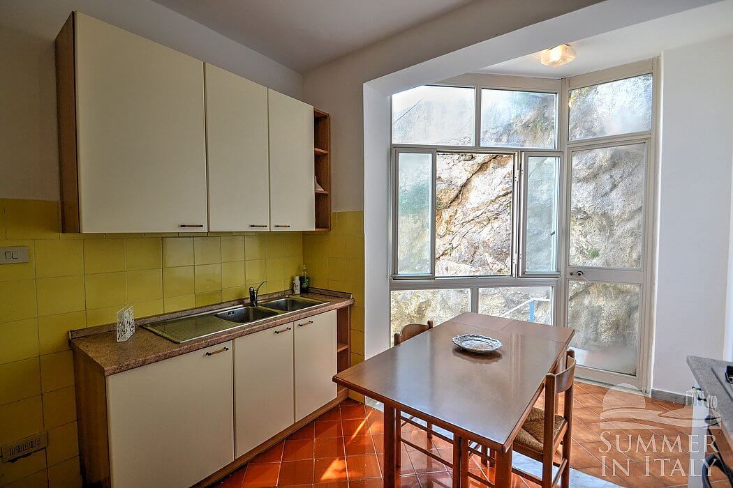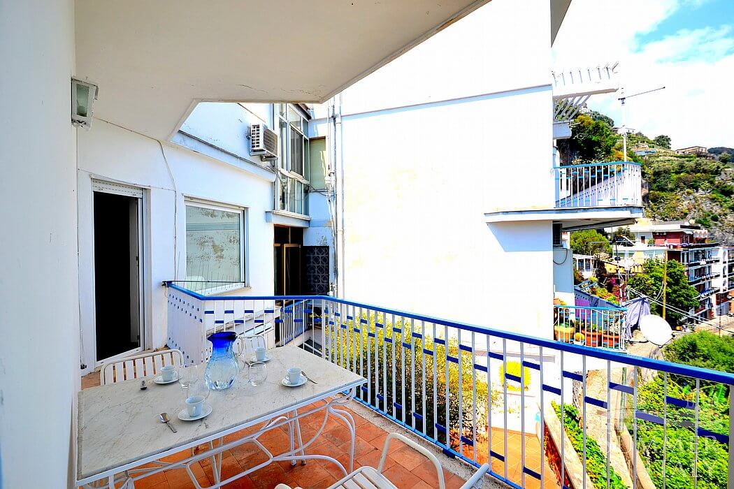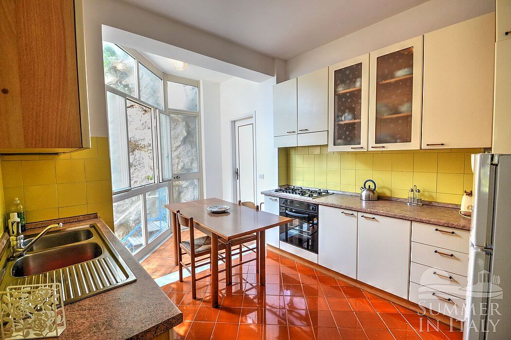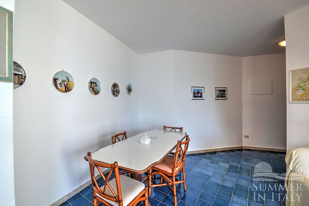 The living room is paved with lucid blue majolica tiles. The furnishings are simple and comfortable. The furnishings include a sofa and two armchairs. There is a fireplace, for decorative purposes only. The dining table can accommodate four guests. In this room you will find a satellite television (local channels). From the living room you will be able to enter the terrace with a view of the sea and of the coast of Amalfi through a French door. The room also has a window.