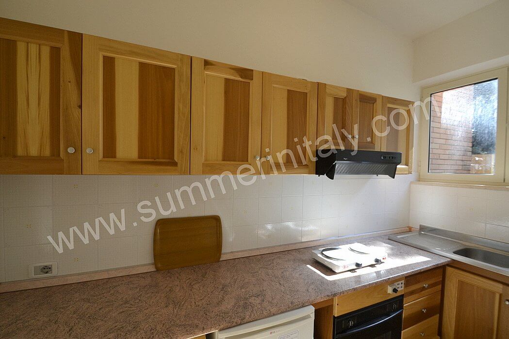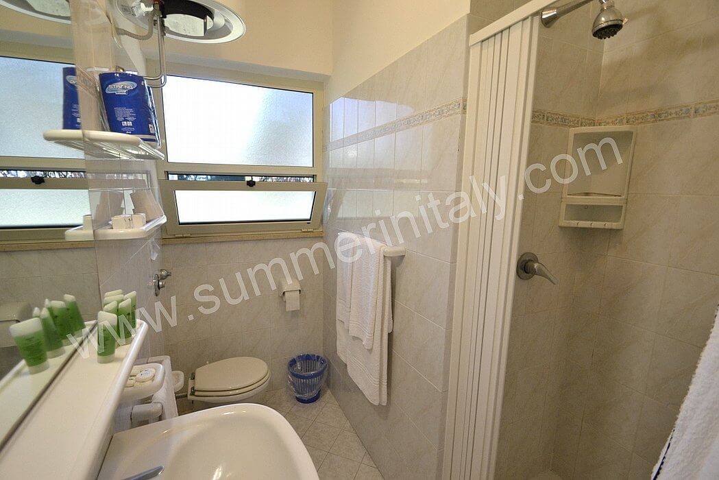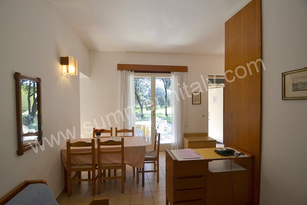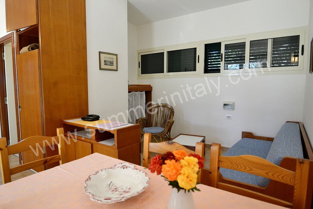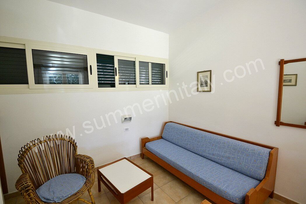 The furnishings of the living room are simple and comfortable. The furnishings include a divan that unfolds into a double bed and a desk. In the living room you will also find a cooking area. The kitchenette is equipped with a two-burner electric cooker, an electric oven, a small refrigerator with freezer and an Italian-style coffee-maker. The dining table can accommodate six guests. From the living room you will be able to enter the patio through a double-glazed French door. The room also has three small windows with a view of the garden.