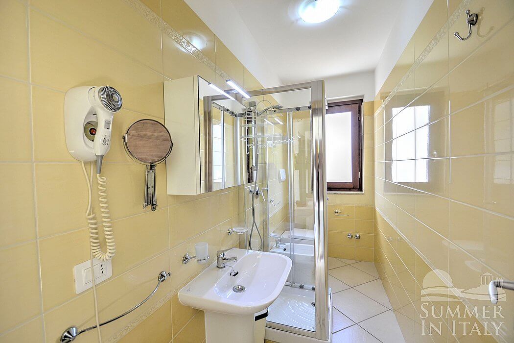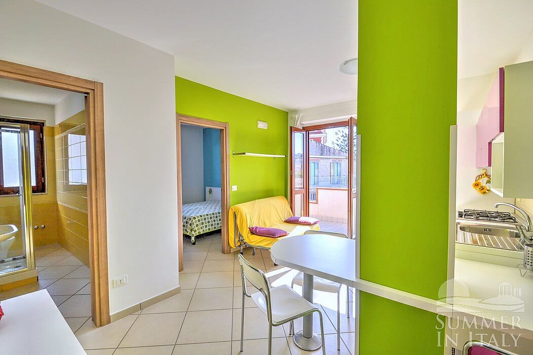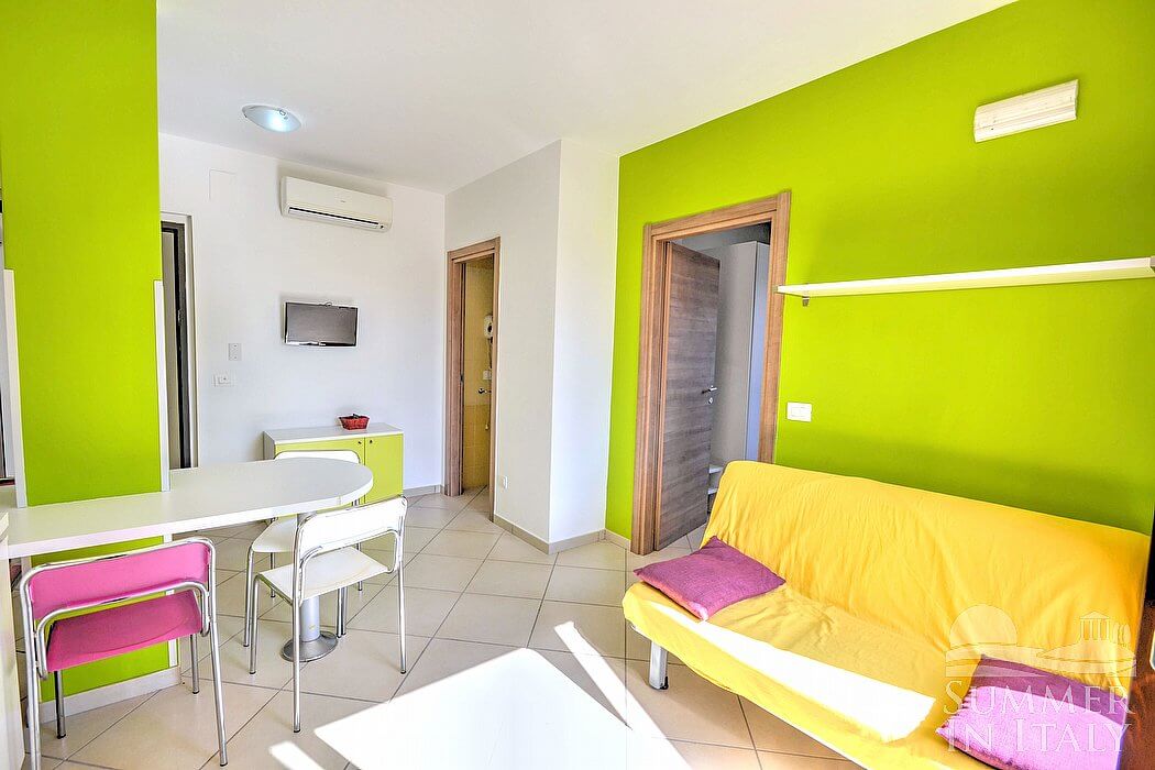 The furnishings of the living room are modern and welcoming. The furnishings include a divan that unfolds into a double bed. In the living room you will also find a cooking area. The kitchenette is equipped with a four-burner gas cooker, a refrigerator with freezer, an Italian-style coffee-maker and other small appliances. The dining table is a little kitchen peninsula, and can accommodate four guests. In this room you will find a satellite television (local channels). From the living room you will be able to enter the terrace through a French door. The room is equipped with an air conditioning/heating unit.