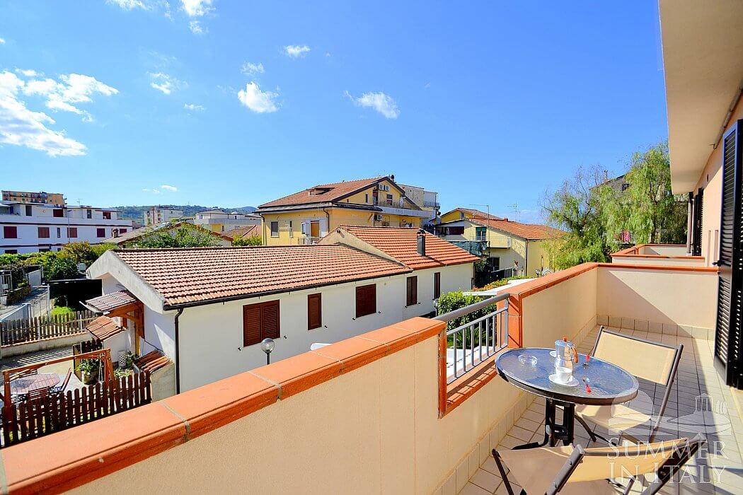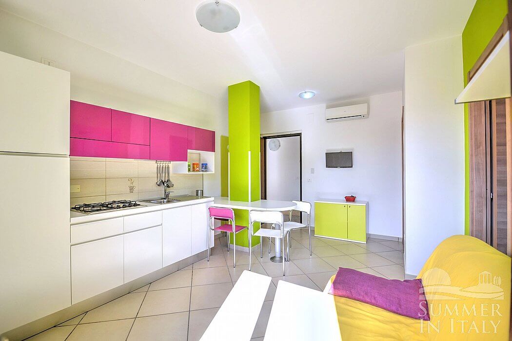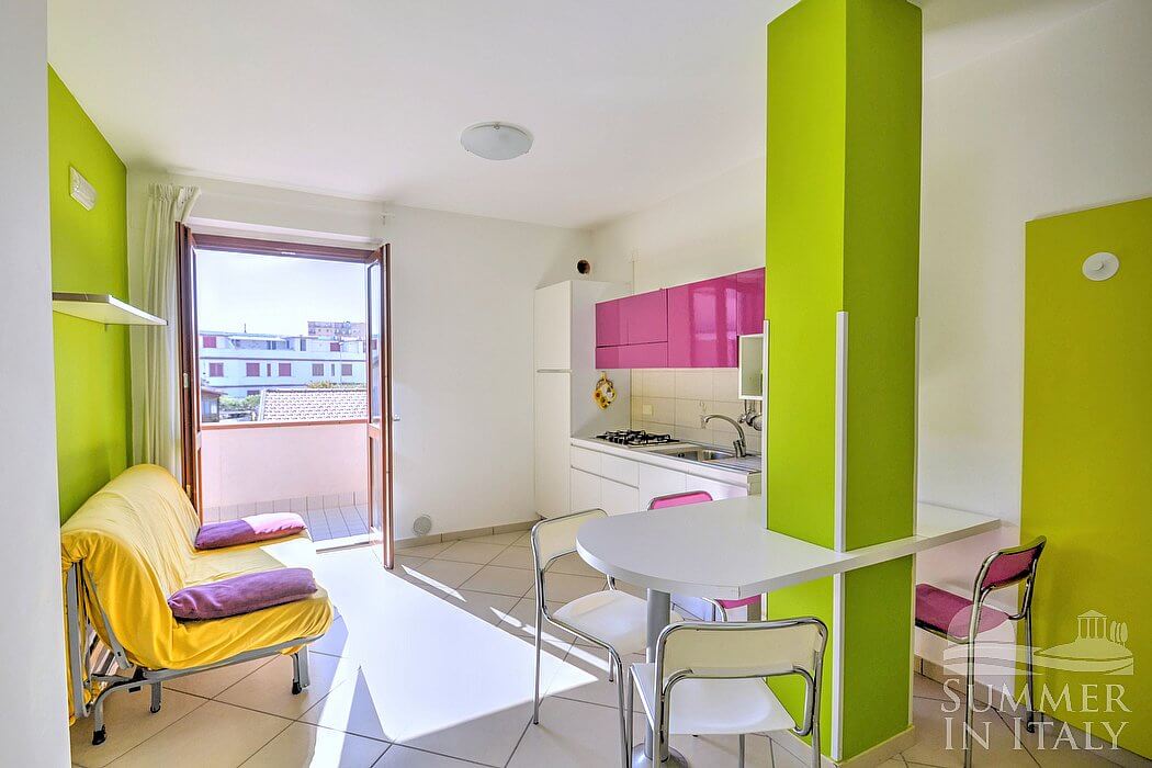 Casa Pesca C is a modern and graceful apartment situated at a few steps from a sandy beach. It sleeps four people. From Casa Pesca C you will have a view of the surrounding buildings. Casa Pesca C is 40 square meters (430 square feet). It features a private terrace, air conditioning (please read description below to check in which rooms the units are installed), winter heating and WI-FI Internet access.
