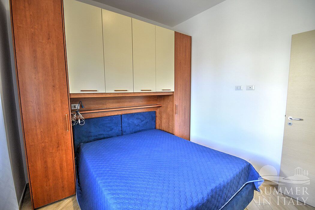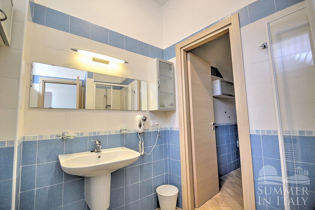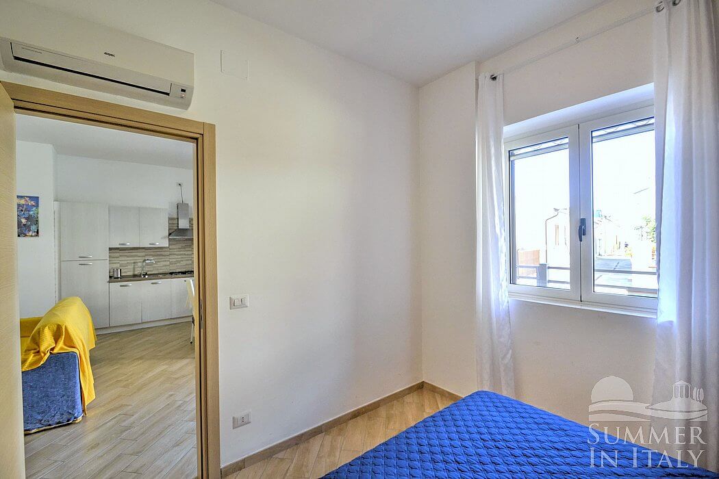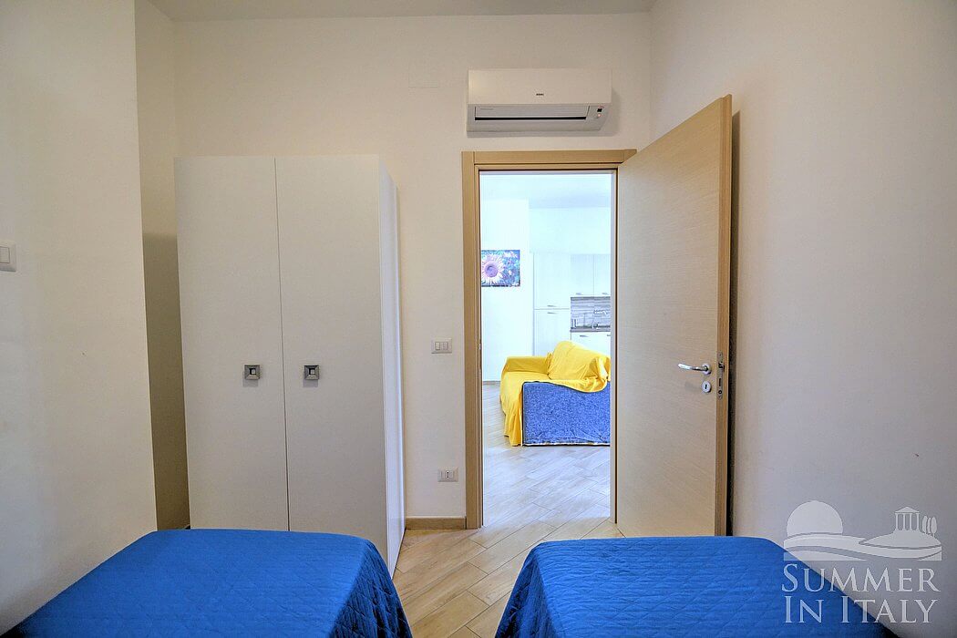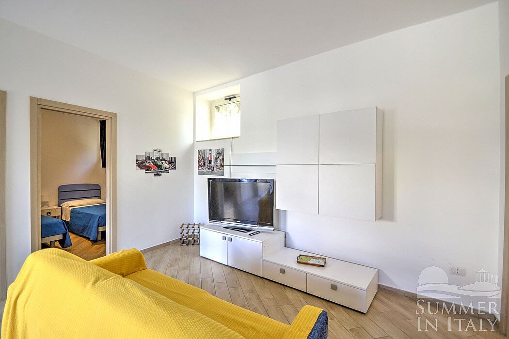 The furnishings of the living room are cozy and comfortable. The furnishings include a divan that unfolds into a double bed. In the living room you will also find a cooking area. The kitchenette is equipped with a four-burner gas cooker, an electric oven, a refrigerator with freezer, an Italian-style coffee-maker and other small appliances. The dining table can accommodate four guests. In this room you will find a satellite television (local channels). The room has a window, as well as a small high window. It is equipped with an air conditioning/heating unit.