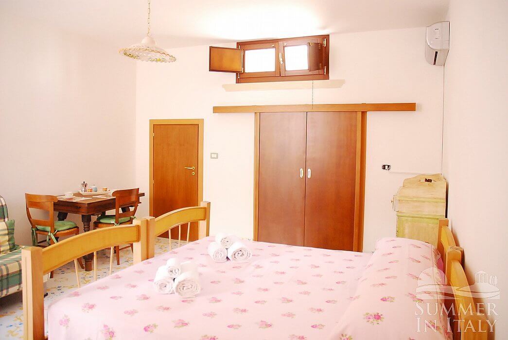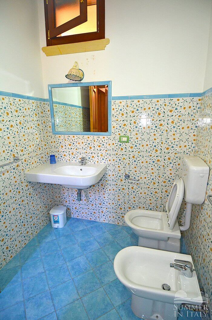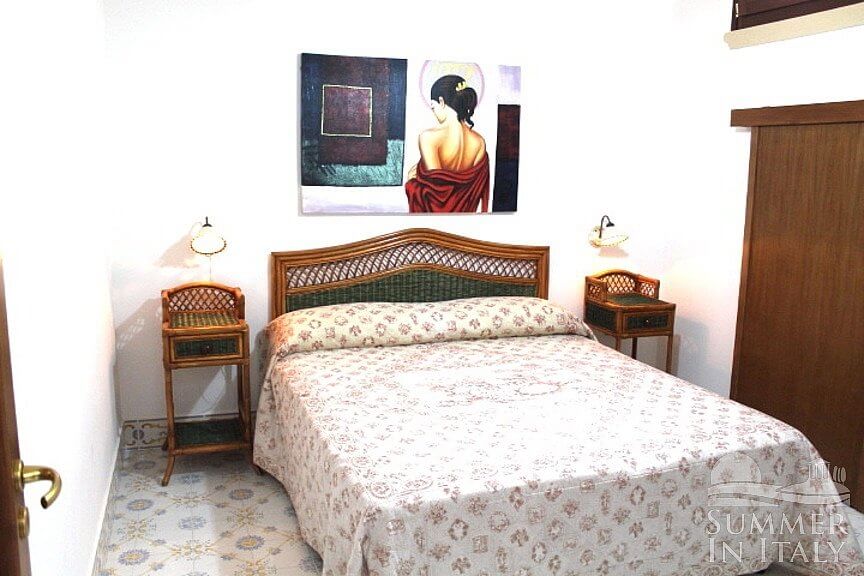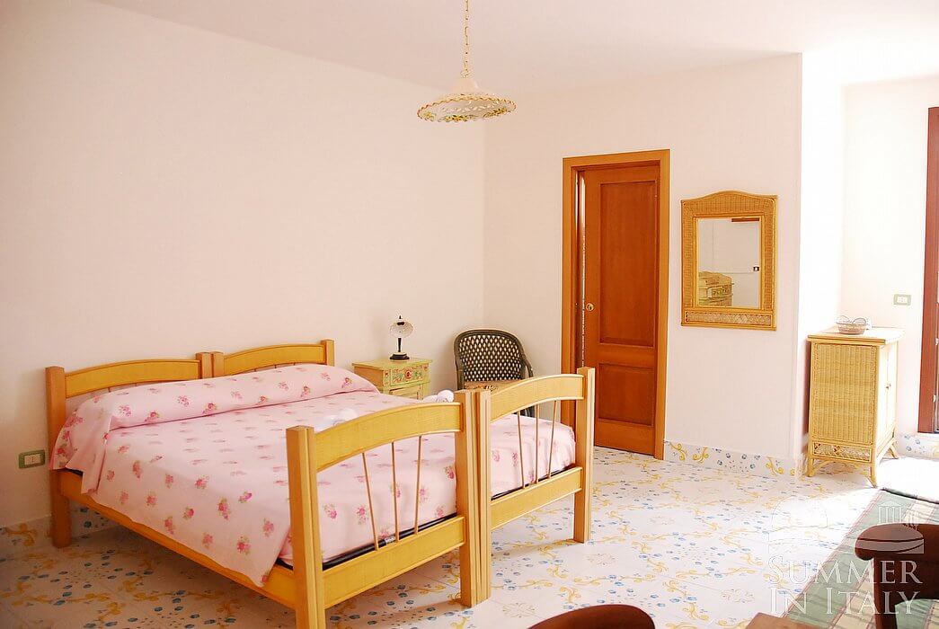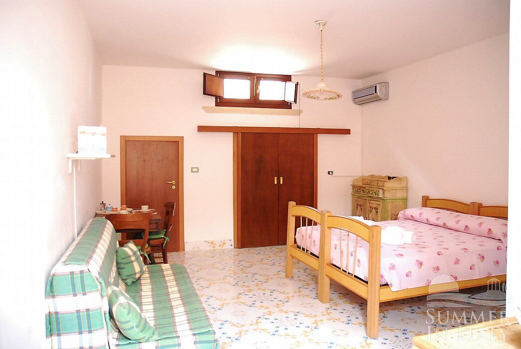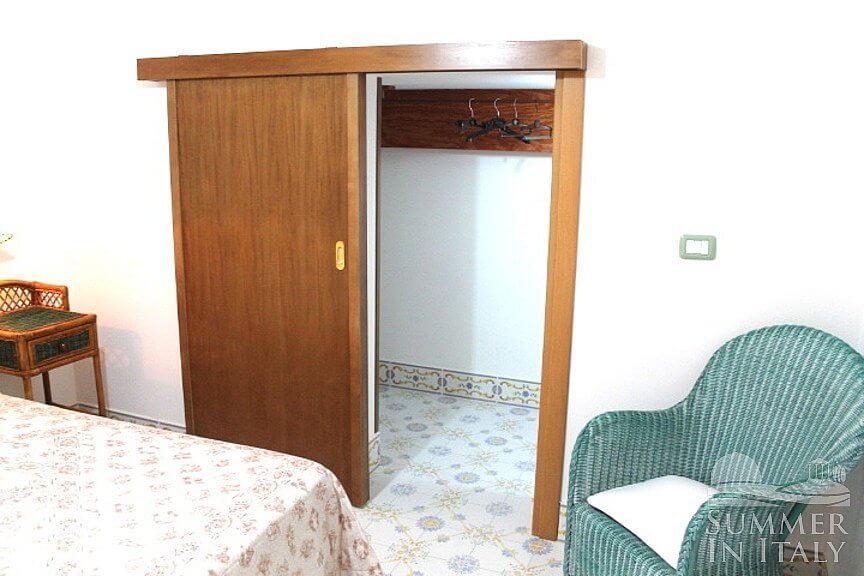 You will be able to enter the third bedroom from the patio going down ten steps. The floor is paved with characteristic majolica tiles. The furnishings are simple. The room has a matrimonial bed (160 cm/63 inches, wider than a queen-size bed), that can be split into twins if requested (please contact our staff in advance to make arrangements). The furnishings include a divan that unfolds into a double bed. There is also a cooking area. The kitchenette can be closed in a cupboard and is equipped with a four-burner gas cooker, an electric oven, a small refrigerator without freezer and an Italian-style coffee-maker. There is a table that can accommodate two guests. In this room you will find a satellite television (local channels). The room has a high window, and it's equipped with an air conditioning/heating unit. This bedroom has an en-suite bathroom, decorated with majolica tiles and equipped with a washbasin, a toilet, a fully enclosed shower and a hairdryer.