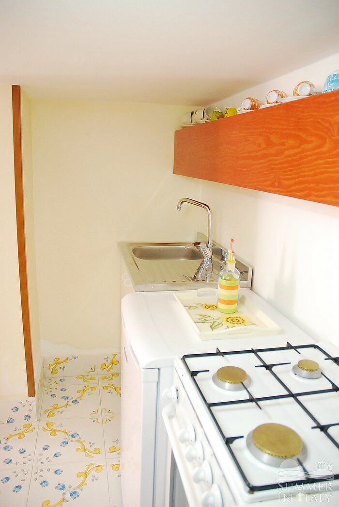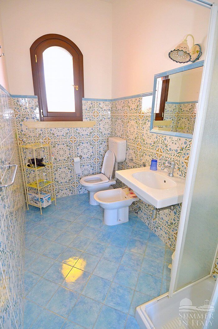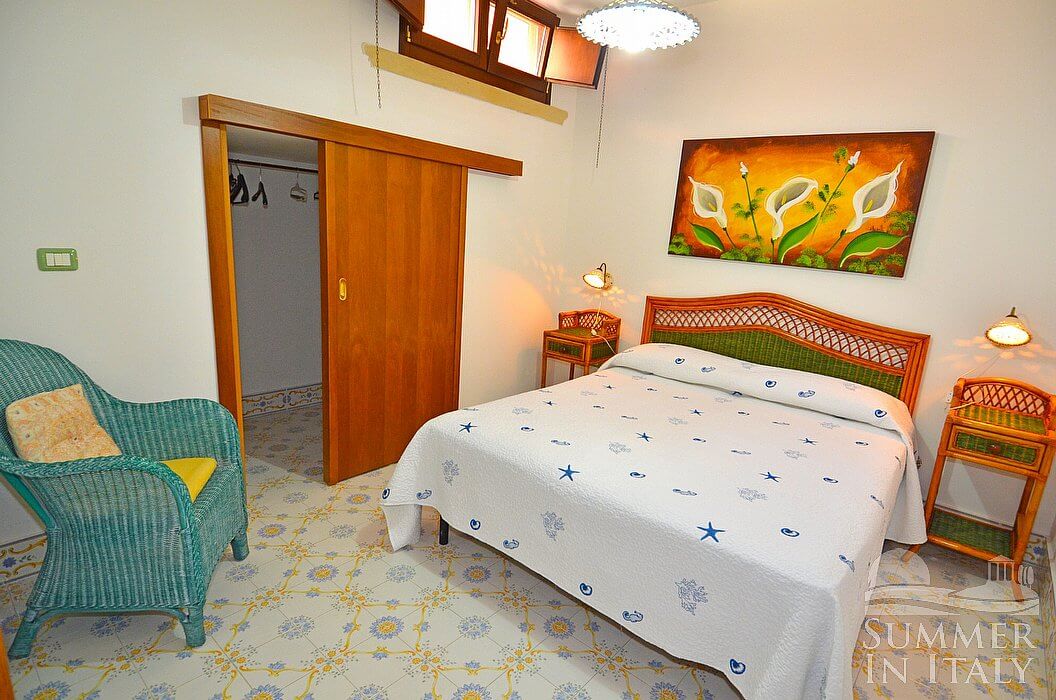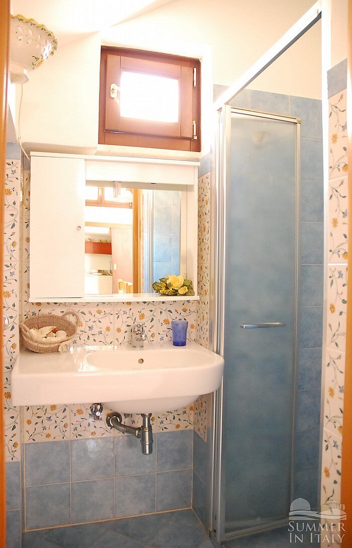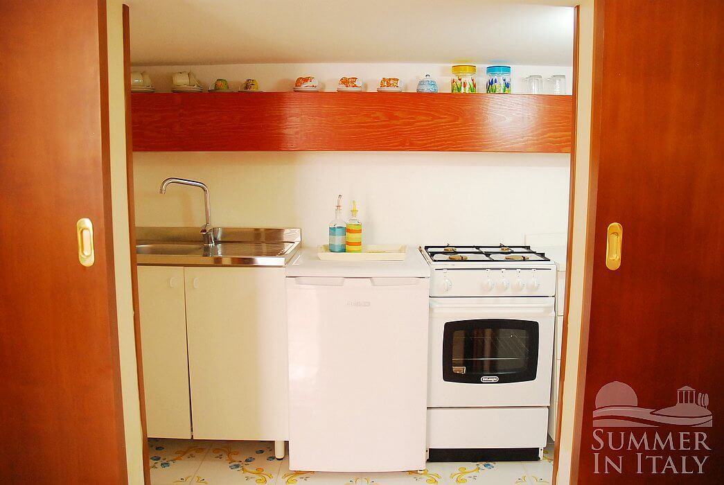 You will be able to enter the third bedroom from the patio going down ten steps. The floor is paved with characteristic majolica tiles. The furnishings are simple. The room has a matrimonial bed (160 cm/63 inches, wider than a queen-size bed), that can be split into twins if requested (please contact our staff in advance to make arrangements). The furnishings include a divan that unfolds into a double bed. There is also a cooking area. The kitchenette can be closed in a cupboard and is equipped with a four-burner gas cooker, an electric oven, a small refrigerator without freezer and an Italian-style coffee-maker. There is a table that can accommodate two guests. In this room you will find a satellite television (local channels). The room has a high window, and it's equipped with an air conditioning/heating unit. This bedroom has an en-suite bathroom, decorated with majolica tiles and equipped with a washbasin, a toilet, a fully enclosed shower and a hairdryer.