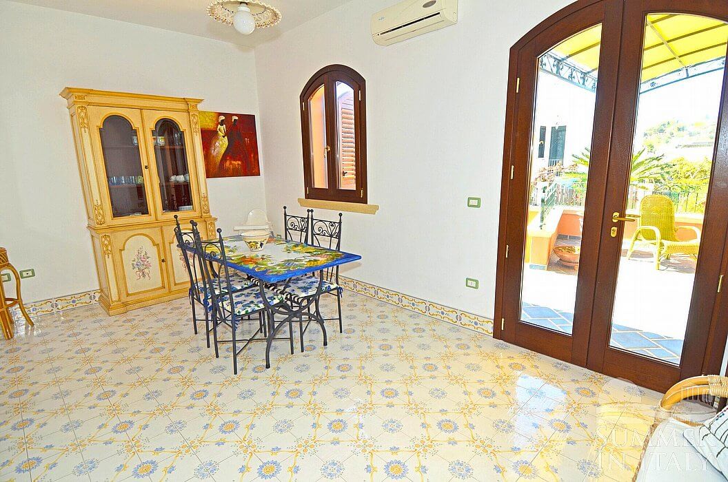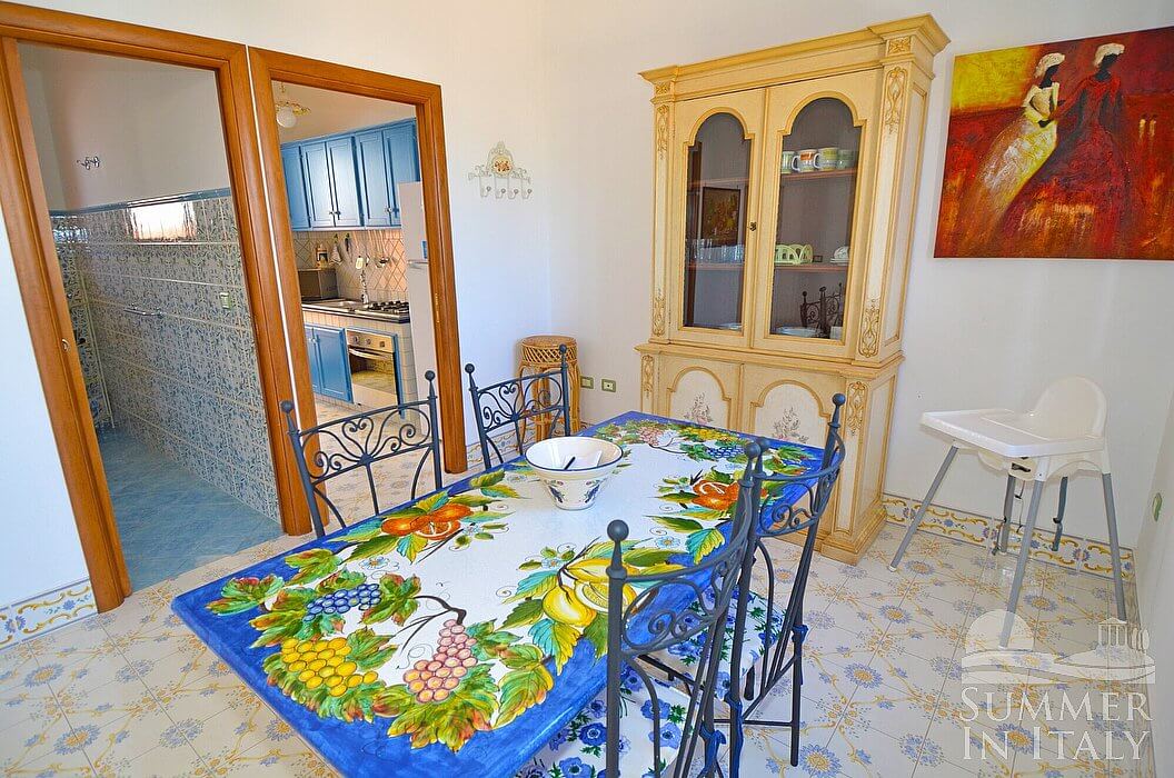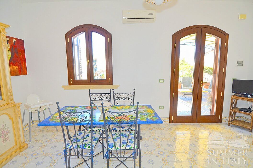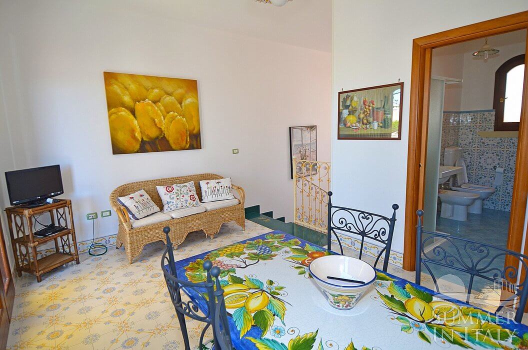 The living room is paved with characteristic majolica tiles. The furnishings are simple, and include a sofa. The dining table can accommodate four guests. In this room you will find a satellite television (local channels). From the living room you will be able to enter the first terrace through a French door. The room also has a window. It is equipped with an air conditioning/heating unit.