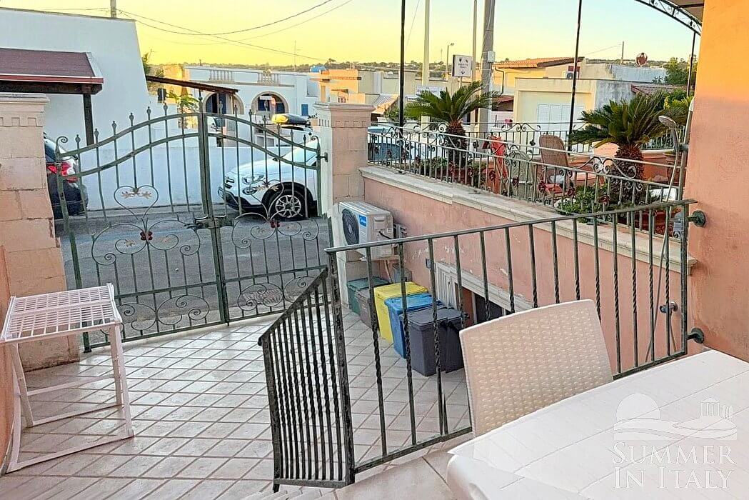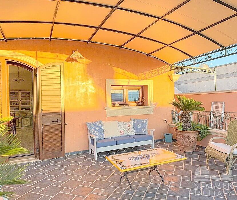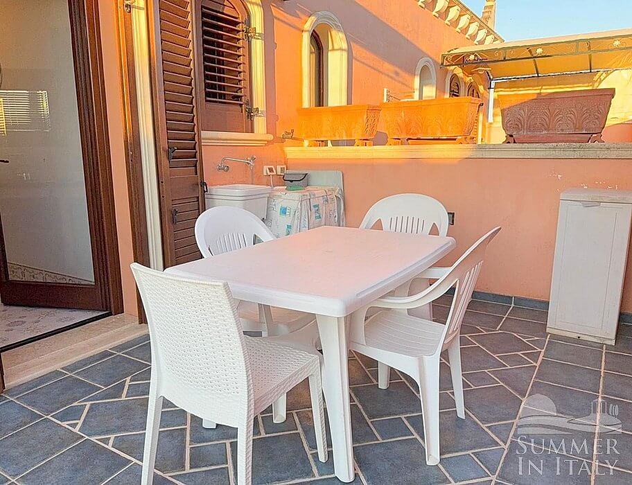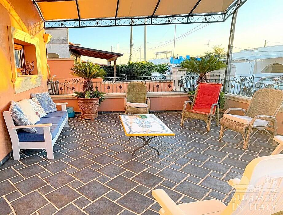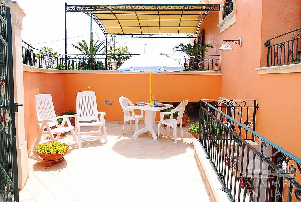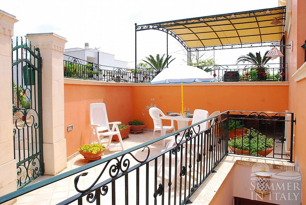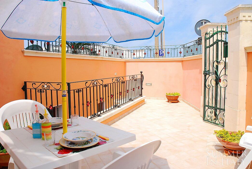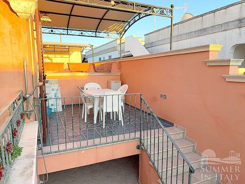 The second terrace is 10 square meters (107 square feet) large. It is partly shaded by a characteristic pergola. It is equipped with a table, chairs and an external shower. Here you will find also a washing machine at your disposal. From the terrace you will have a view of the surrounding buildings and of the street below.