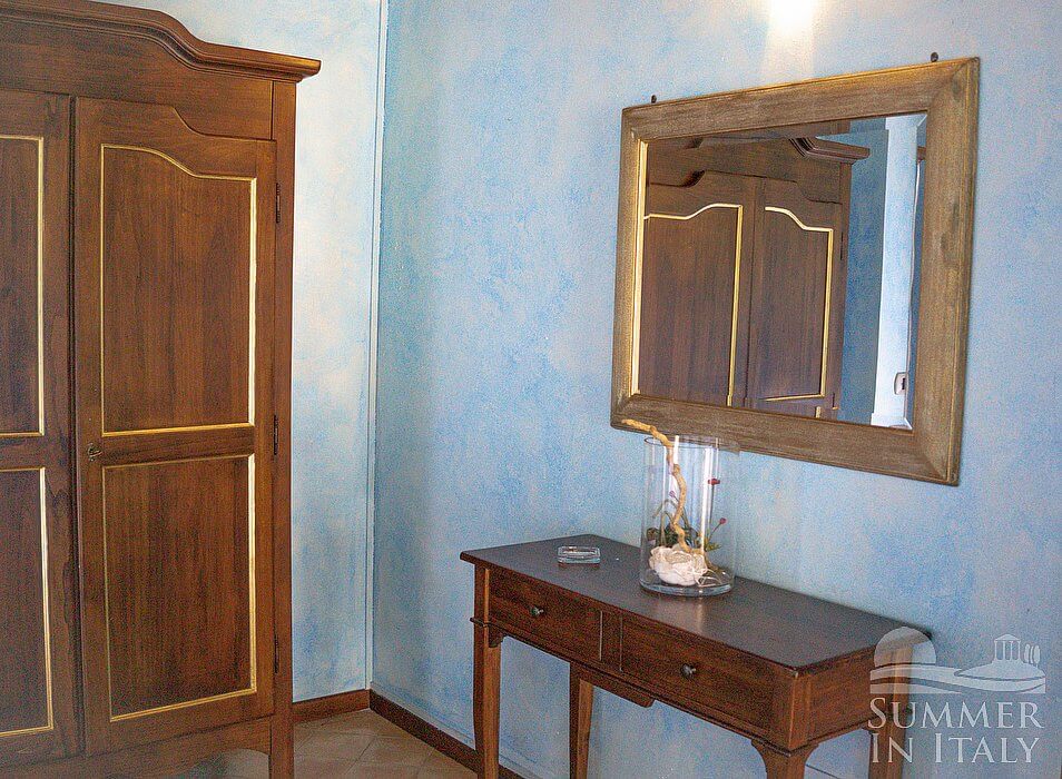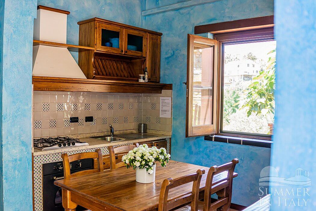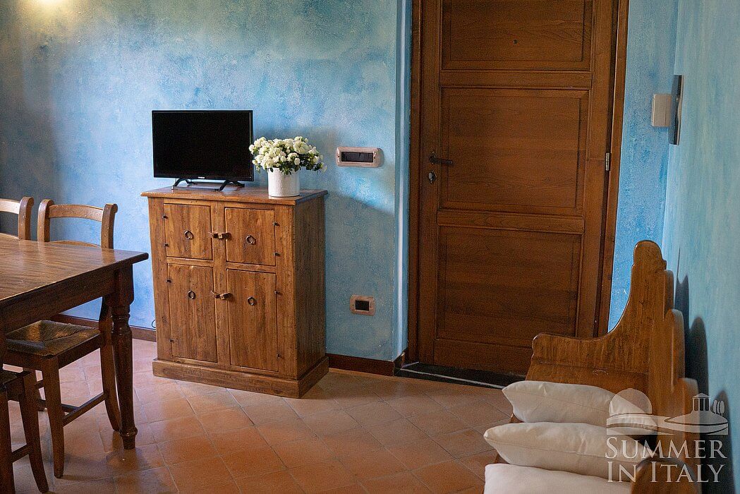 The living room is paved with terracotta tiles. The furnishings include a wood sofa. In the living room you will also find a cooking area. The kitchenette is equipped with a four-burner gas cooker, an electric oven, a refrigerator with freezer and an Italian-style coffee-maker. There is also a washing machine (hidden in a cabinet). The dining table can accommodate four guests. In this room you will find a satellite television (local channels). The room has a window overlooking the gardens of the surrounding houses. It is equipped with an air conditioning/heating unit.
