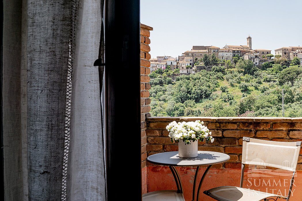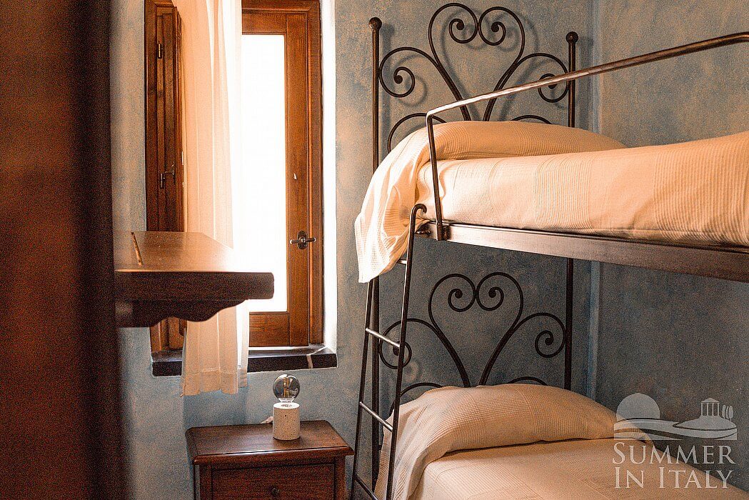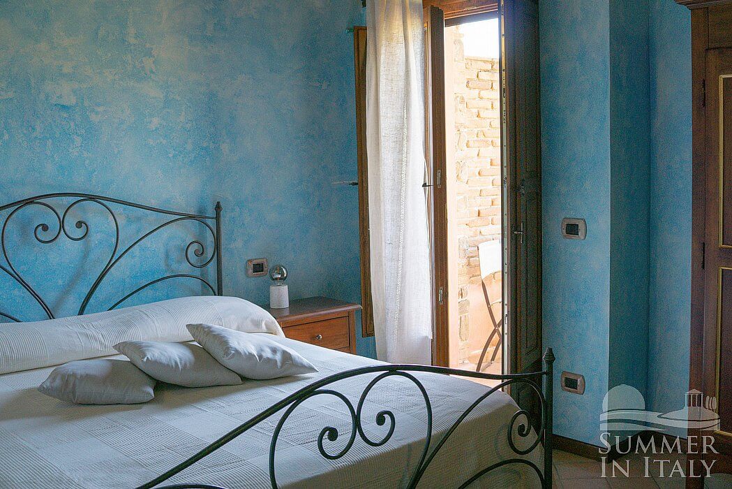 You will be able to enter the first bedroom from the corridor. The furnishings are simple and comfortable. The room has a matrimonial bed (160 cm/63 inches, wider than a queen-size bed). From the bedroom you will be able to enter the terrace with a view of surrounding countryside through a French door. The bedroom is equipped with an air conditioning/heating unit.