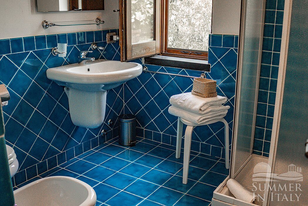 You will reach the swimming pool from the garden going down a stairway which consists of approximately 15 steps. The pool is 8 meters (26 feet) large by 14 meters (46 feet) long, from 80 centimeters (2.6 feet) to 1.5 meters (5 feet) deep. The swimming pool has a sinuous shape. The area is equipped with a table, chairs, sun umbrellas, deck chairs, sun loungers and an external shower. From the swimming pool you will enjoy a splendid view of the valley and of the sea at a distance. You will share the pool with guests staying at 3 other apartments. The swimming pool is open from the beginning of June until the end of September, from 9 am to 7 pm.