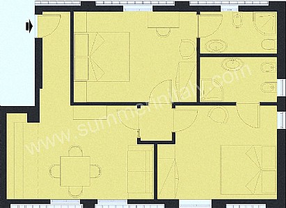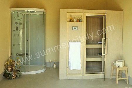 You will be able to enter the wellness room from the garden through a French door. In the wellness room you will find an exercise bike and a sauna. This room has a bathroom, equipped with a washbasin, a toilet and a hydromassage shower (the bathroom has a second door that opens into the corridor). You will share the wellness room with the other guests staying at the complex. Please note that use of the wellness facilities is not included in the rental fee and must be paid locally.