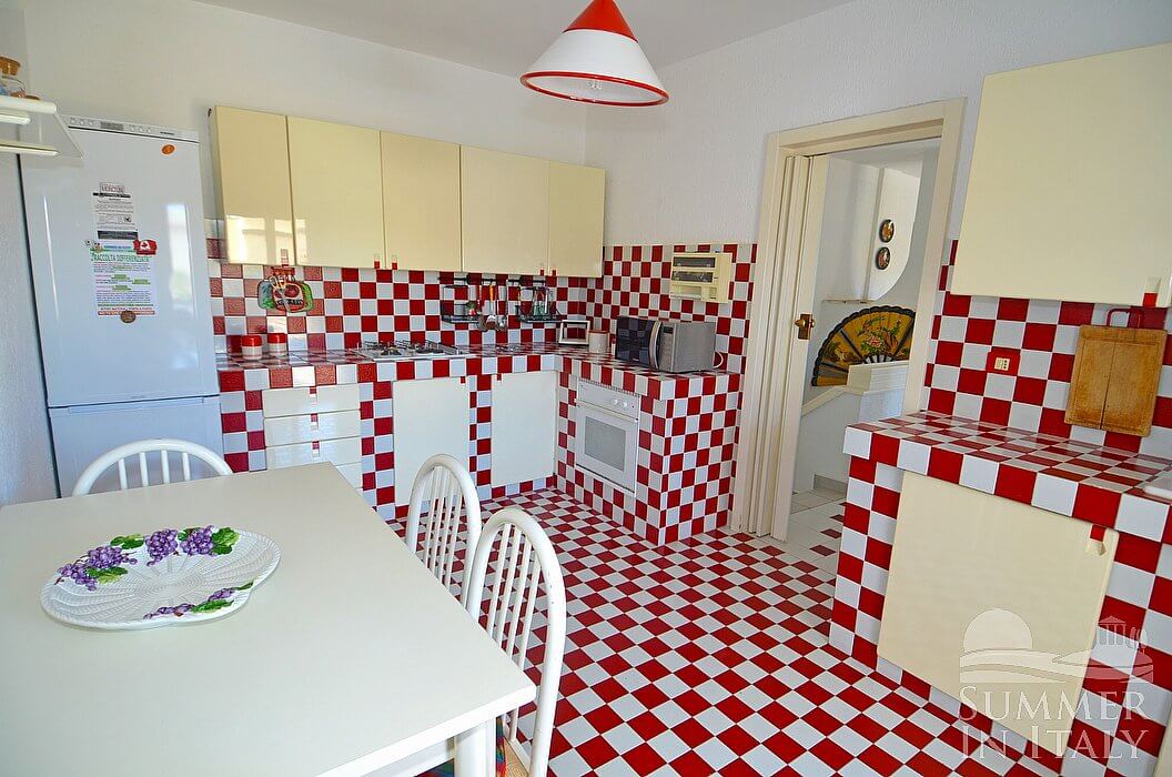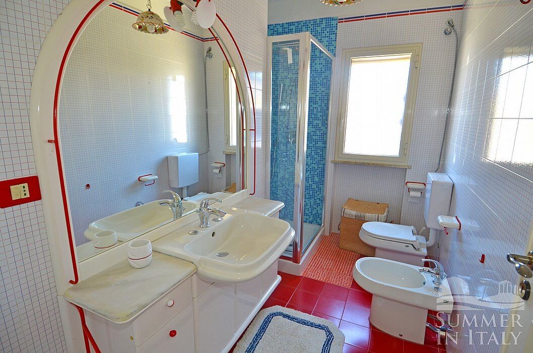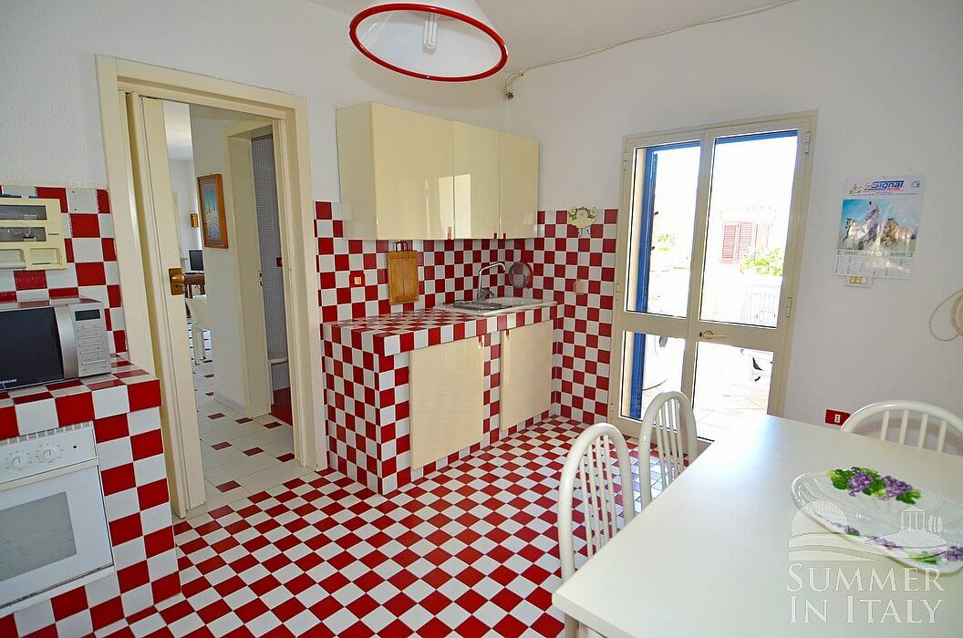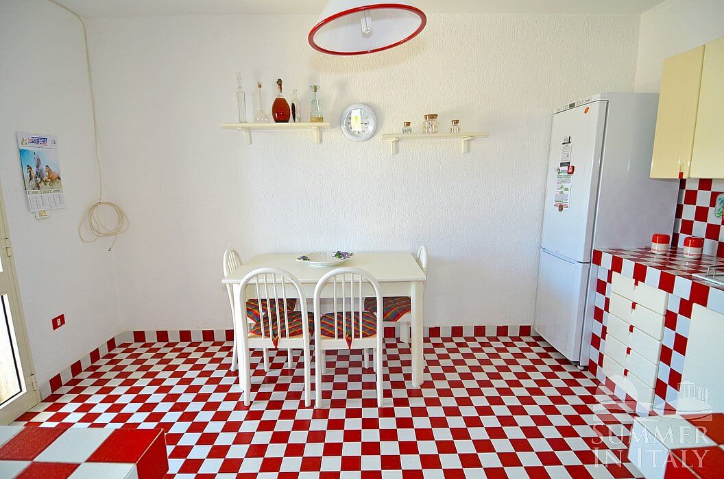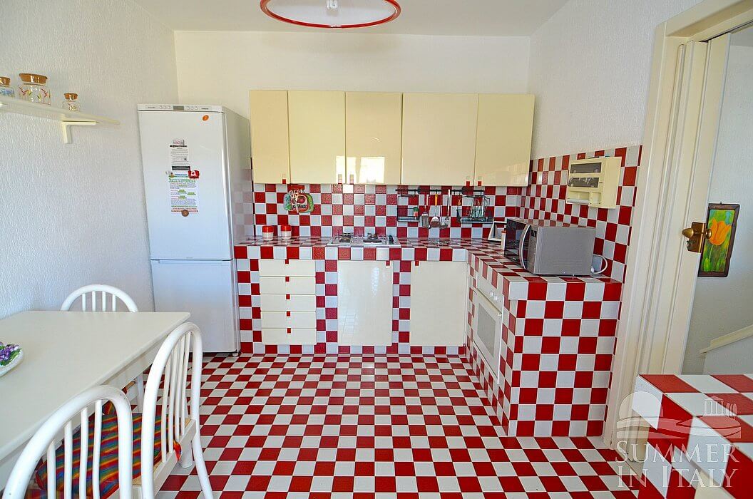 You will be able to enter the kitchen from the living room. The floor is paved with checkered red and white tiles. It is equipped with a four-burner gas cooker, an electric oven, a refrigerator with freezer, a microwave oven, an Italian-style coffee-maker and a kettle. The dining table can accommodate four guests. From the kitchen a French door will take you to the terrace.
