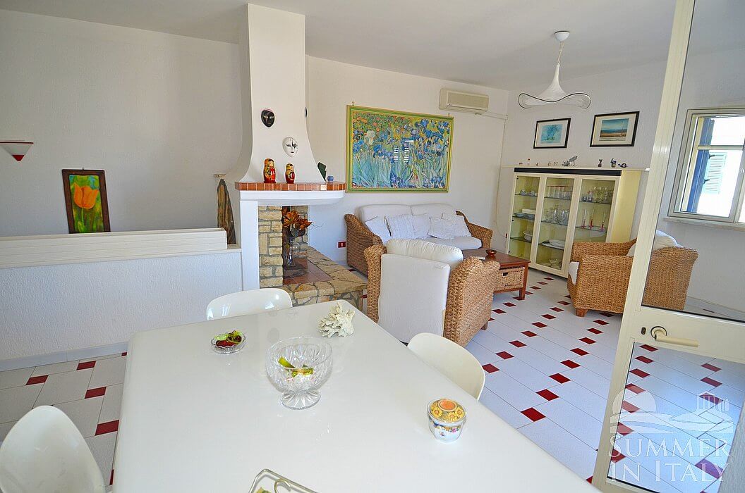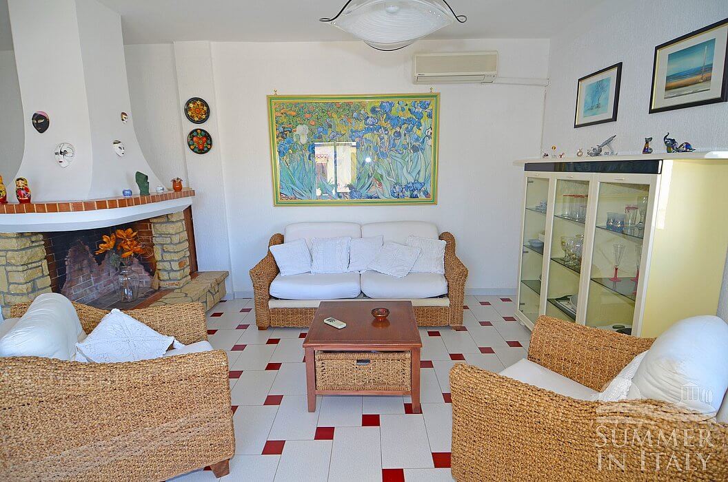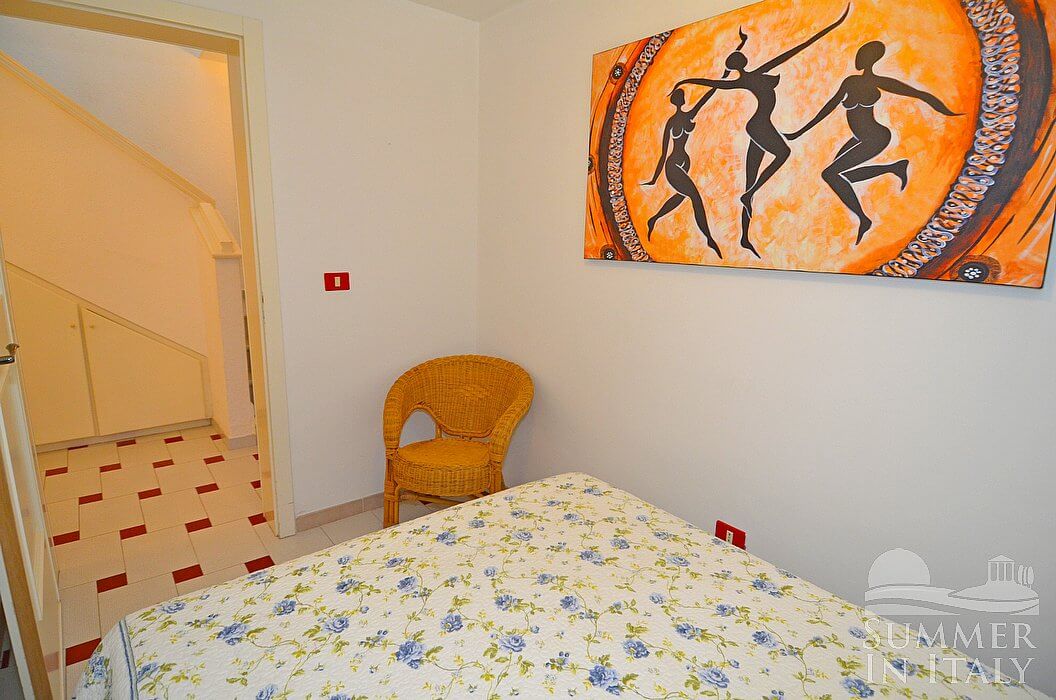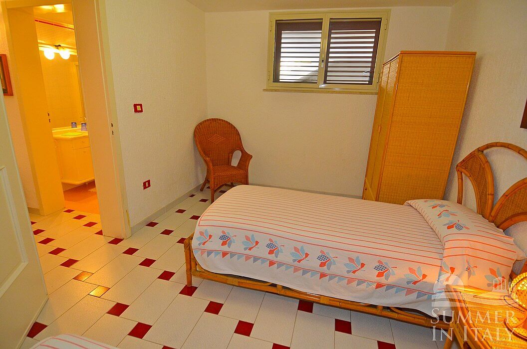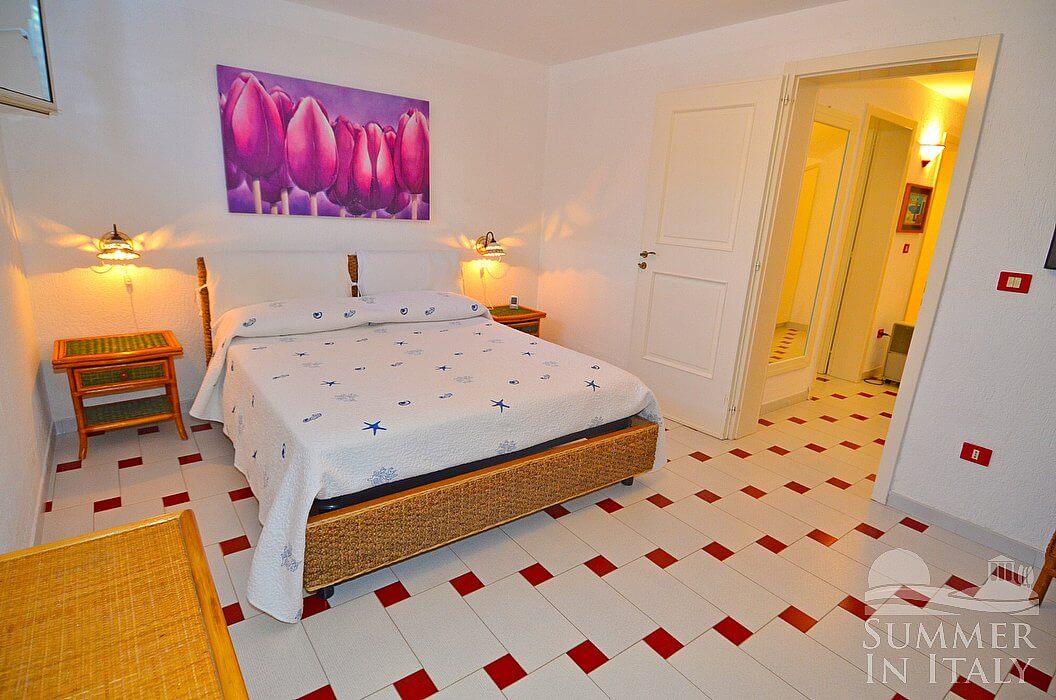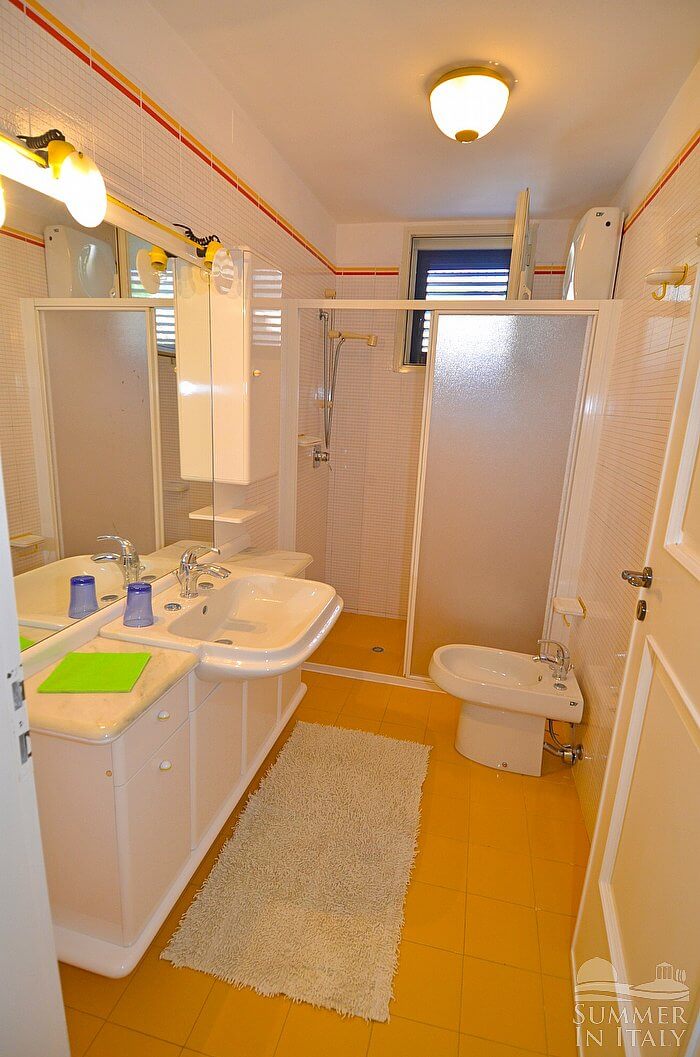 You will be able to enter the kitchen from the living room. The floor is paved with checkered red and white tiles. It is equipped with a four-burner gas cooker, an electric oven, a refrigerator with freezer, a microwave oven, an Italian-style coffee-maker and a kettle. The dining table can accommodate four guests. From the kitchen a French door will take you to the terrace.