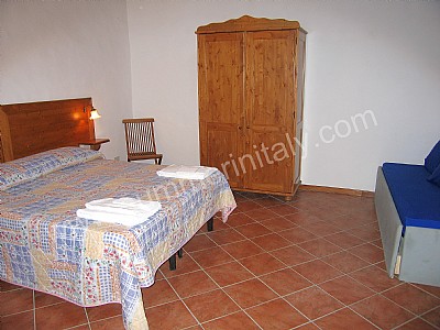 The ceiling of the second bedroom is sloped and has characteristic exposed wood beams and terracotta tiles. The furnishings are simple. The room has a matrimonial bed (160 cm/62 inches, wider than a queen-size bed).