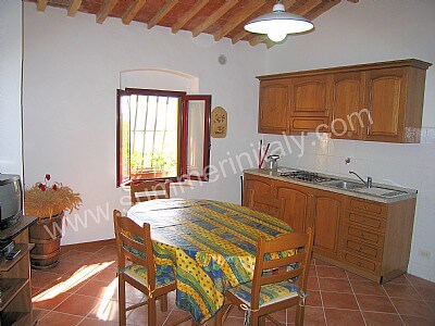 The ceiling of the kitchen is sloped and has characteristic exposed wood beams. The furnishings are simple. It is equipped with a four-burner gas cooker, a refrigerator with freezer, an Italian-style coffee-maker and an American-style coffee-maker (bring your filters!). The dining table can accommodate four guests. The kitchen is also equipped with a satellite television (local channels). The kitchen has a window with a view of the countryside.