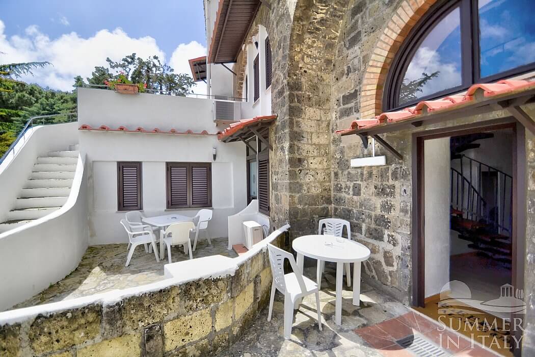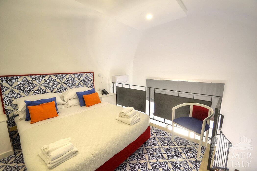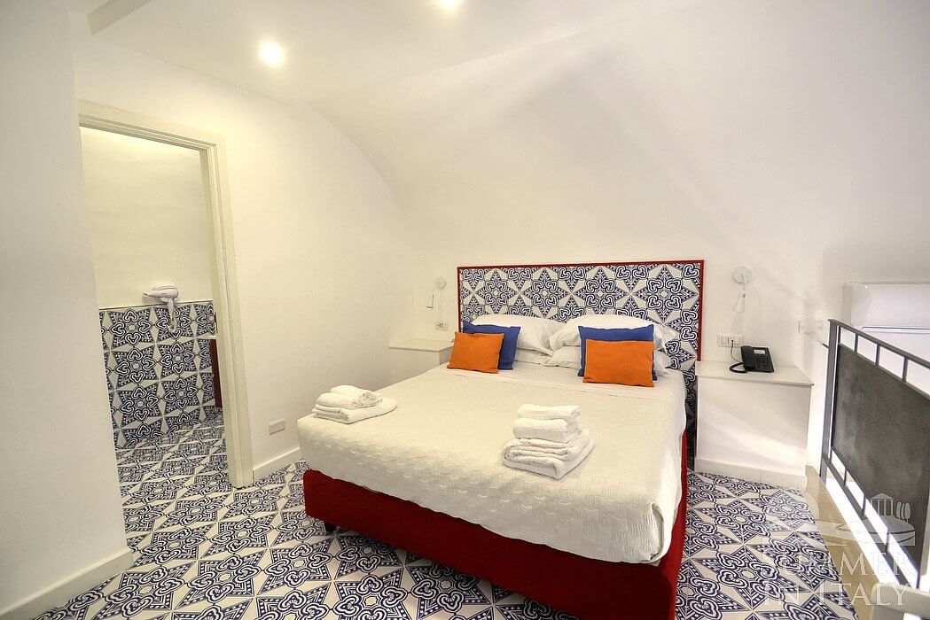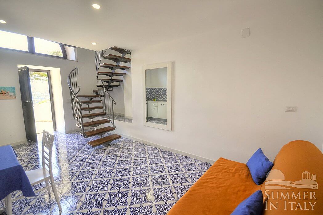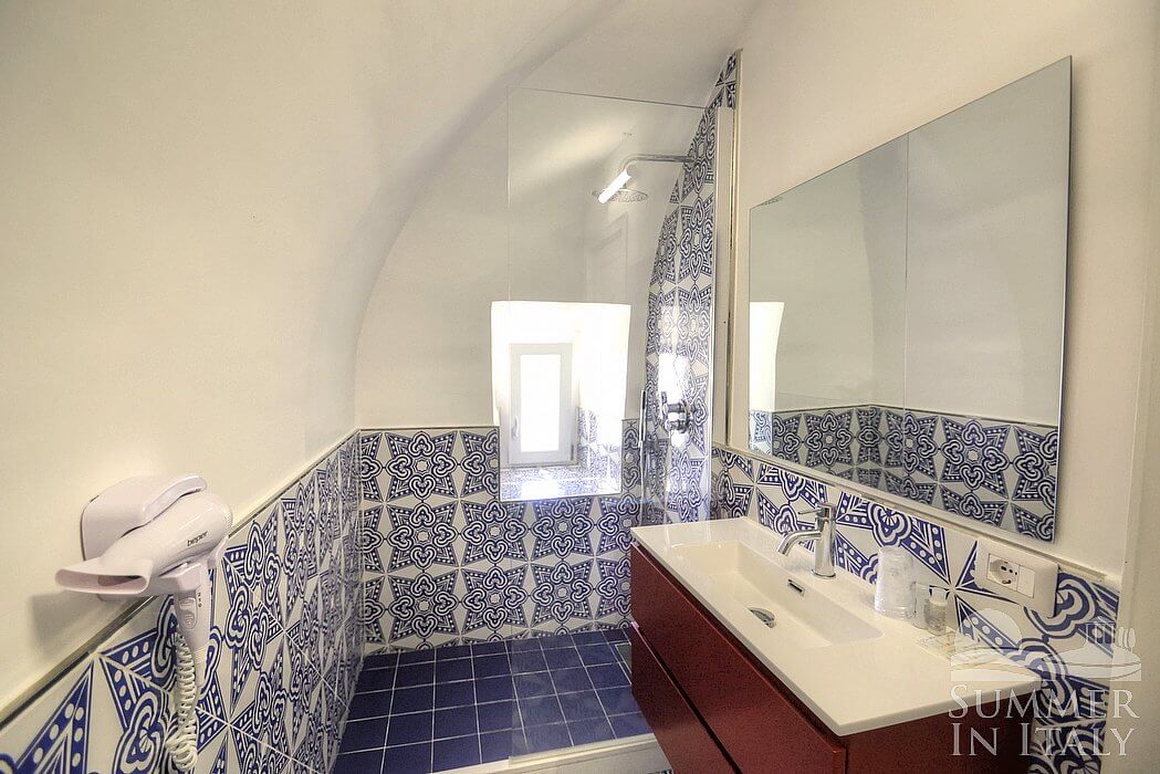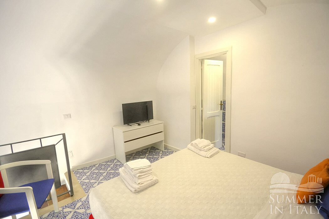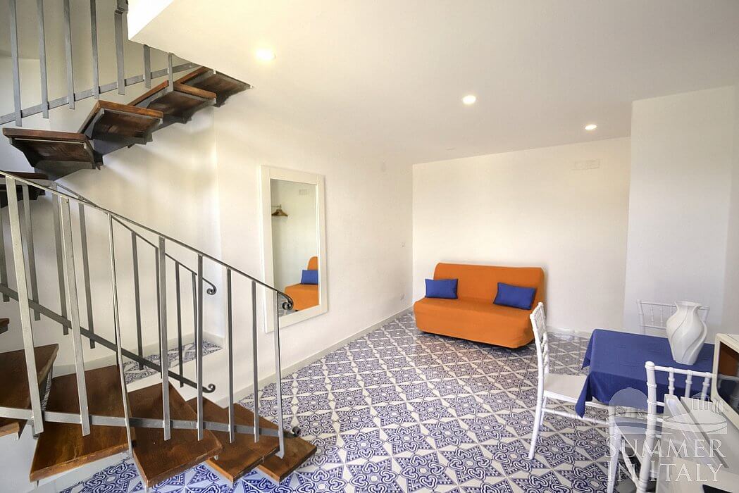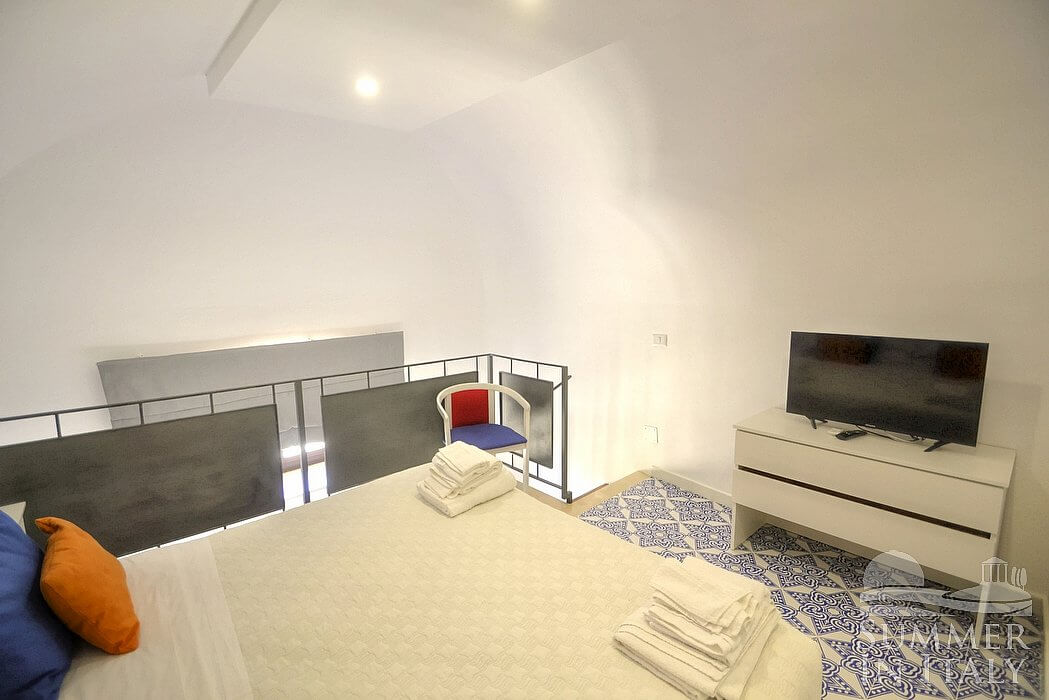 In the living room you will find an open mezzanine level, without door. You will be able to access it climbing 15 steps. The mezzanine has a matrimonial bed (160 cm/63 inches, wider than a queen-size bed). On the mezzanine level there is a bathroom, decorated with majolica tiles and equipped with a washbasin, a toilet, an open shower and a hairdryer. In this room you will find a television (local channels).
