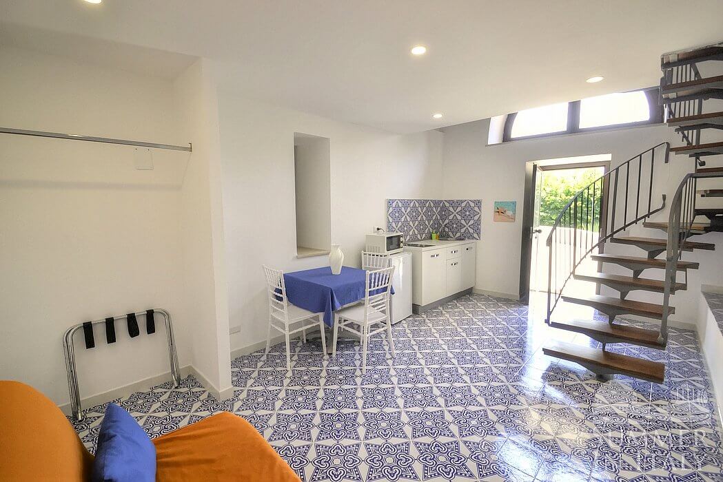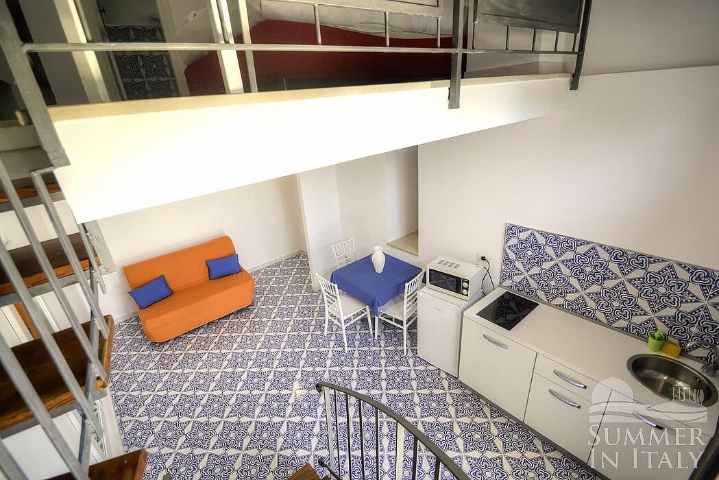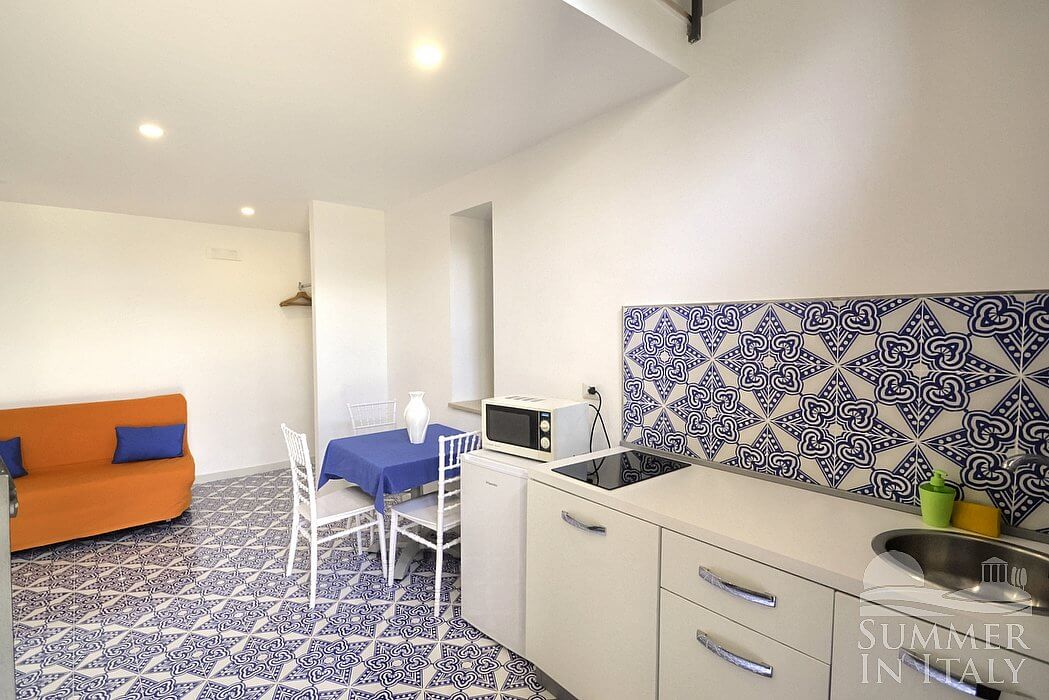 The living room is paved with tiles with inlaid designs. The ceiling is high and vaulted. The furnishings are simple and comfortable, and include a divan that unfolds into a French bed. In the living room you will also find a cooking area. The kitchenette is equipped with a two-burner induction cooker, a small electric oven, a small refrigerator with freezer and an Italian-style coffee-maker. The dining table can accommodate three guests. The room has a arched window. It is equipped with an air conditioning/heating unit.