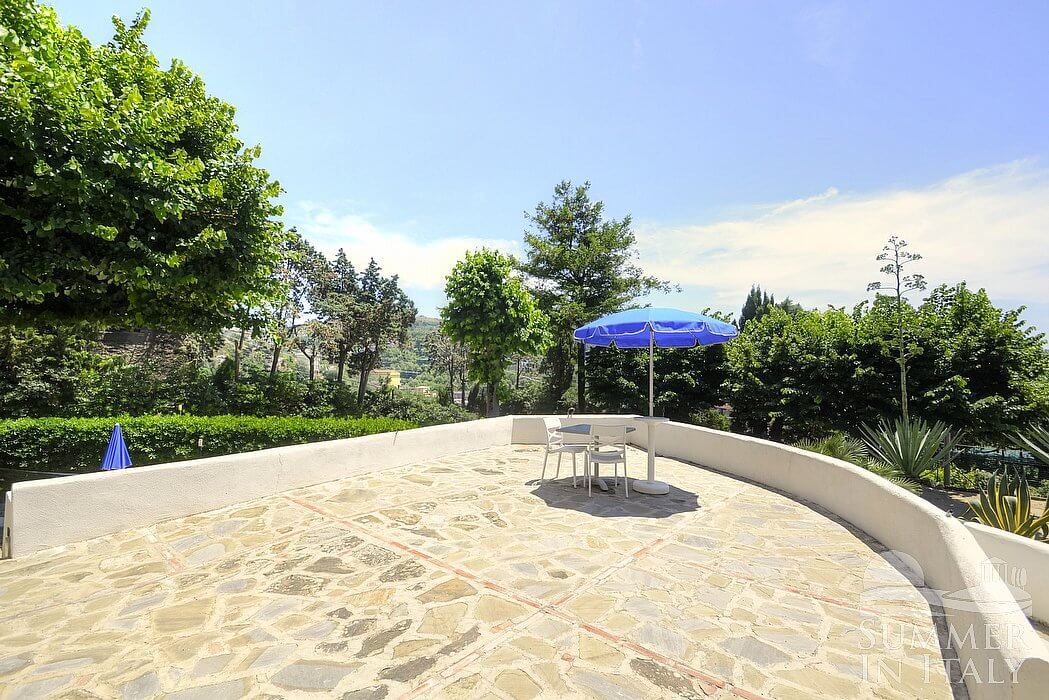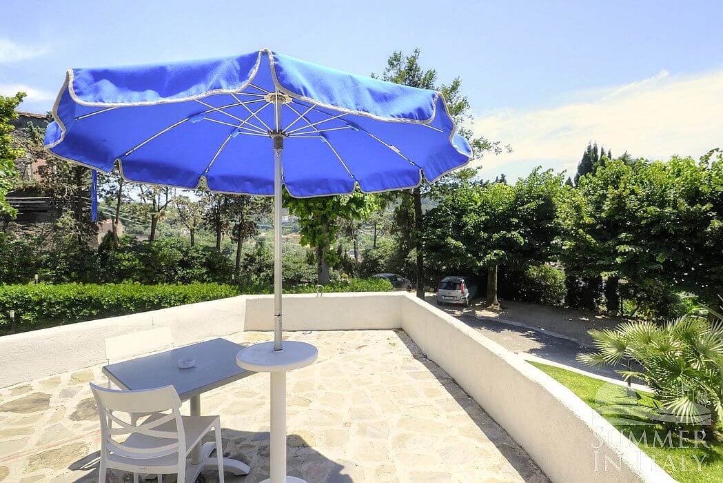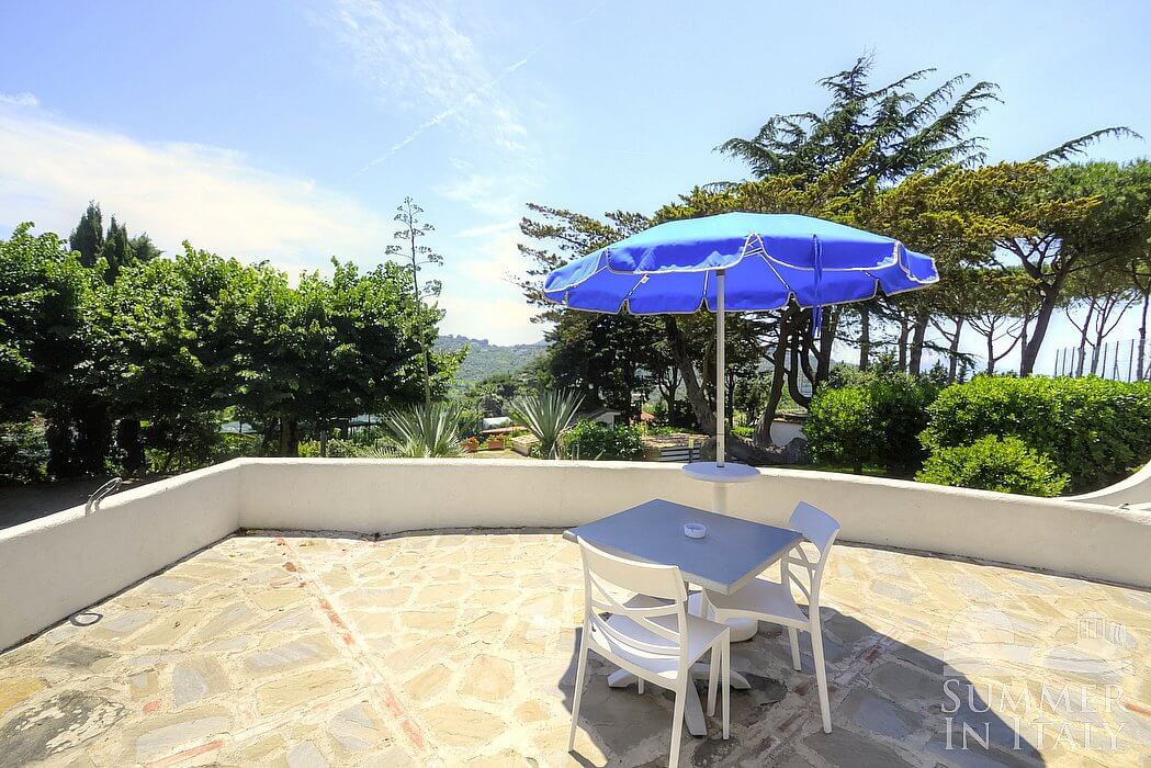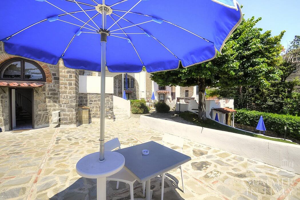 The swimming pool is 11 meters (36 feet) large by 20 meters (65 feet) long, from 1.50 meter (5 feet) to 2.80 meters (9.2 feet) deep. The area is equipped with tables, chairs, sun umbrellas, sun loungers and an external shower. From the swimming pool you will enjoy a charming view of the greenery and of the sea at a distance. You will share the pool with the other guests staying at the complex. The swimming pool is open from the beginning of May until the end of September, from 9 am to 6 pm.