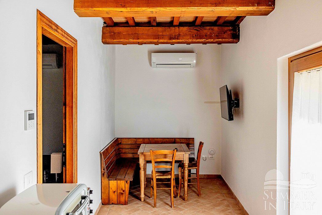The kitchen is paved with terracotta tiles. The ceiling has characteristic exposed wood beams and terracotta tiles. The furnishings are simple and comfortable. It is equipped with a four-burner induction cooker, a small electric oven, a refrigerator with freezer, a dishwasher, an Italian-style coffee-maker, an American-style coffee-maker and a kettle. The dining table can accommodate four guests. The furnishings of the kitchen include an armchair and a wood bench. The kitchen is also equipped with a satellite television (local channels). The kitchen has two windows, and is equipped with an air conditioning/heating unit.