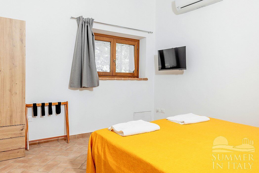 You will be able to enter the bedroom from the kitchen through an access area, climbing three steps. The bedroom has a matrimonial bed (160 cm/63 inches, wider than a queen-size bed), that can be split into twins if requested (please contact our staff in advance to make arrangements). In this room you will find a satellite television (local channels). The room has a window, and it's equipped with an air conditioning/heating unit.