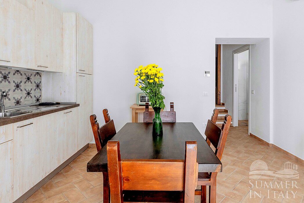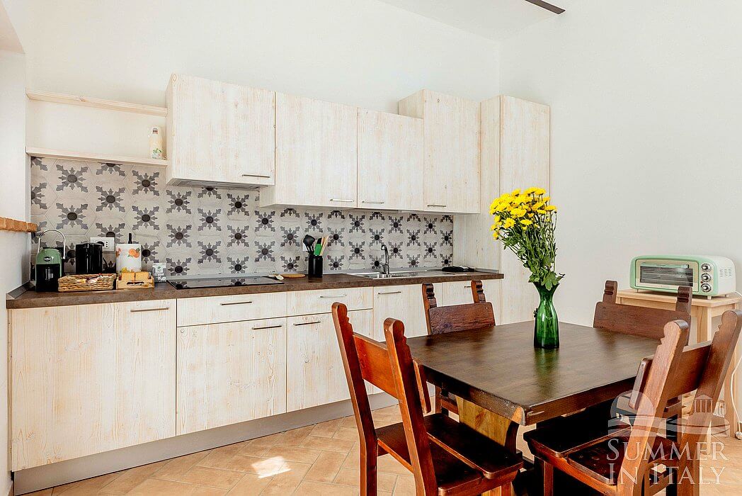 The kitchen is paved with terracotta tiles. The ceiling is barrel-vaulted. The furnishings are simple and comfortable. It is equipped with a four-burner induction cooker, a small electric oven, a refrigerator with freezer, a dishwasher, an Italian-style coffee-maker, an American-style coffee-maker and a kettle. The dining table can accommodate four guests. The furnishings of the kitchen include an armchair. The kitchen is also equipped with a satellite television (local channels). The kitchen has two windows, and is equipped with an air conditioning/heating unit.