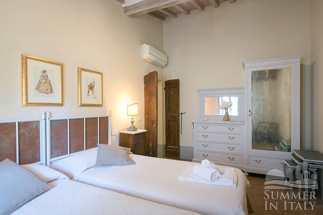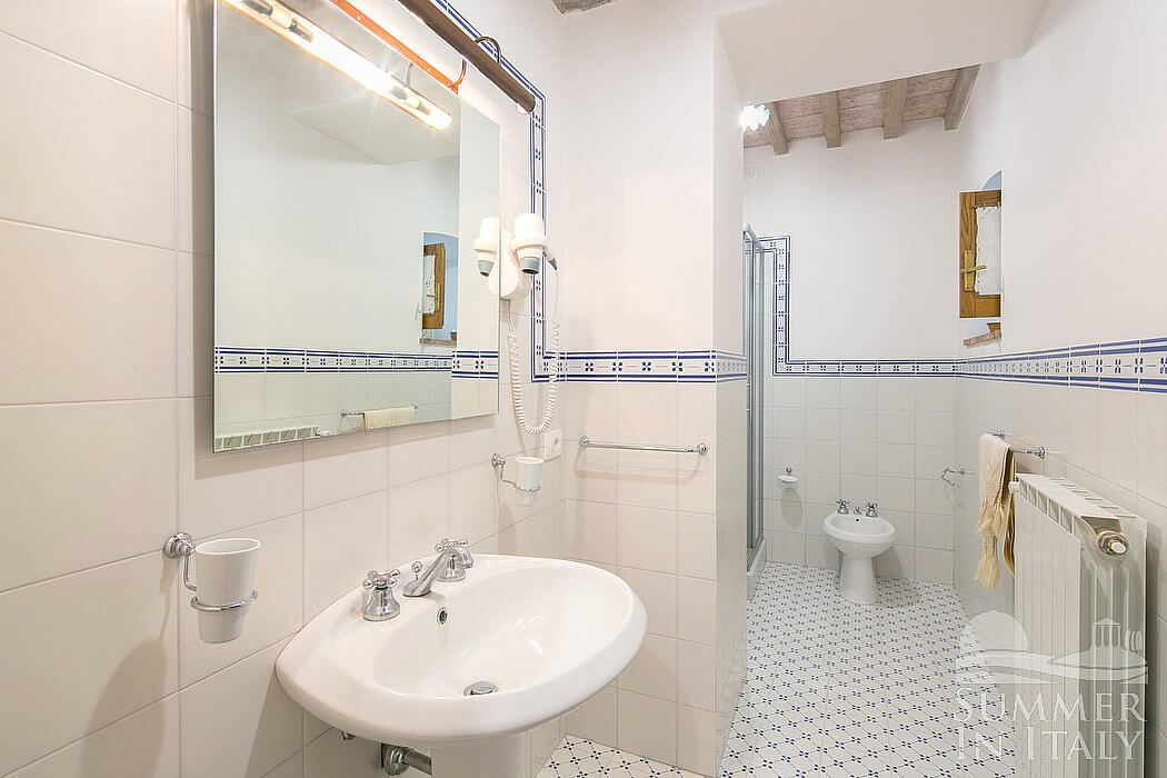 You will be able to enter the third bedroom from the living room. It has two twin beds (80 cm/32 inches). The room has a window, and it's equipped with an air conditioning/heating unit. This bedroom has an en-suite bathroom, decorated with majolica tiles and equipped with a washbasin, a toilet, a fully enclosed shower and a hairdryer.
