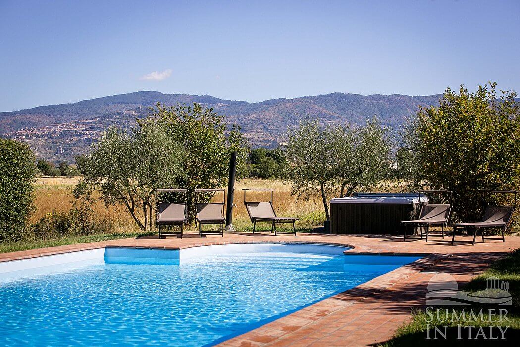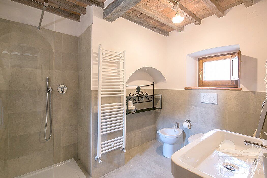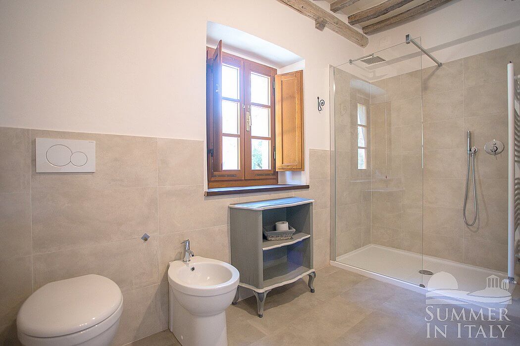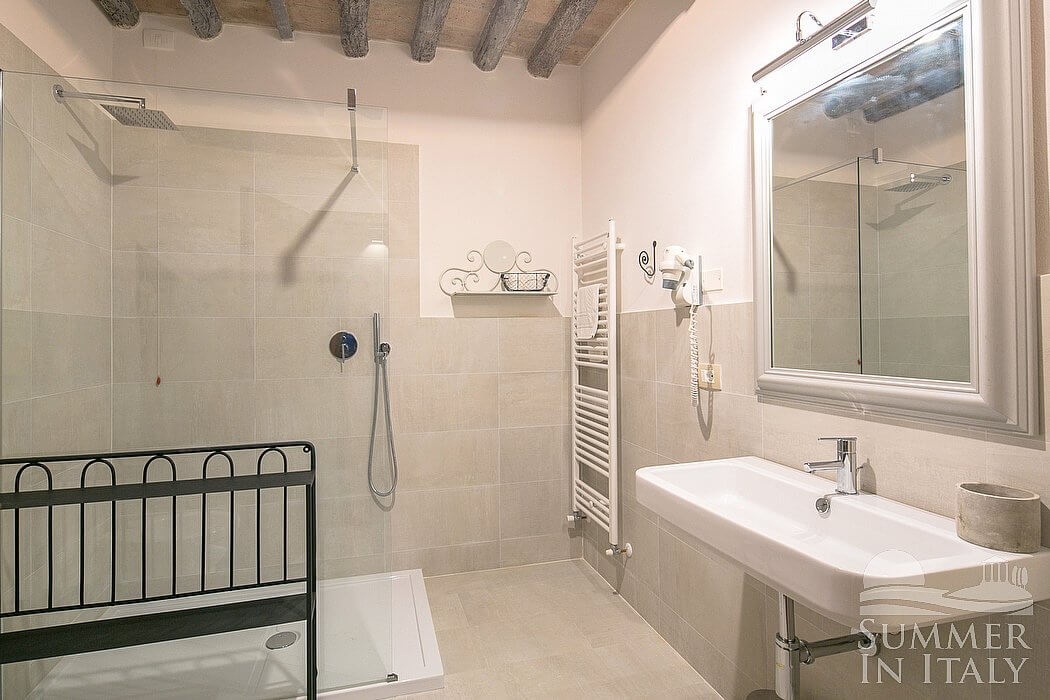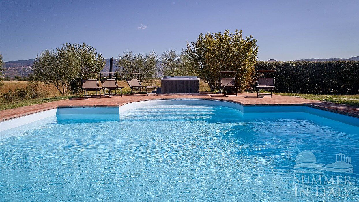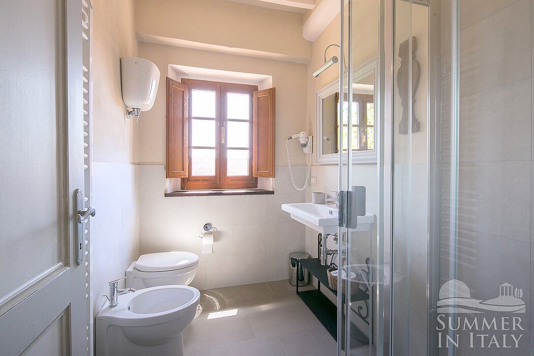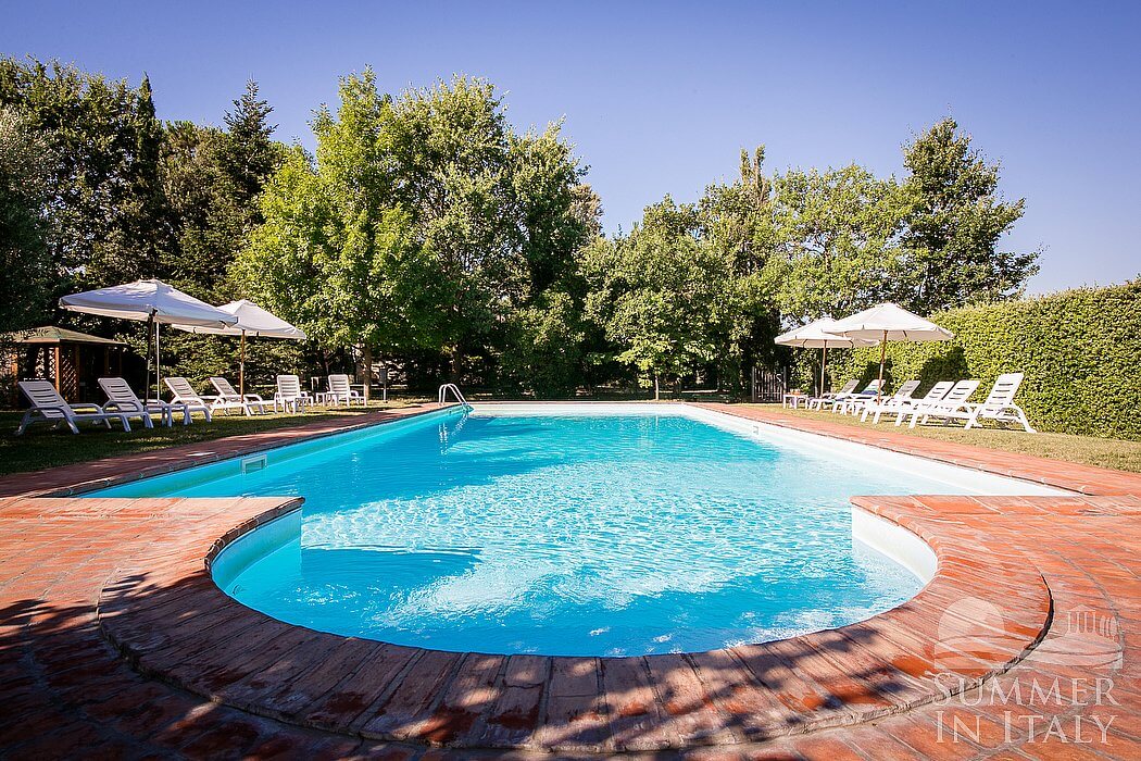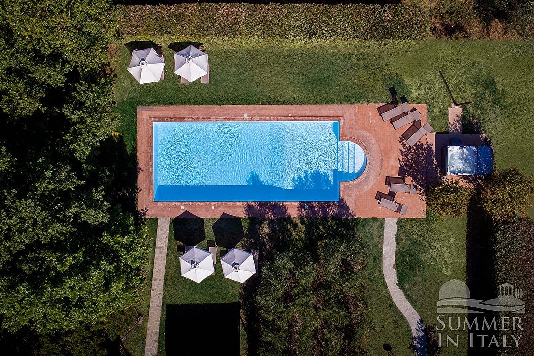 The swimming pool is 6 meters (20 feet) large by 12 meters (39 feet) long, from 90 centimeters (2.9 feet) to 1.5 meters (5 feet) deep. In the swimming pool area you will also find an above-ground heated jacuzzi pool with hydromassage (3 by 3 meters, 9.8 by 9.8 feet) with six seats. The jacuzzi pool is open from the beginning of April until the end of October. It is equipped with sun umbrellas, sun loungers and an external shower, and it is partly shaded by tall trees. From the swimming pool you will enjoy an enchanting view of the greenery and of the hills. The pool is open from the end of May until the end of September.