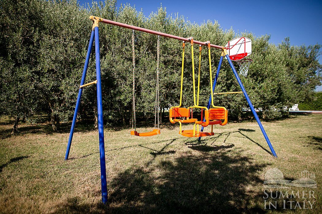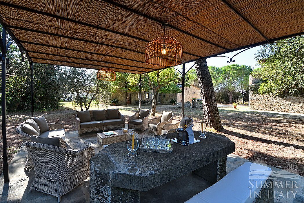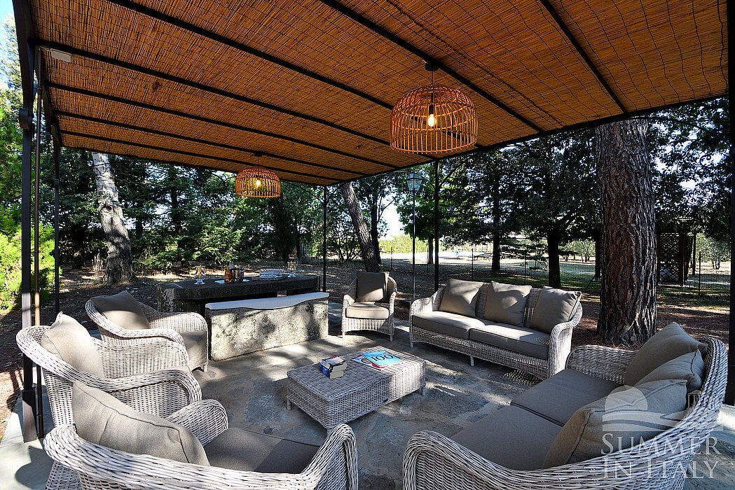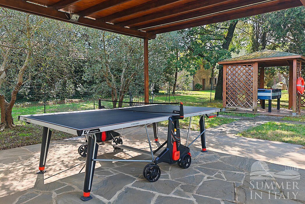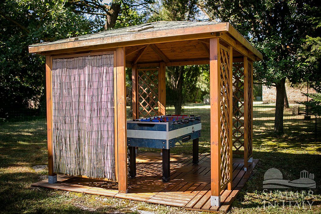 The garden is 6000 square meters (65000 square feet). It is partly shaded by a characteristic pergola with a bamboo roof and by a wood roof. The garden is equipped with two sofas, armchairs and two masonry benches, as well as with a table and a wooden gazebo. Here you will be able to have fun with a ping pong table and a football table.