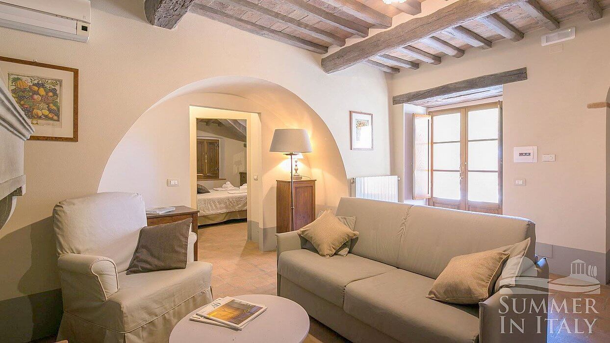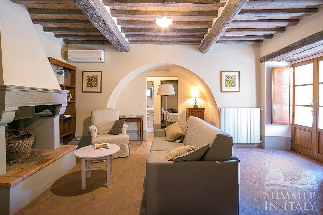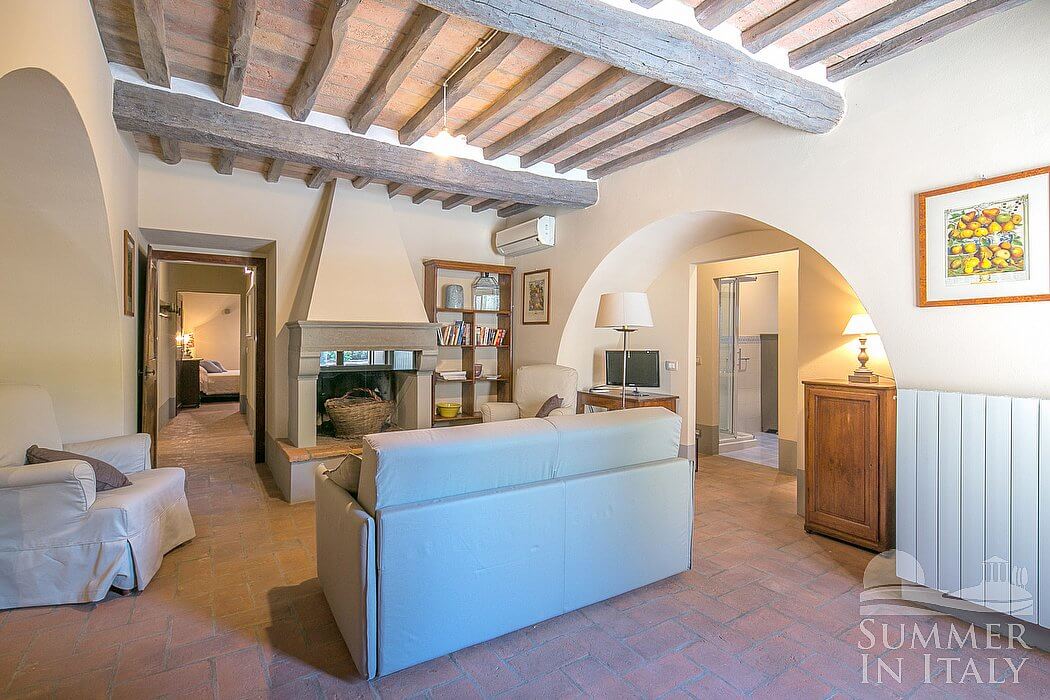 The living room is paved with terracotta tiles. The ceiling has characteristic exposed wood beams and terracotta tiles. The furnishings are classic and welcoming, and include a sofa and two armchairs. There is a big fireplace made of stone, for decorative purposes only. In this room you will find a television (local channels). From the living room you will be able to enter the patio and the garden through a French door. The room is equipped with an air conditioning/heating unit.