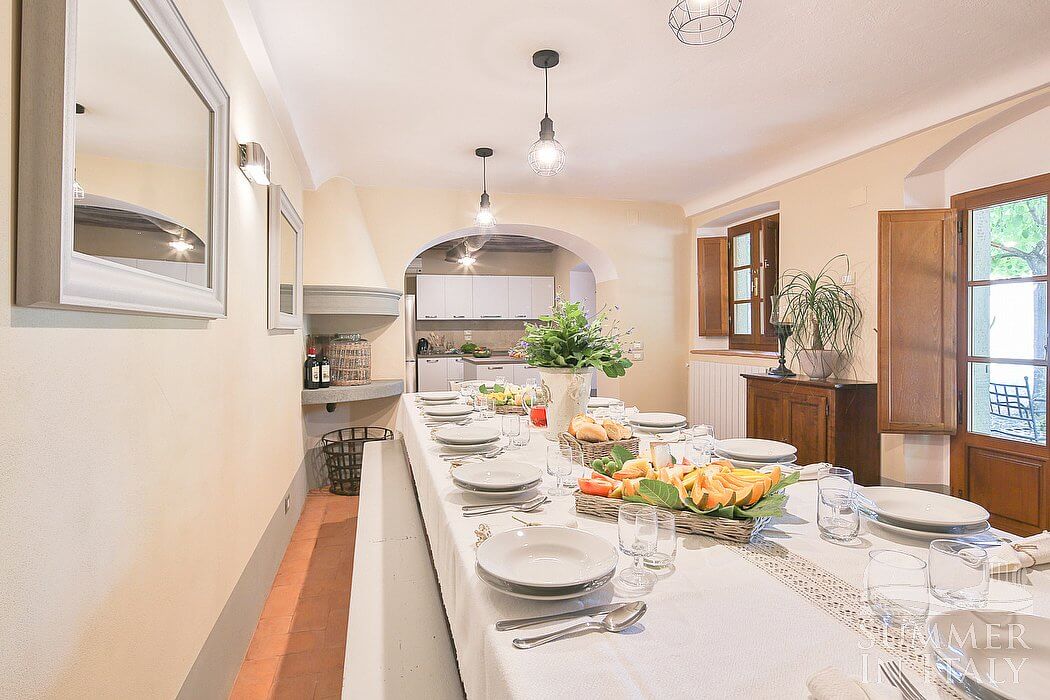 You will be able to enter the dining room from the kitchen through an arched opening. The furnishings are warm and welcoming, and include suspended chandeliers. The dining table can accommodate 14 guests. The furnishings include two wood benches. In this room you will also find a television (local channels). From the dining room you will be able to enter the garden through a French door. The room also has a window, and is equipped with an air conditioning/heating unit.