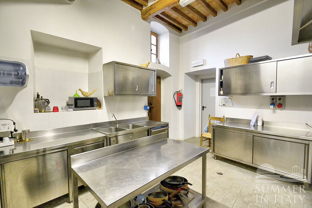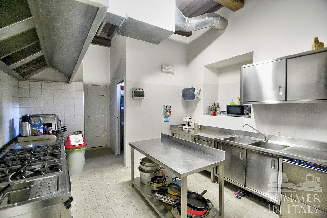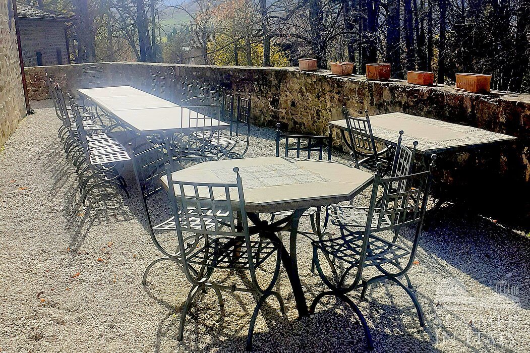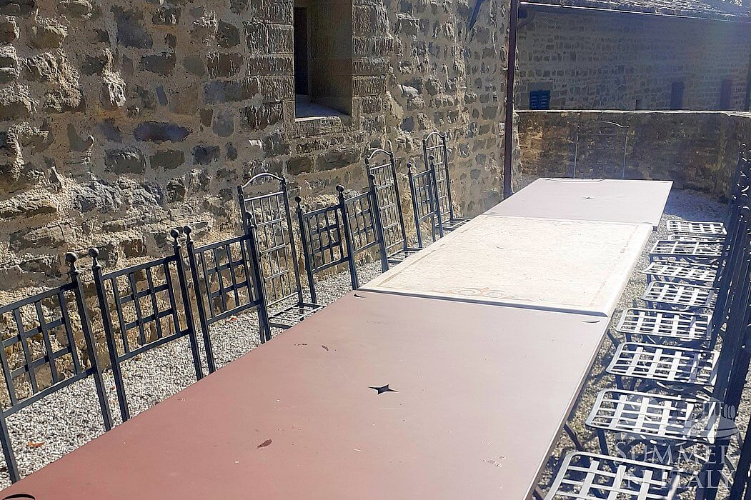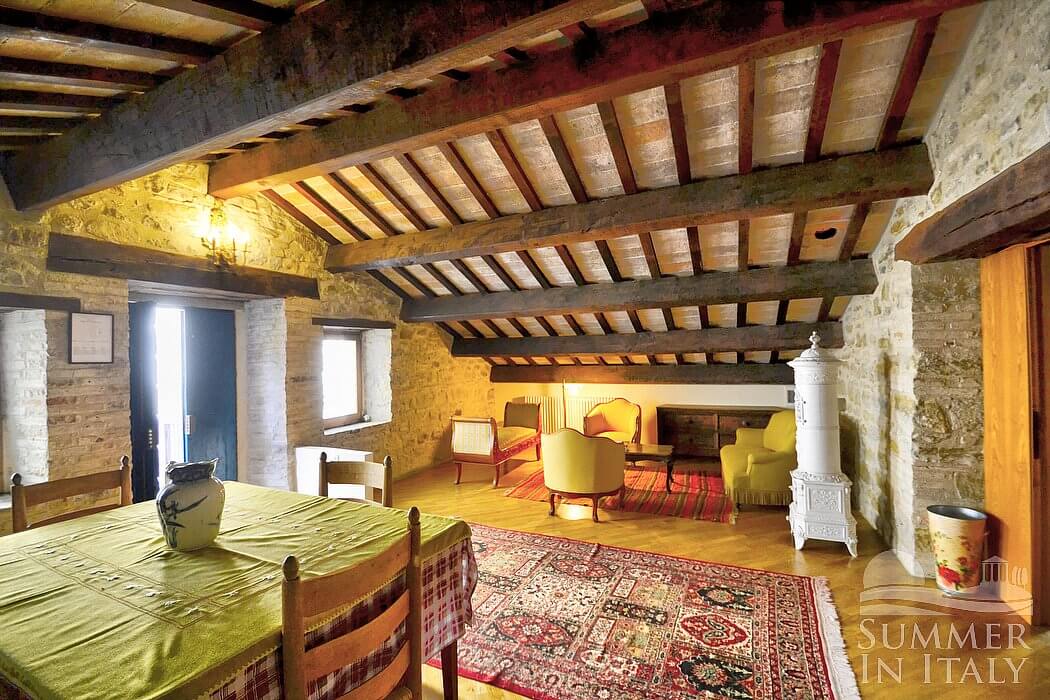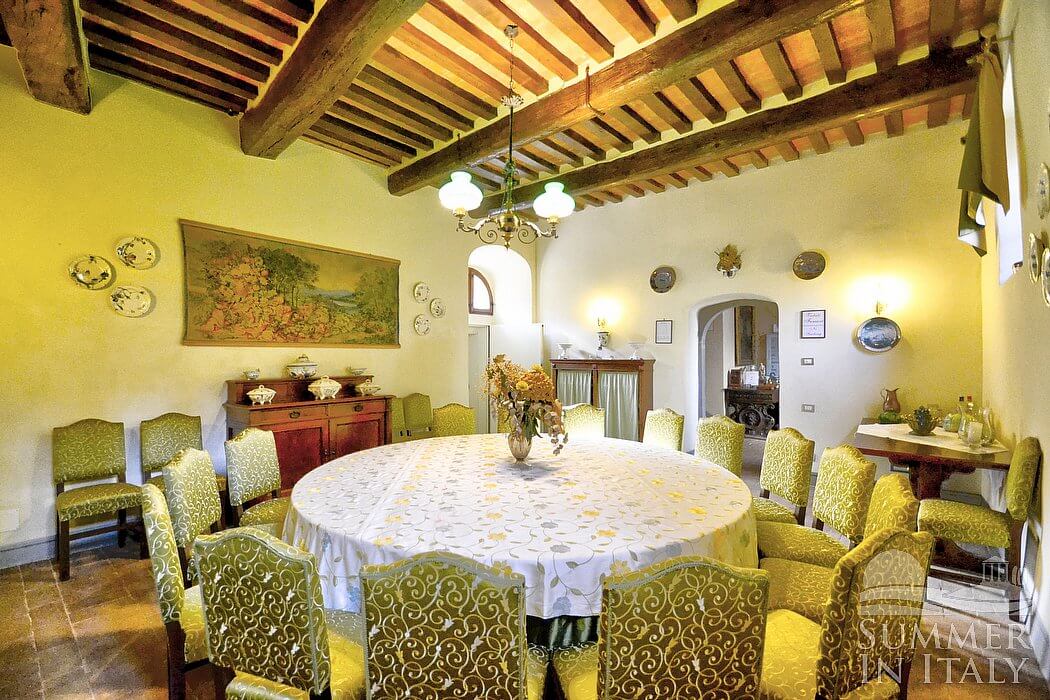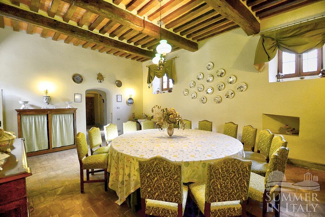 You will be able to enter the second dining room from the entrance hall through an access area. The floor is paved with original terracotta tiles. The ceiling has characteristic exposed wood beams. The furnishings are elegant and welcoming, and include some antique pieces. The dining table can accommodate 18 guests. There is a big and age-old fireplace. The room has three high windows.