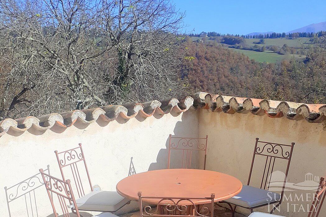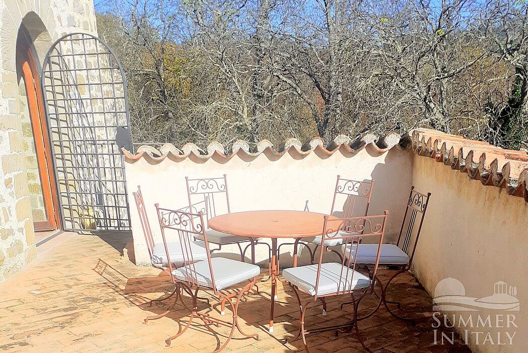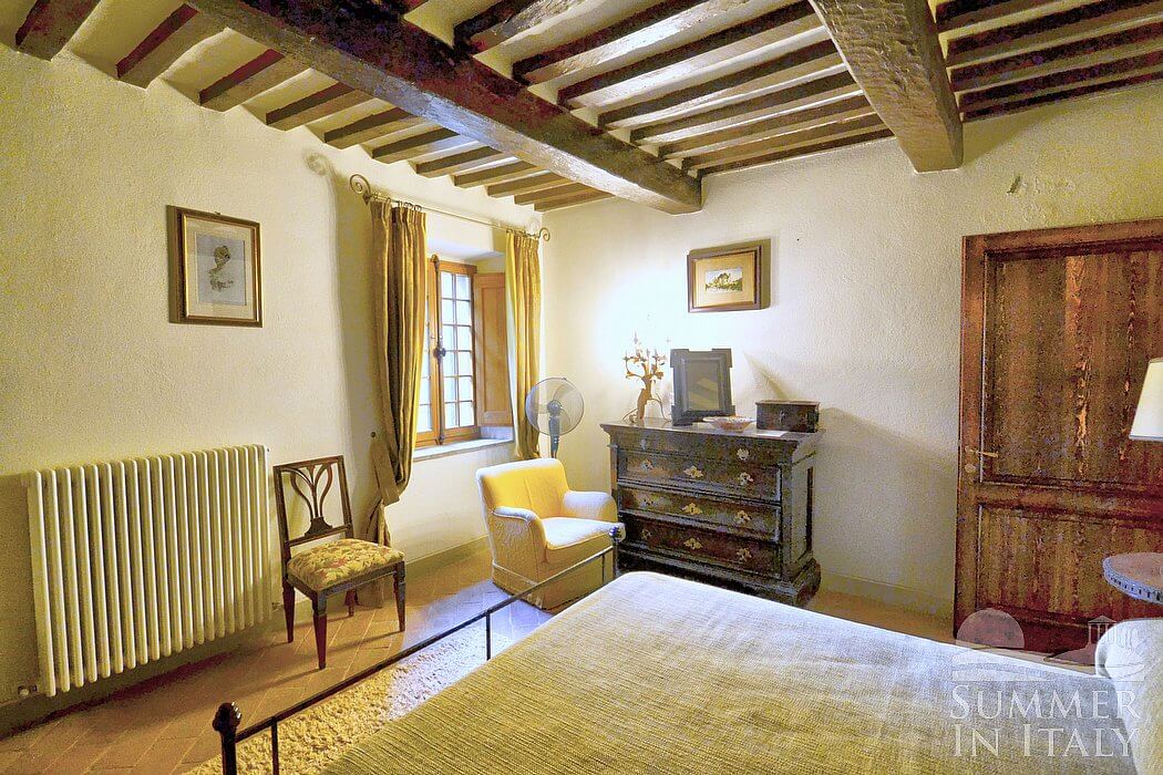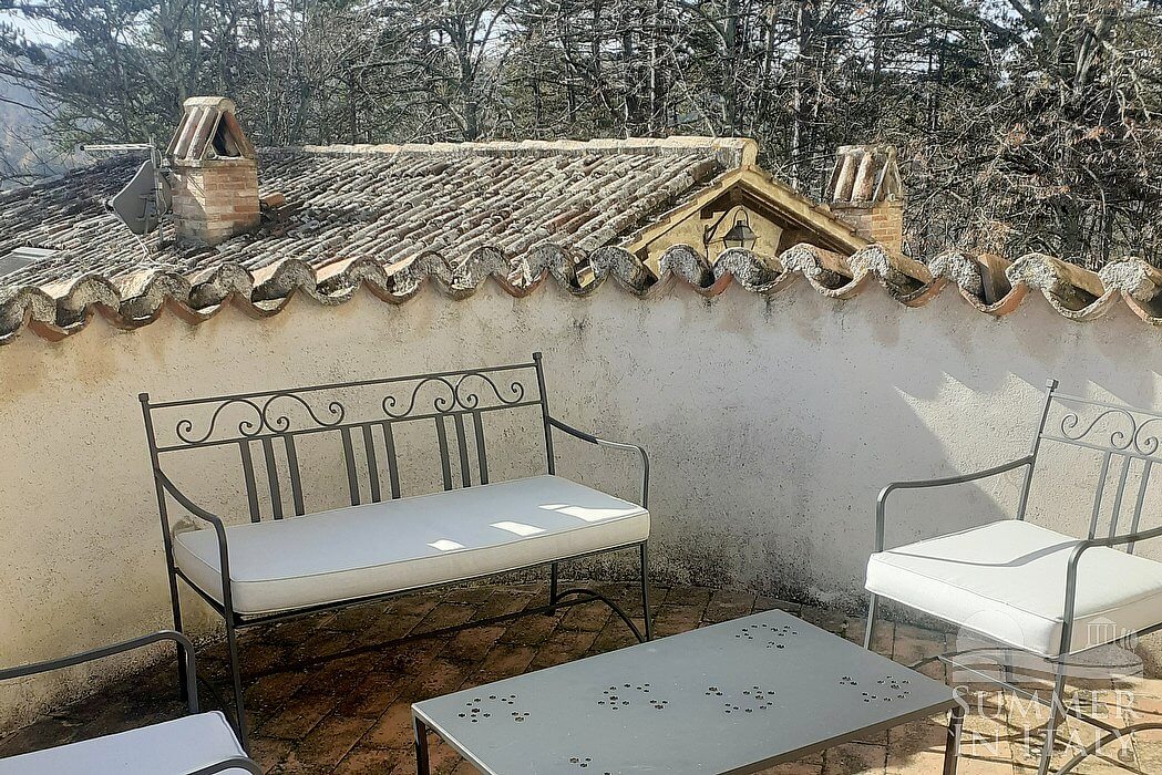 The first living room is paved with original terracotta tiles. The ceiling has characteristic exposed wood beams. The furnishings are elegant and refined, featuring some antique pieces, and include a sofa, armchairs and a chaise longue. There is a big and age-old fireplace, for decorative purposes only. In this room you will find a satellite television (local channels). From the living room you will be able to enter the second terrace through a French door. The room has two windows, as well as two large panoramic arched windows.