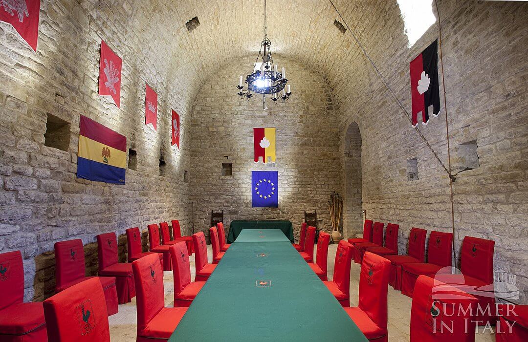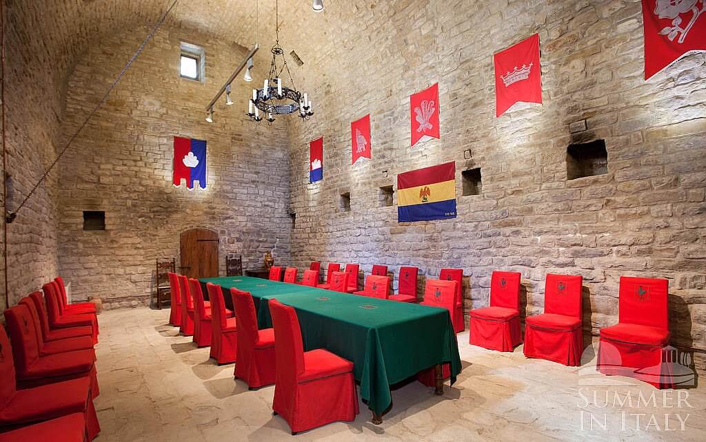 You will be able to enter the first dining room from the patio through an external access. The floor is paved with ancient stone tiles. The ceiling is made of stone and vaulted. The furnishings are in medieval style, and include a suspended chandelier and banners on the walls. The dining table can accommodate 30 guests. The room has four high windows.