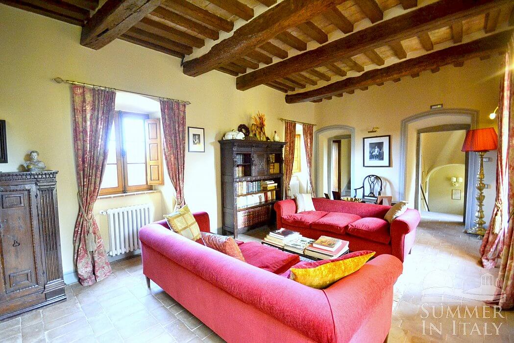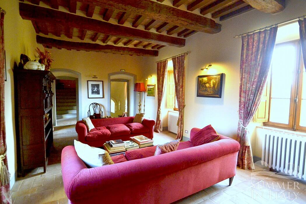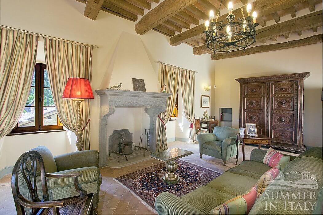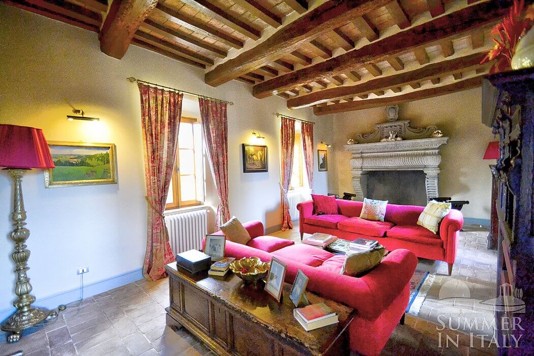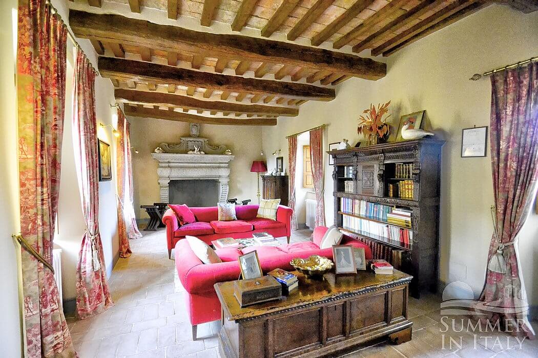 You will be able to enter the second living room through an access area. The floor is paved with original terracotta tiles. The furnishings are elegant and refined, featuring some antique pieces, and include two sofas. There is a big and age-old fireplace, for decorative purposes only. The room has four windows.