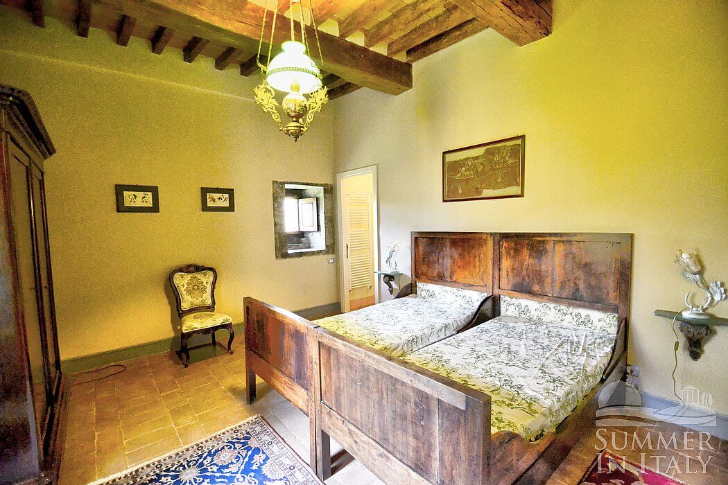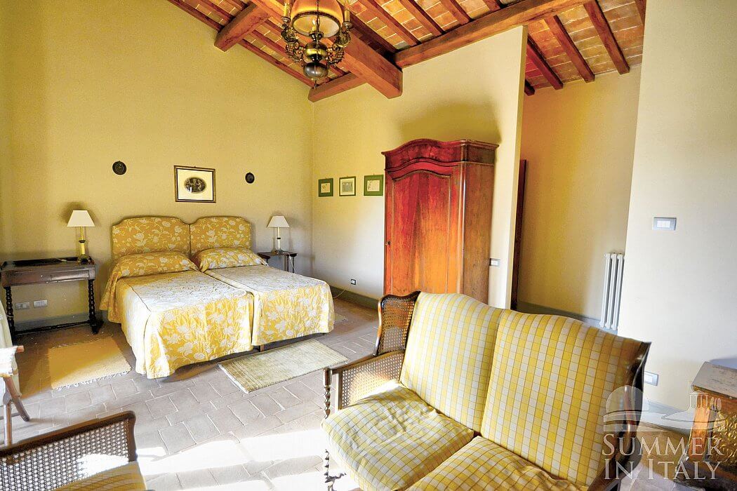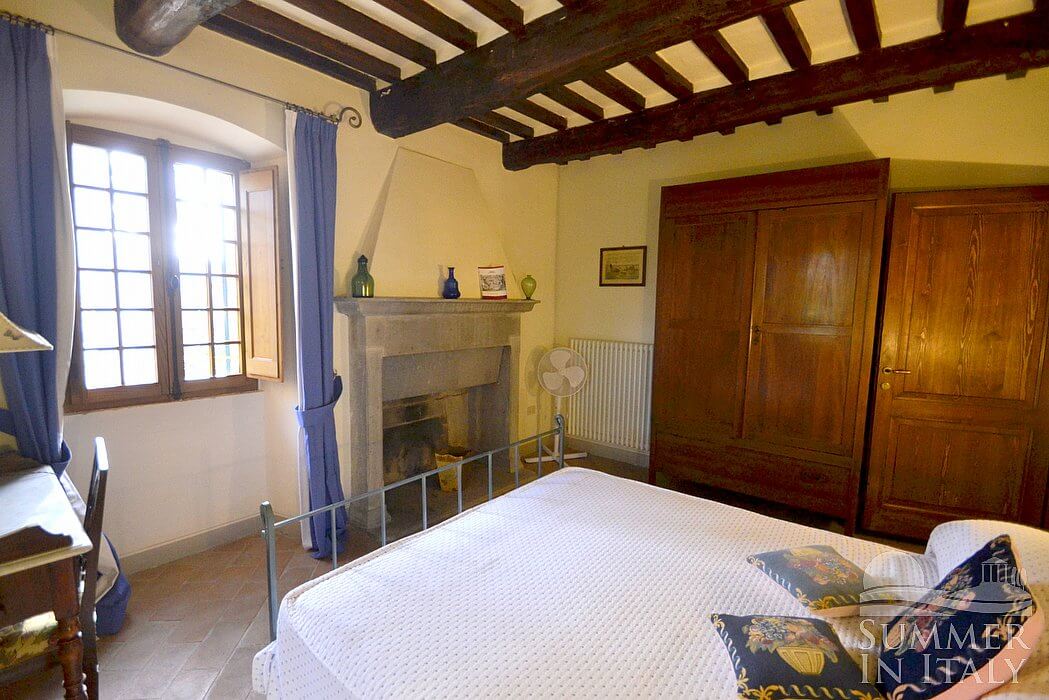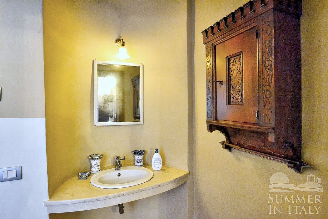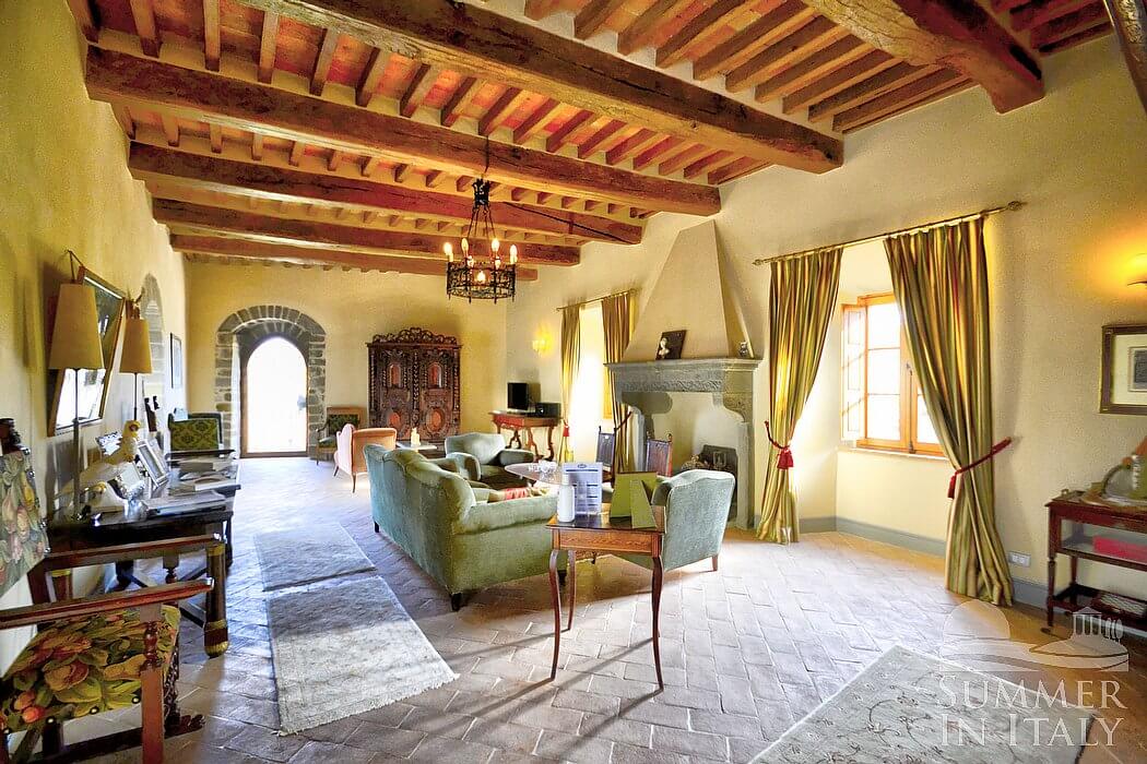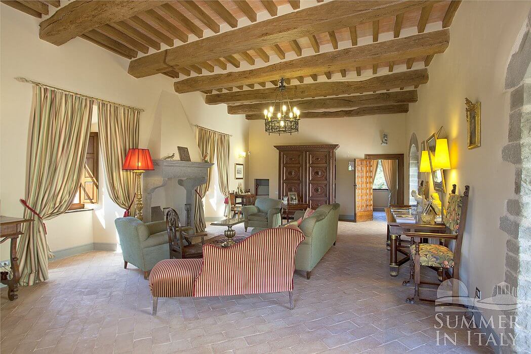 You will be able to enter the second living room through an access area. The floor is paved with original terracotta tiles. The furnishings are elegant and refined, featuring some antique pieces, and include two sofas. There is a big and age-old fireplace, for decorative purposes only. The room has four windows.