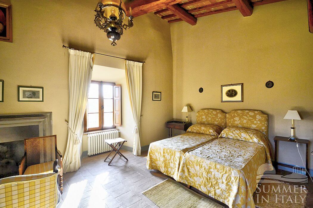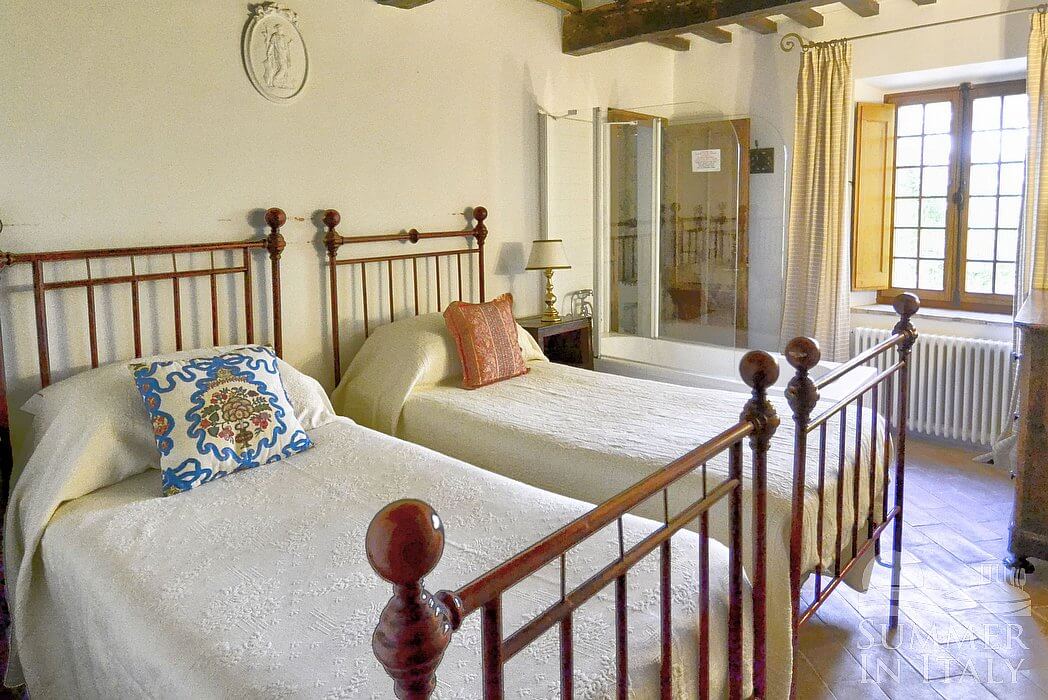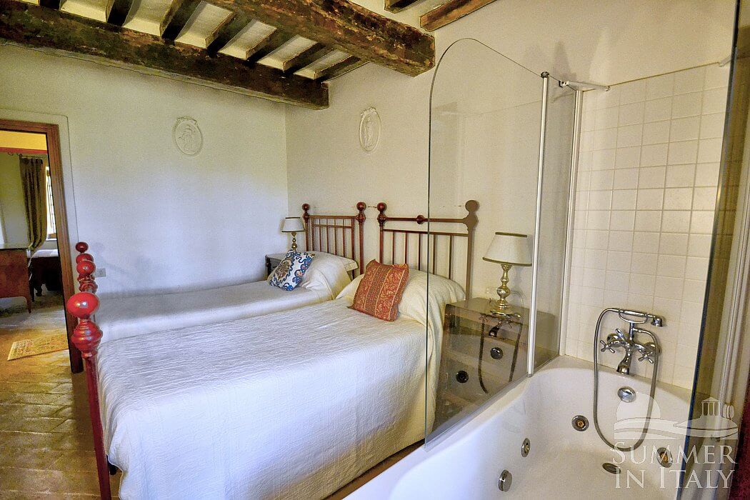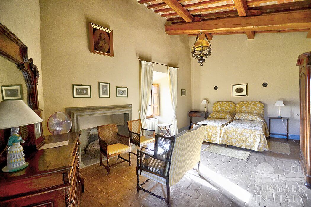 You will be able to enter the eighth bedroom from the corridor climbing three steps. It has two twin beds (80 cm/32 inches). There is a small fireplace, for decorative purposes only. The furnishings include a small sofa. The room has two windows. This bedroom has an en-suite bathroom, equipped with a washbasin, a toilet, a bathtub with fixed shower head and a hairdryer.