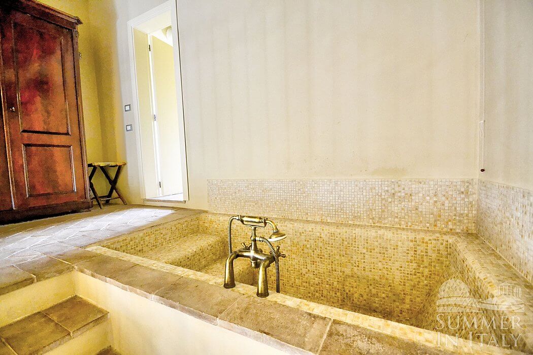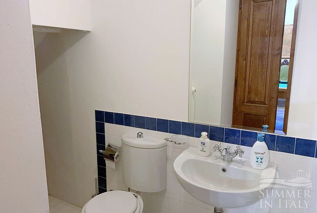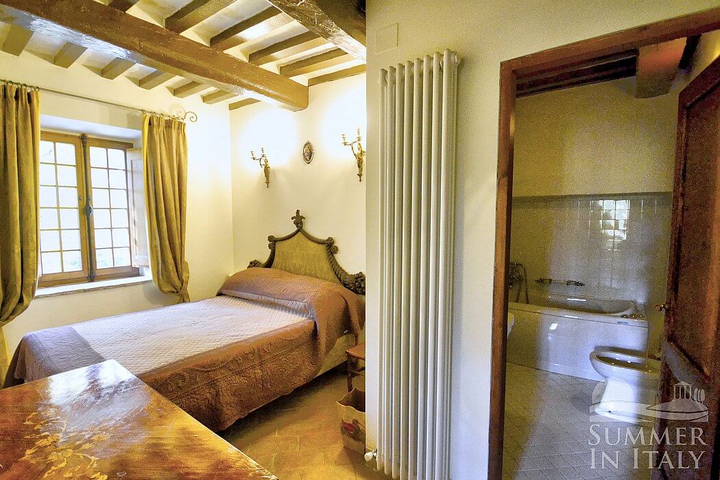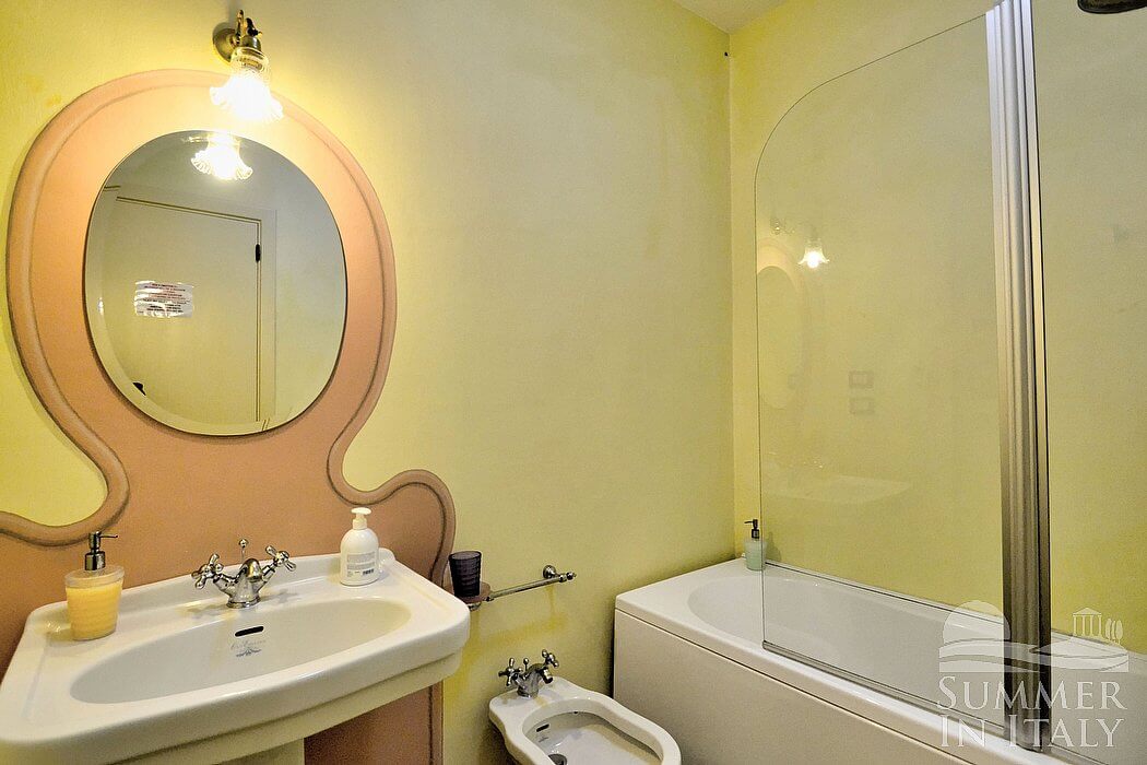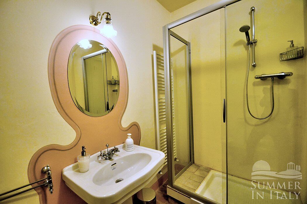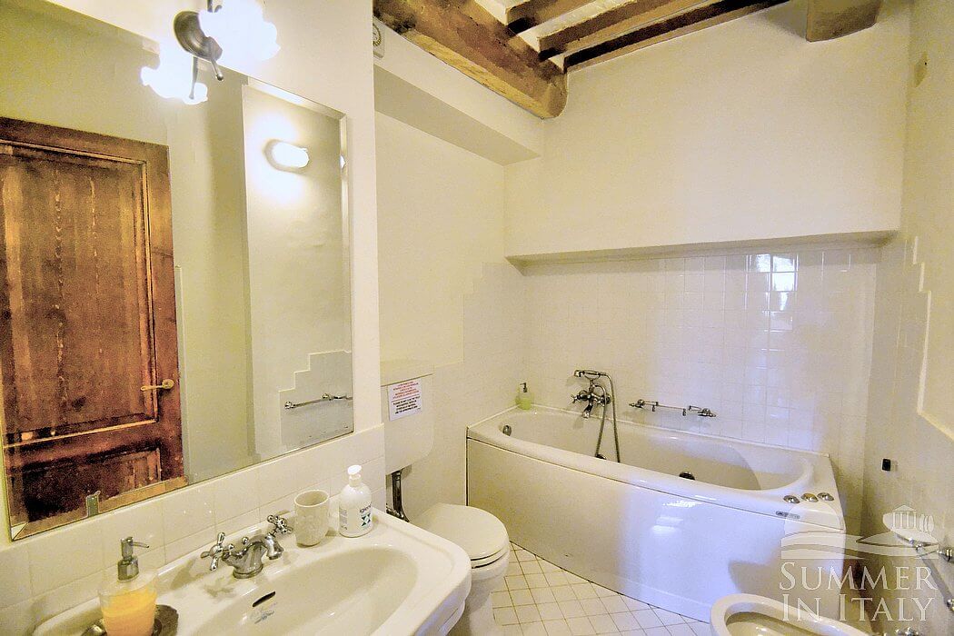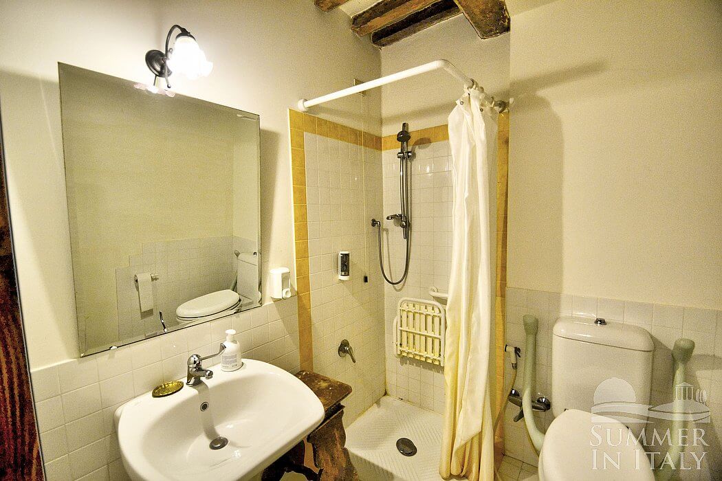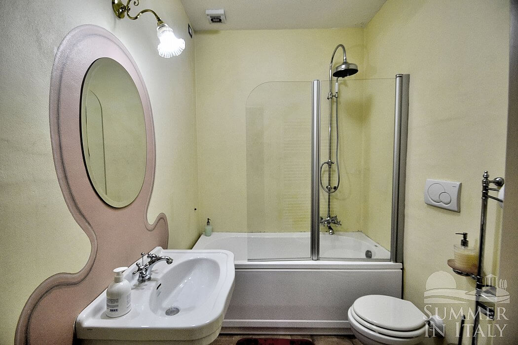 You will be able to enter the seventh bedroom from the corridor climbing three steps. The bedroom has a matrimonial bed (160 cm/63 inches, wider than a queen-size bed). The furnishings include a bedroom chair and a desk. The room has a window. This bedroom has an en-suite bathroom, equipped with a washbasin, a toilet, a bathtub with shower wand and a hairdryer. You will be able to enter the bathroom climbing seven steps and the bathtub is located in the bedroom.