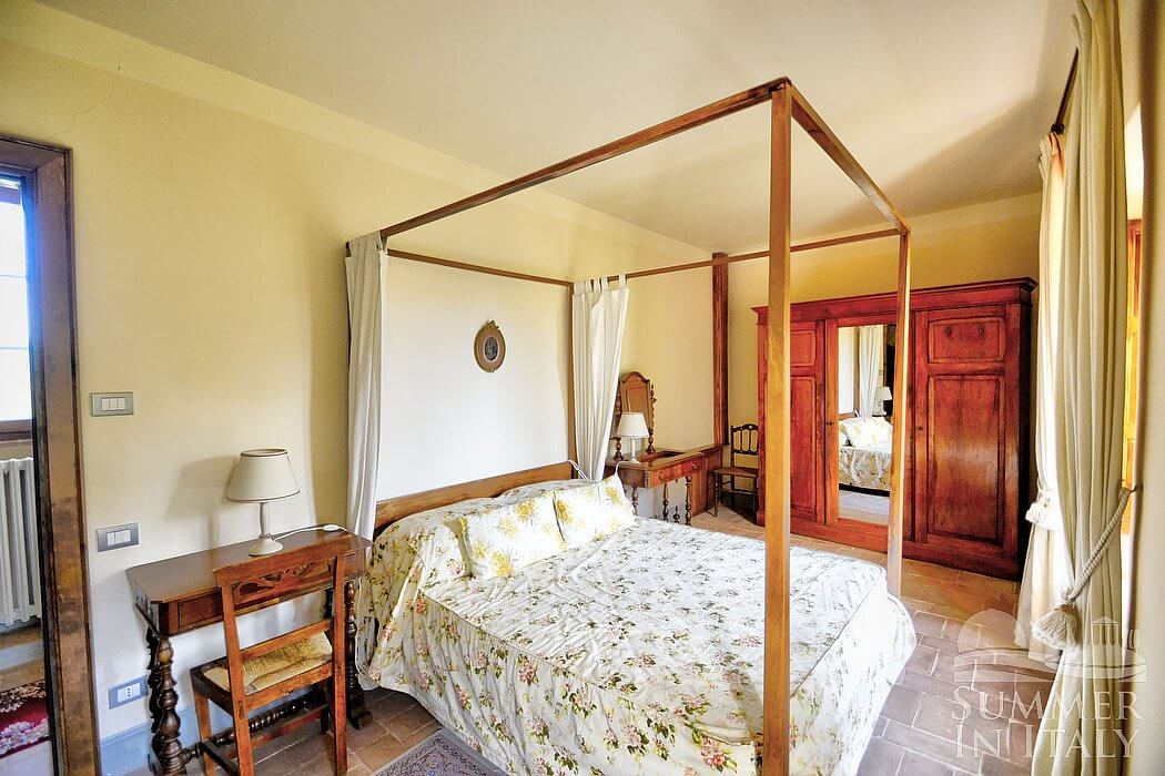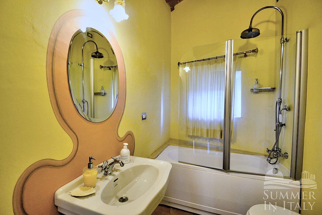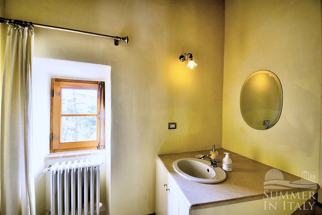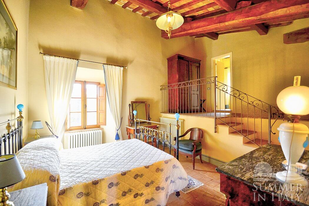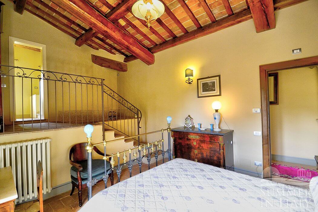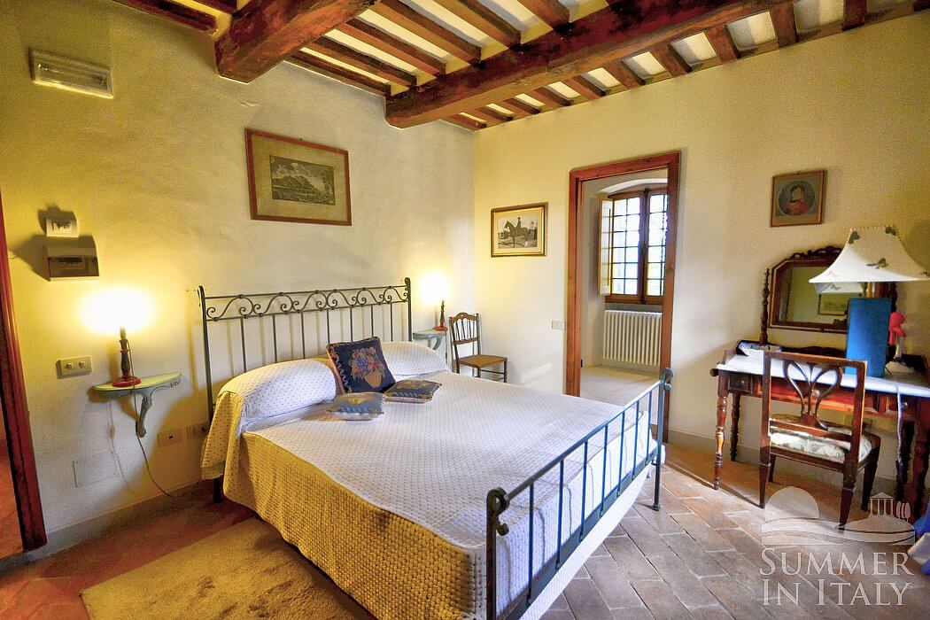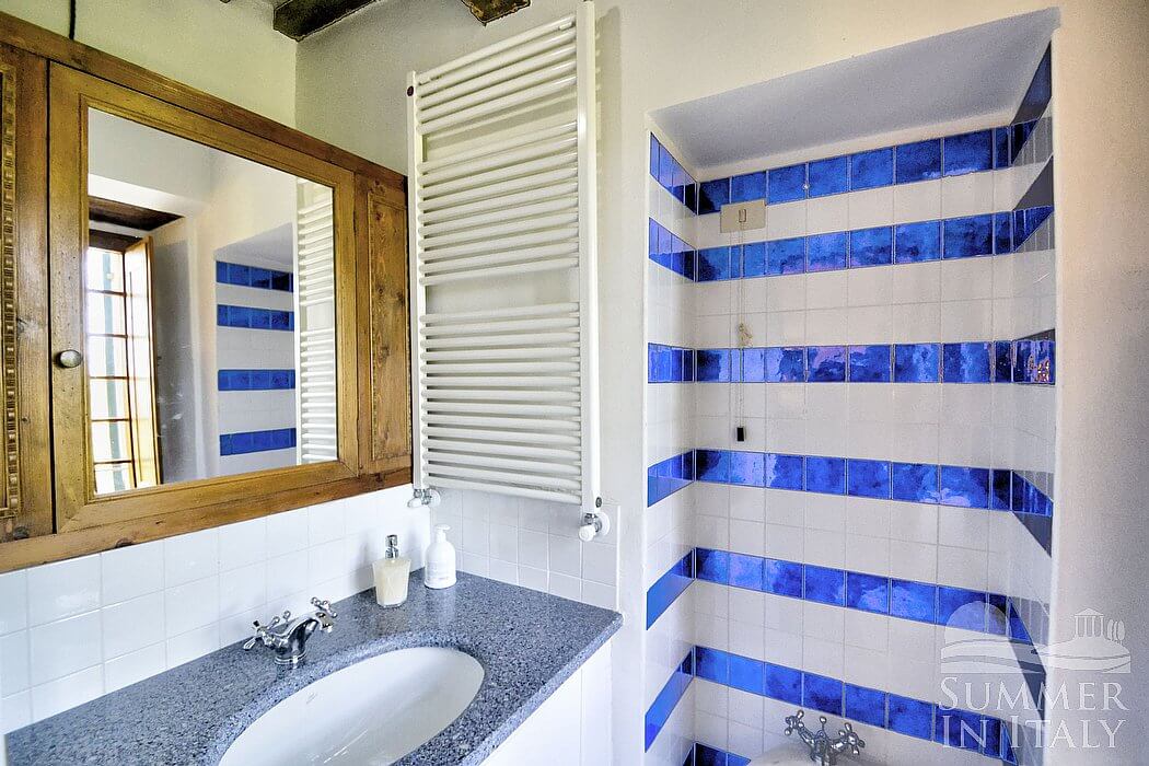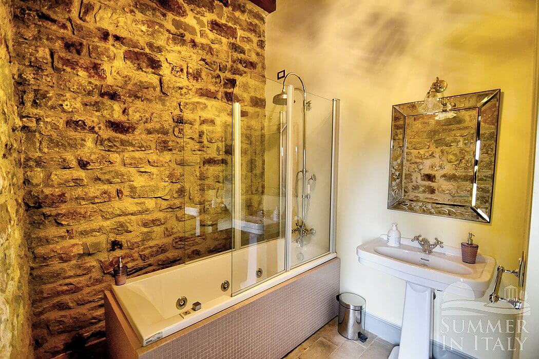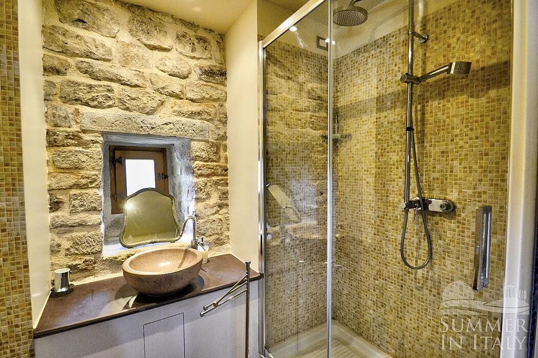 You will be able to enter the seventh bedroom from the corridor climbing three steps. The bedroom has a matrimonial bed (160 cm/63 inches, wider than a queen-size bed). The furnishings include a bedroom chair and a desk. The room has a window. This bedroom has an en-suite bathroom, equipped with a washbasin, a toilet, a bathtub with shower wand and a hairdryer. You will be able to enter the bathroom climbing seven steps and the bathtub is located in the bedroom.