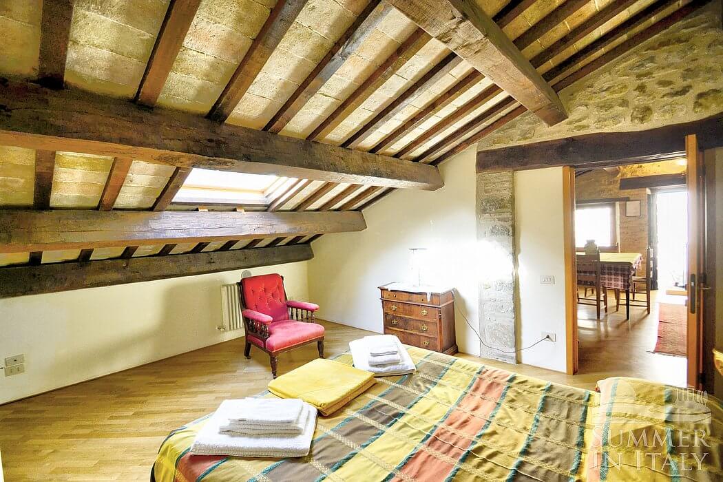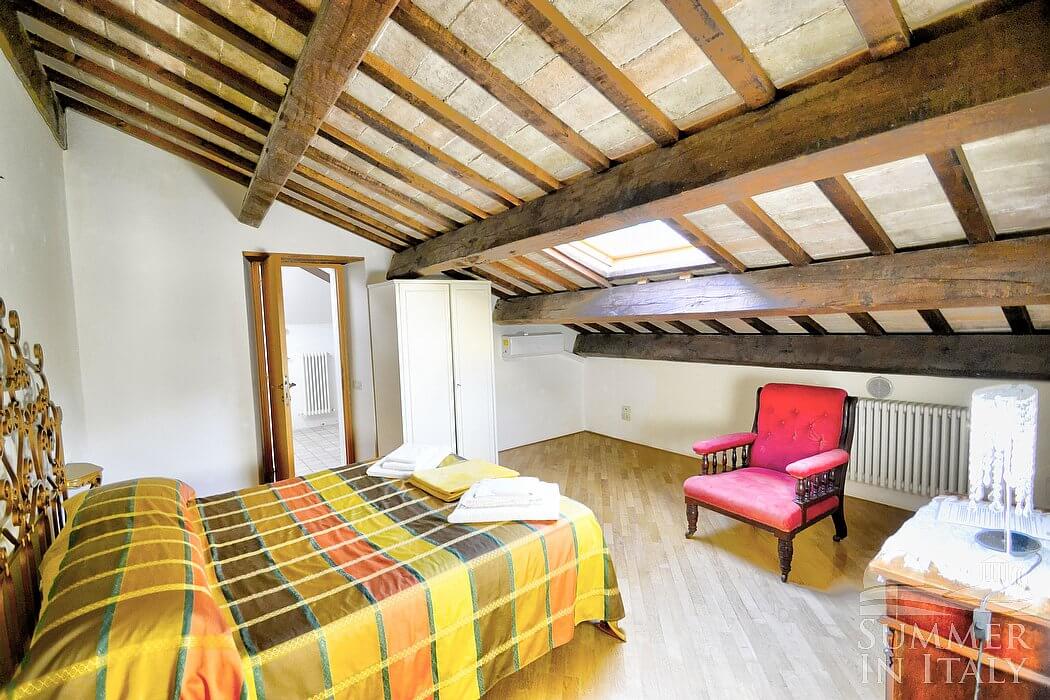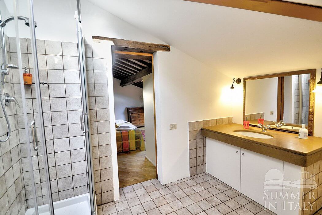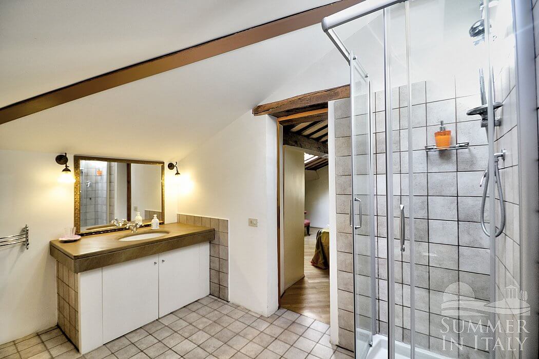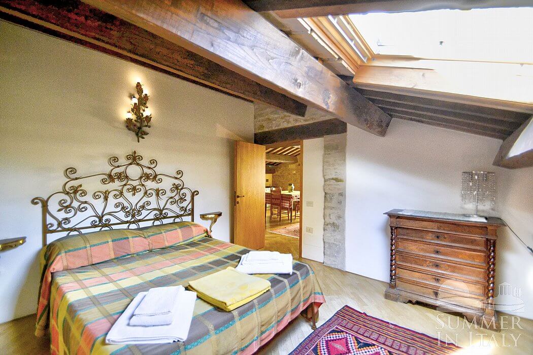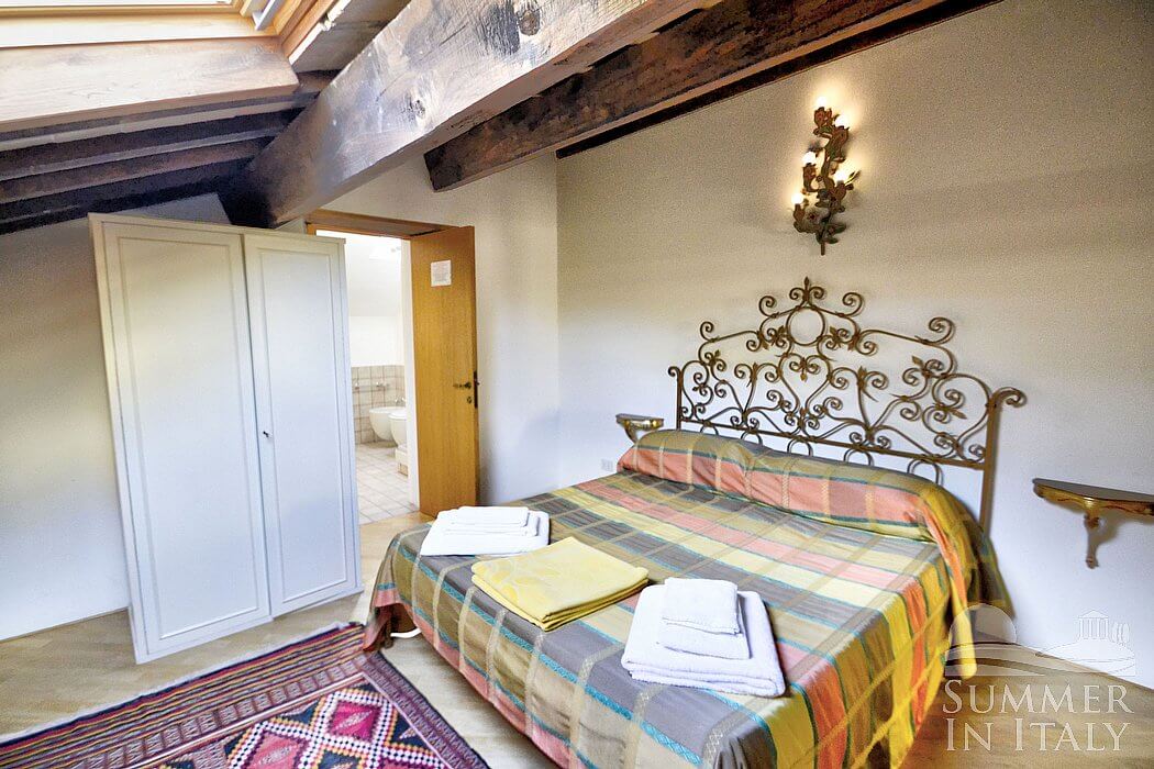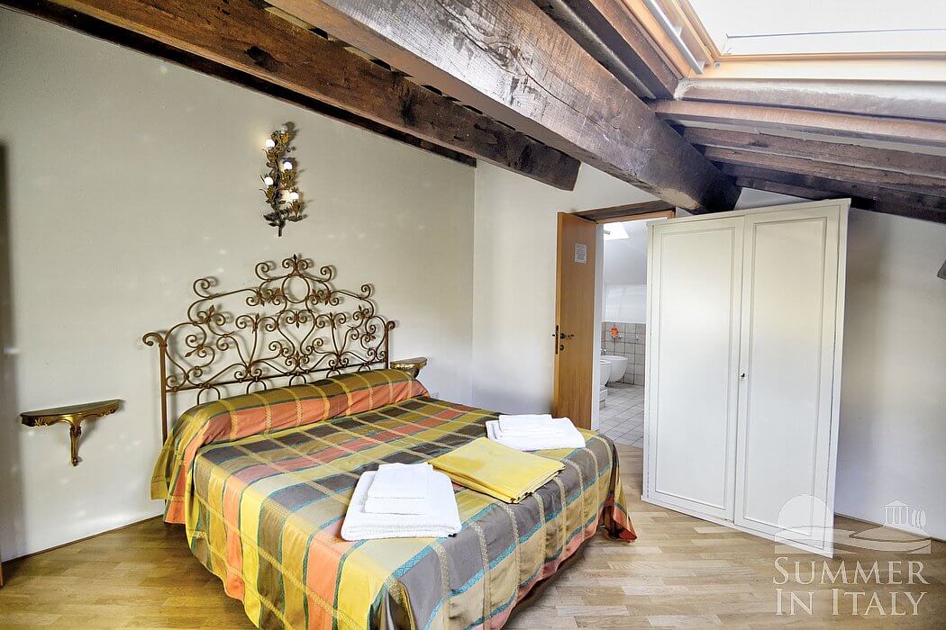 You will be able to enter the fourteenth bedroom from the living room. The ceiling is sloped, has characteristic exposed wood beams and has an height of 70 centimeters (2.3 feet) at its lowest point. The room has a matrimonial bed (160 cm/63 inches, wider than a queen-size bed). The room has a roof window, and it's equipped with an air conditioning/heating unit. This bedroom has an en-suite bathroom, equipped with a washbasin, a toilet, a fully enclosed shower and a hairdryer.
