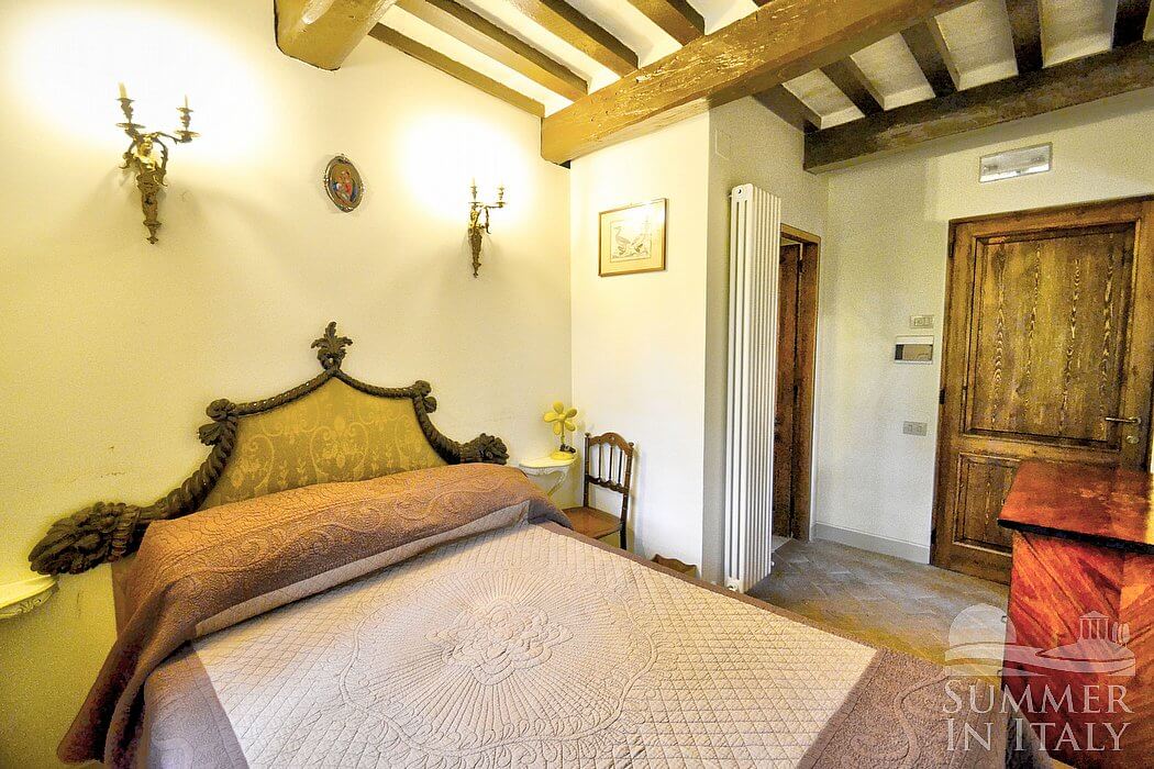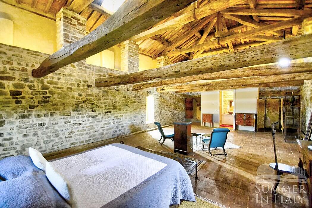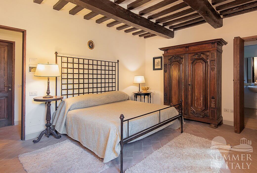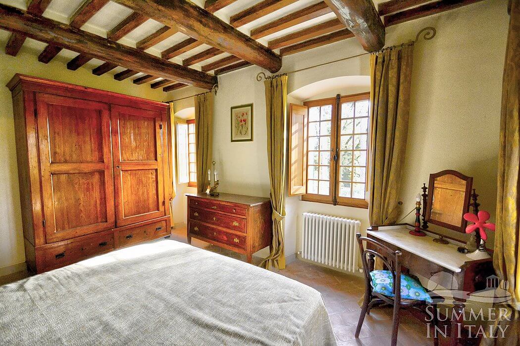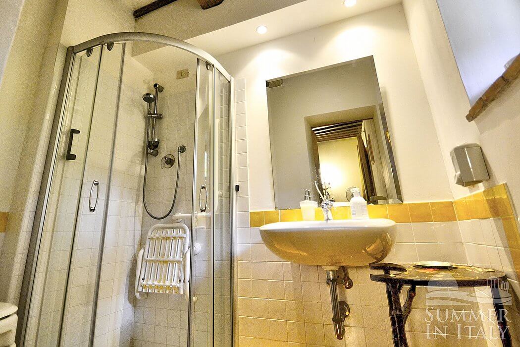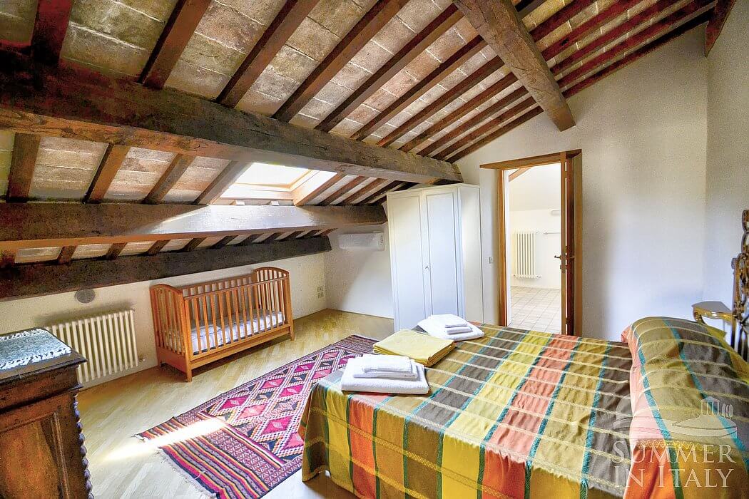 You will be able to enter the fourteenth bedroom from the living room. The ceiling is sloped, has characteristic exposed wood beams and has an height of 70 centimeters (2.3 feet) at its lowest point. The room has a matrimonial bed (160 cm/63 inches, wider than a queen-size bed). The room has a roof window, and it's equipped with an air conditioning/heating unit. This bedroom has an en-suite bathroom, equipped with a washbasin, a toilet, a fully enclosed shower and a hairdryer.