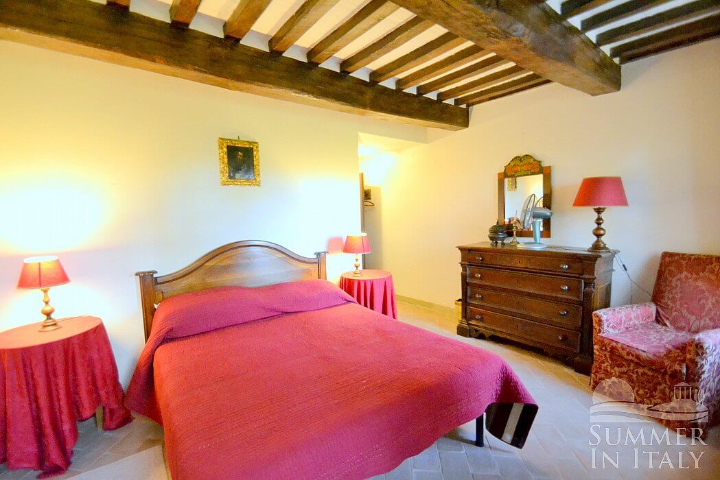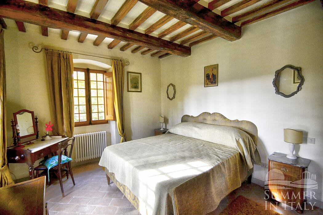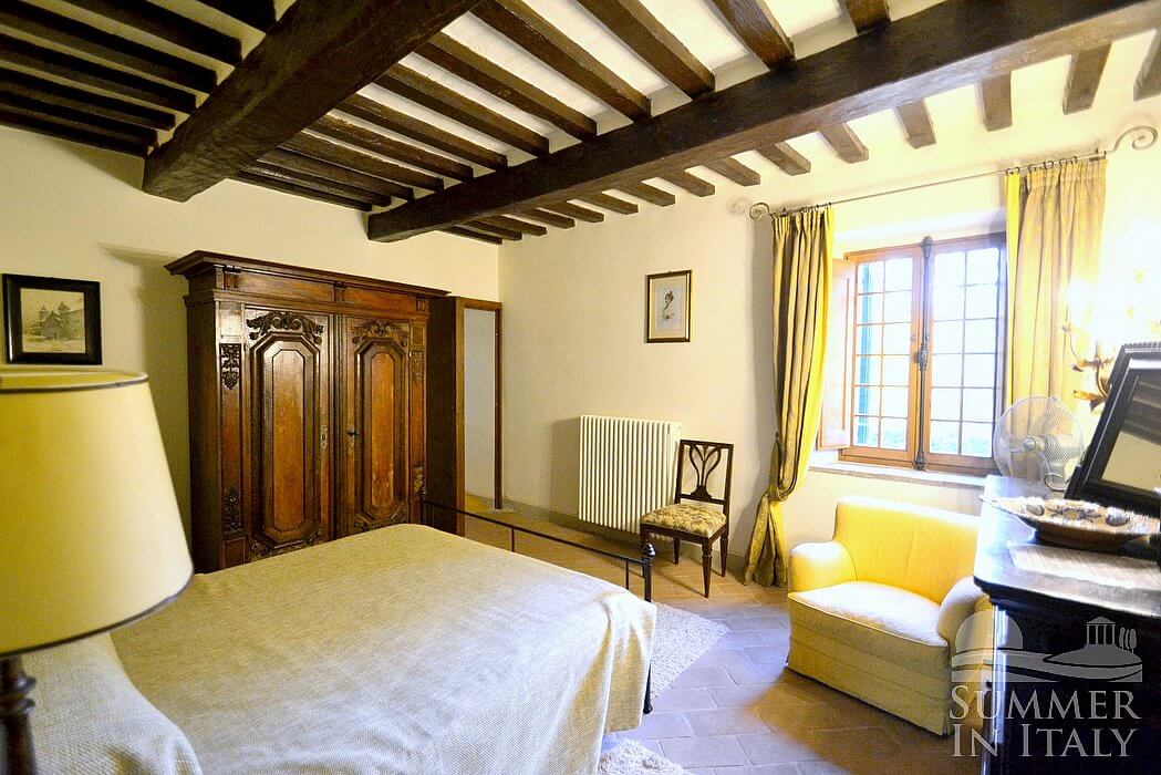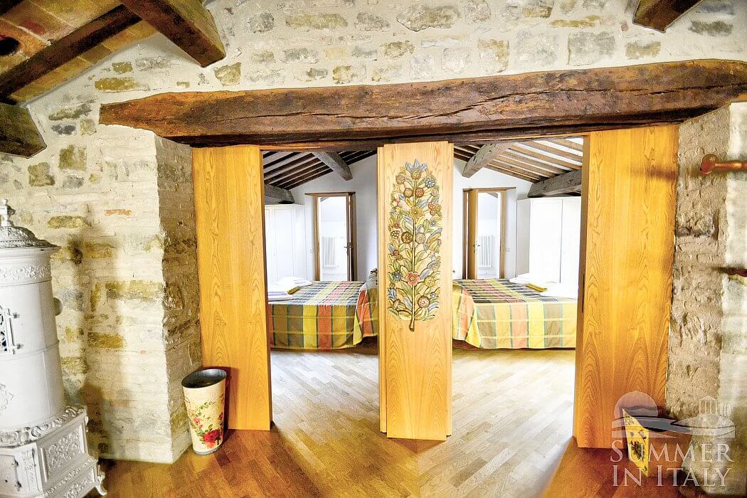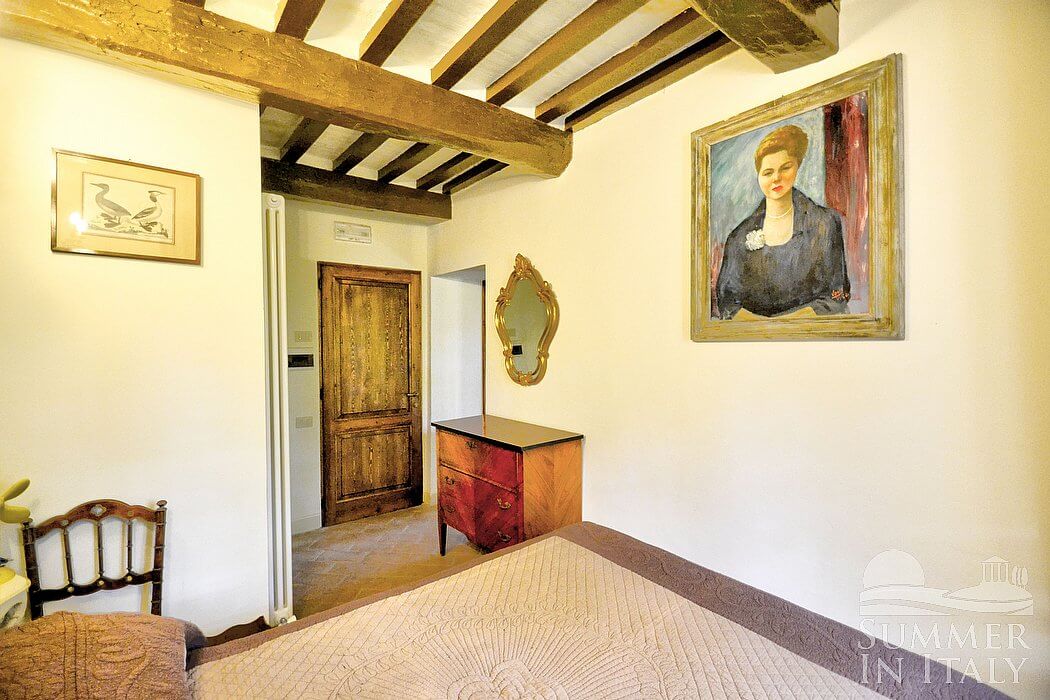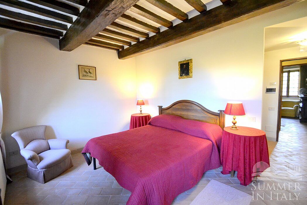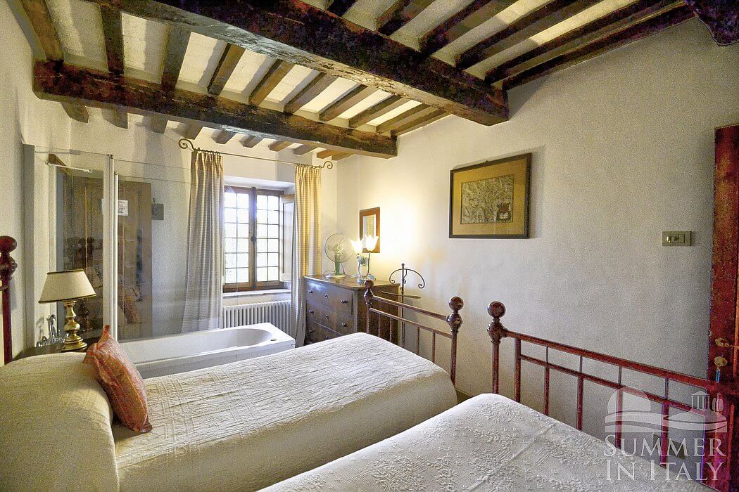 You will be able to enter the fourteenth bedroom from the living room. The ceiling is sloped, has characteristic exposed wood beams and has an height of 70 centimeters (2.3 feet) at its lowest point. The room has a matrimonial bed (160 cm/63 inches, wider than a queen-size bed). The room has a roof window, and it's equipped with an air conditioning/heating unit. This bedroom has an en-suite bathroom, equipped with a washbasin, a toilet, a fully enclosed shower and a hairdryer.