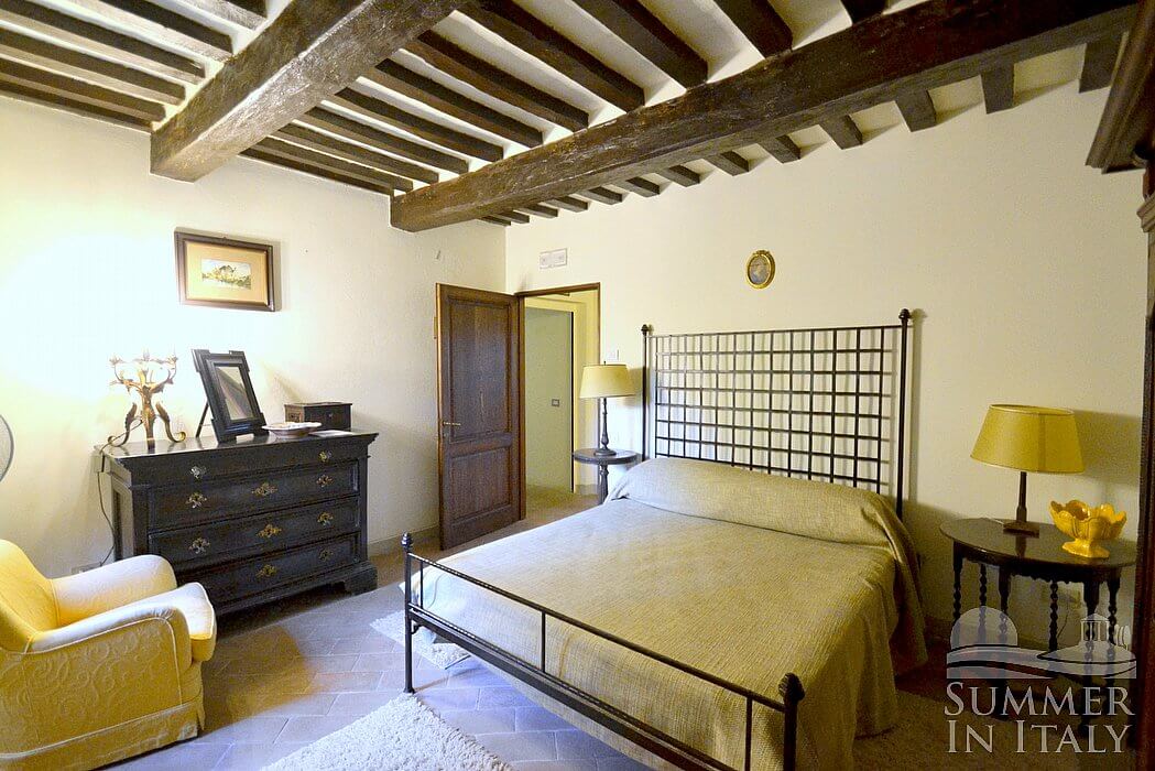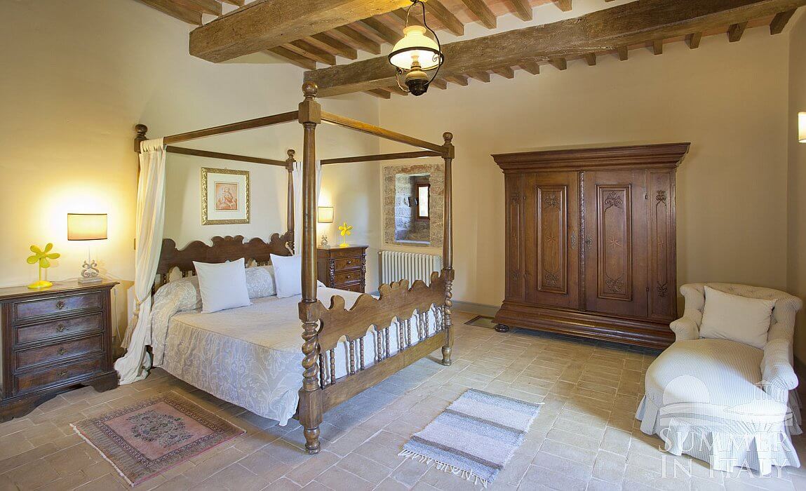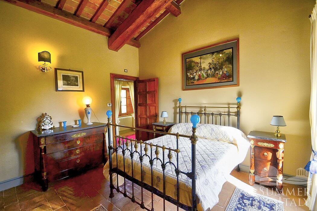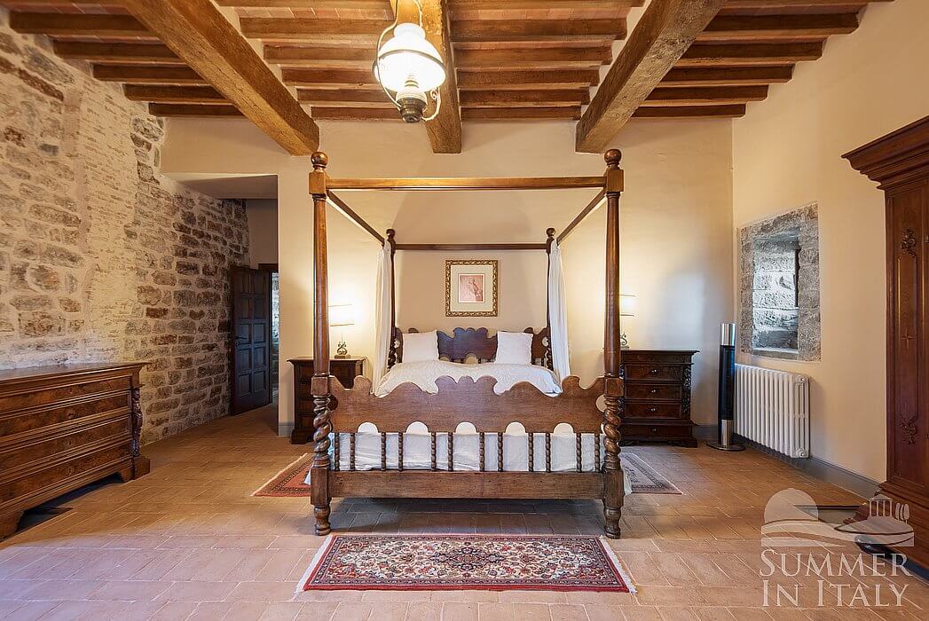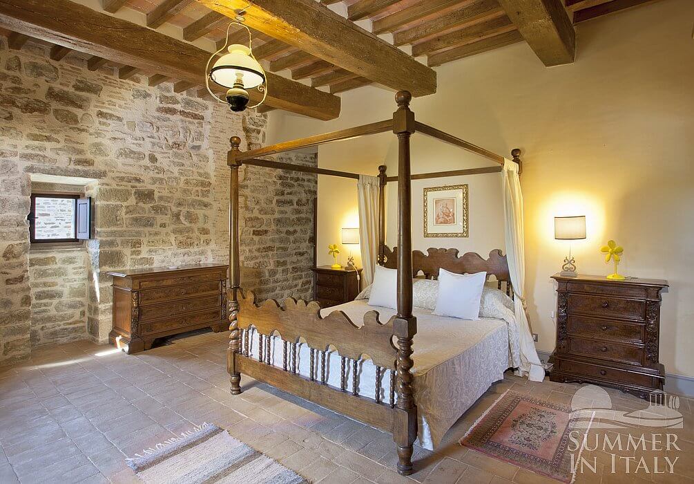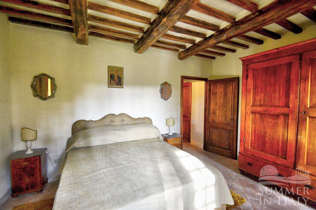 You will be able to enter the fourteenth bedroom from the living room. The ceiling is sloped, has characteristic exposed wood beams and has an height of 70 centimeters (2.3 feet) at its lowest point. The room has a matrimonial bed (160 cm/63 inches, wider than a queen-size bed). The room has a roof window, and it's equipped with an air conditioning/heating unit. This bedroom has an en-suite bathroom, equipped with a washbasin, a toilet, a fully enclosed shower and a hairdryer.