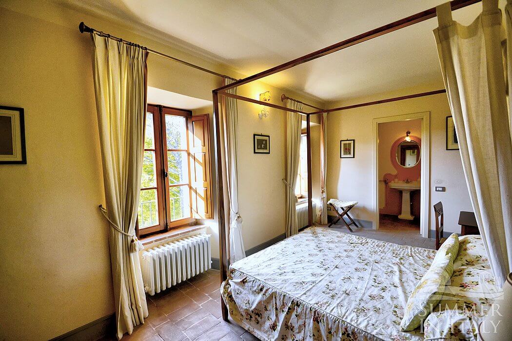 You will be able to enter the sixth bedroom through a corridor. The bedroom has a matrimonial bed (160 cm/63 inches, wider than a queen-size bed). The furnishings include two armchairs. The room has two windows. This bedroom has an en-suite bathroom, equipped with a washbasin, a toilet, a shower and a hairdryer.