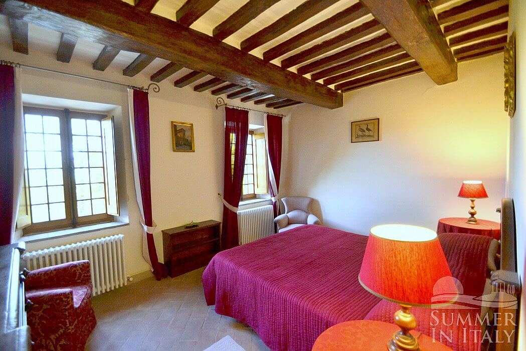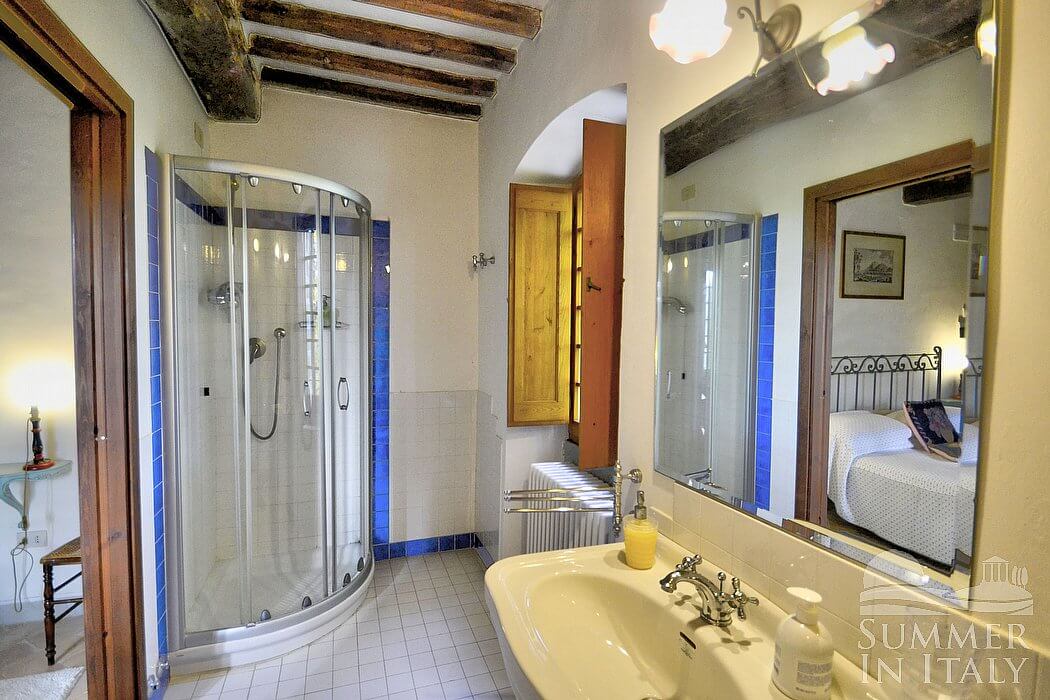You will be able to enter the ninth bedroom from the corridor climbing three steps. The bedroom has a matrimonial bed (160 cm/63 inches, wider than a queen-size bed). The furnishings include a desk. The room has two windows. This bedroom has an en-suite bathroom, equipped with a washbasin, a toilet, a fully enclosed shower and a hairdryer.